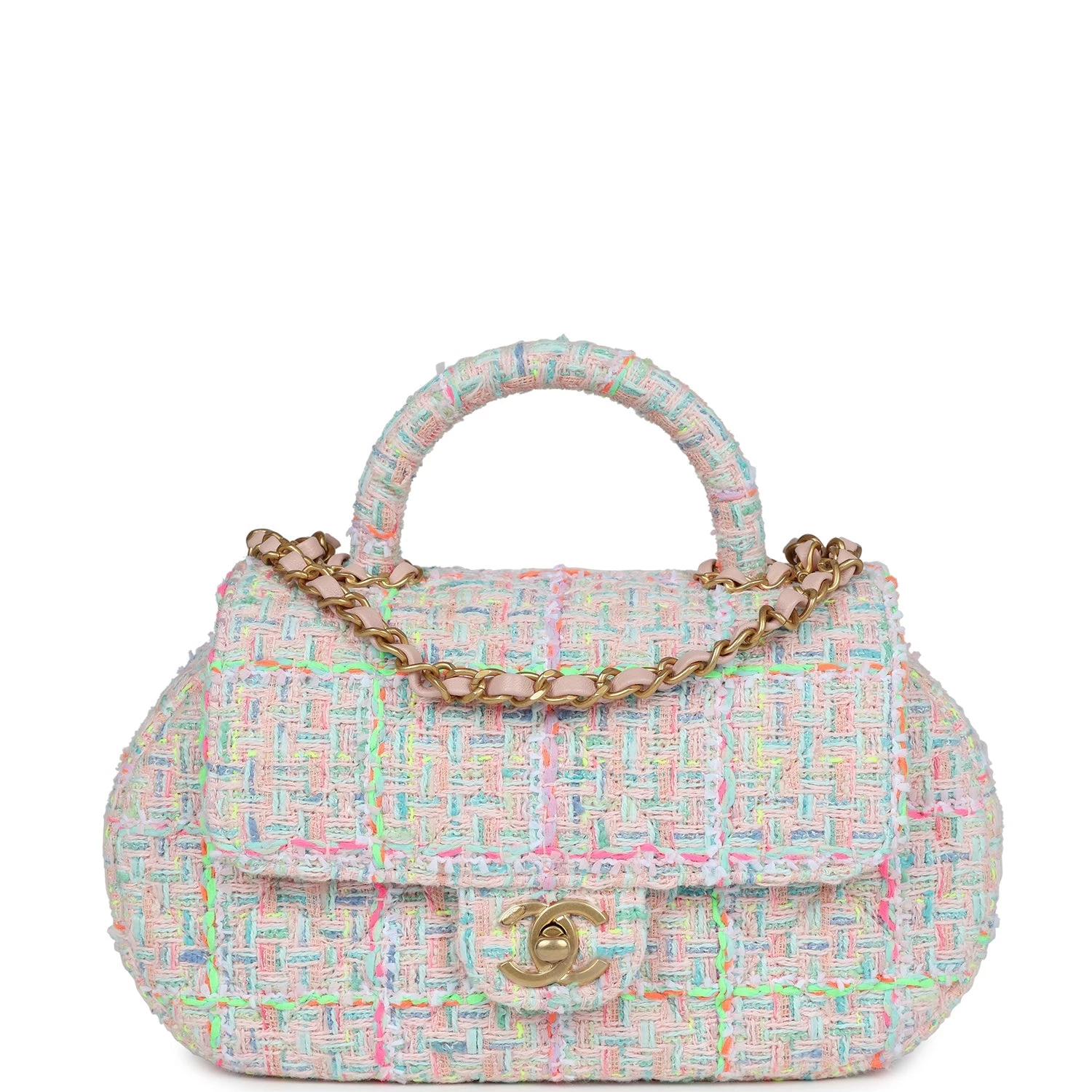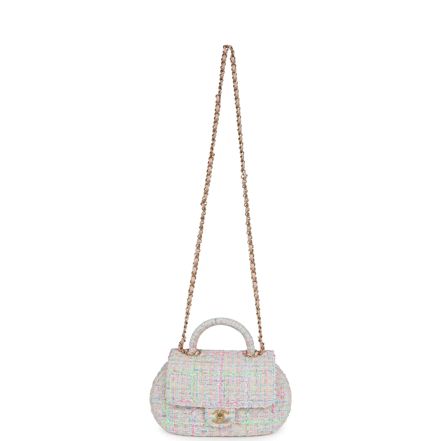 This Mini flap bag is in multicolor tweed with antique gold tone hardware and has a front flap with signature CC turnlock closure, a round shape structure, CC turnlock closure, one single rolled tweed handle and interwoven beige leather and antique gold tone chainlink crossbody/shoulder strap.