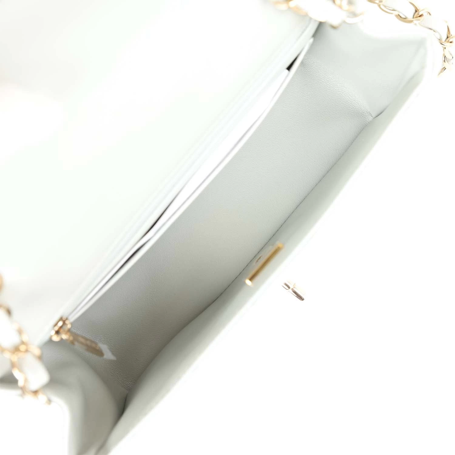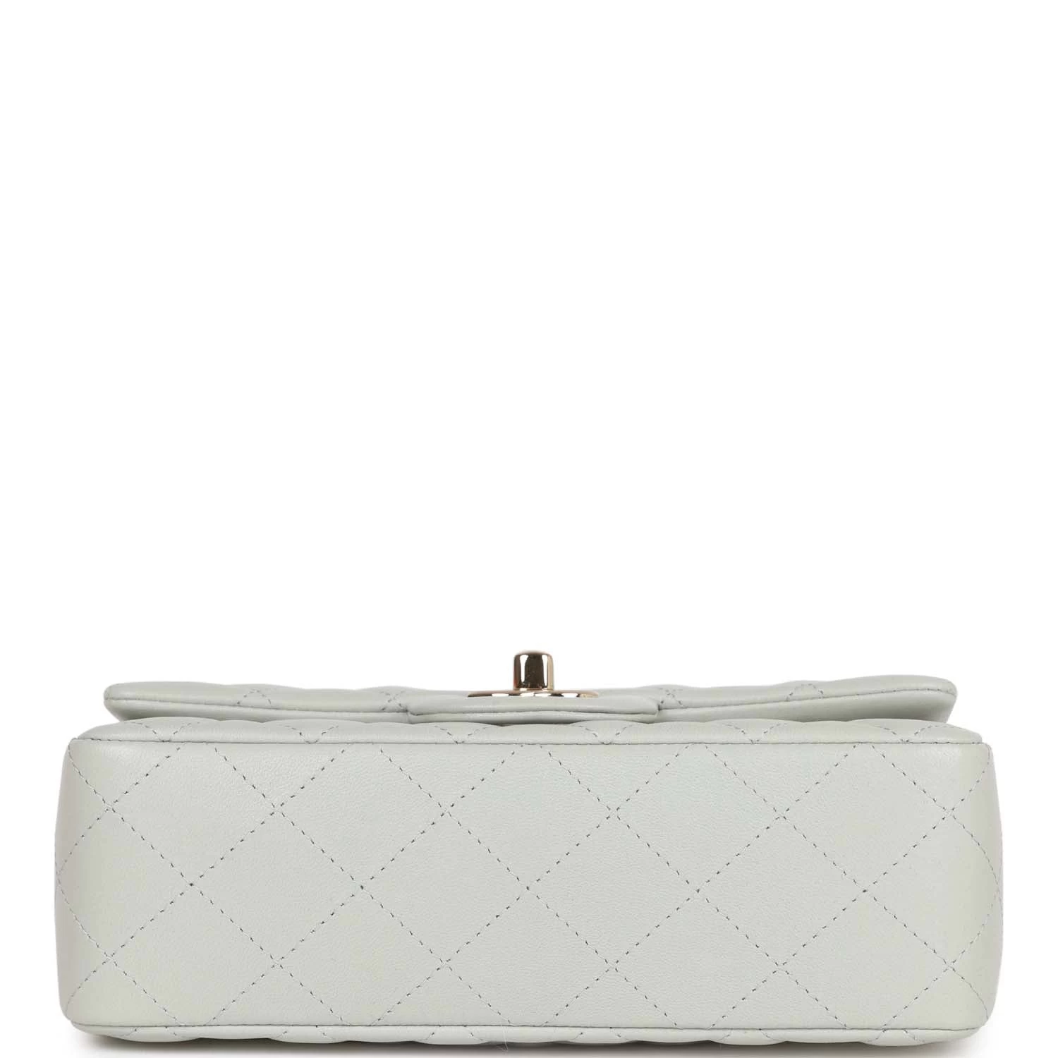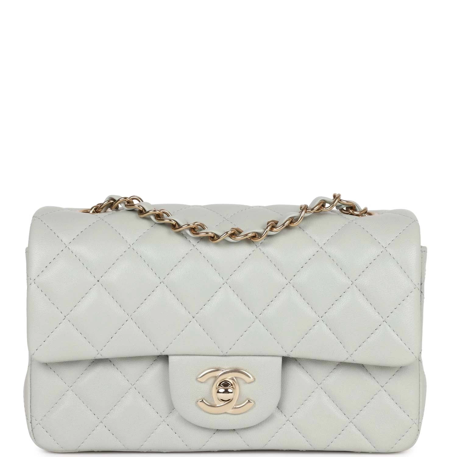 This Rectangular Mini Flapbag is of Light Grey lambskin with light gold hardware, a front flap with CC turnlock closure, half moon back pocket and interwoven light gold tone chain link and Light Grey leather crossbody strap.
