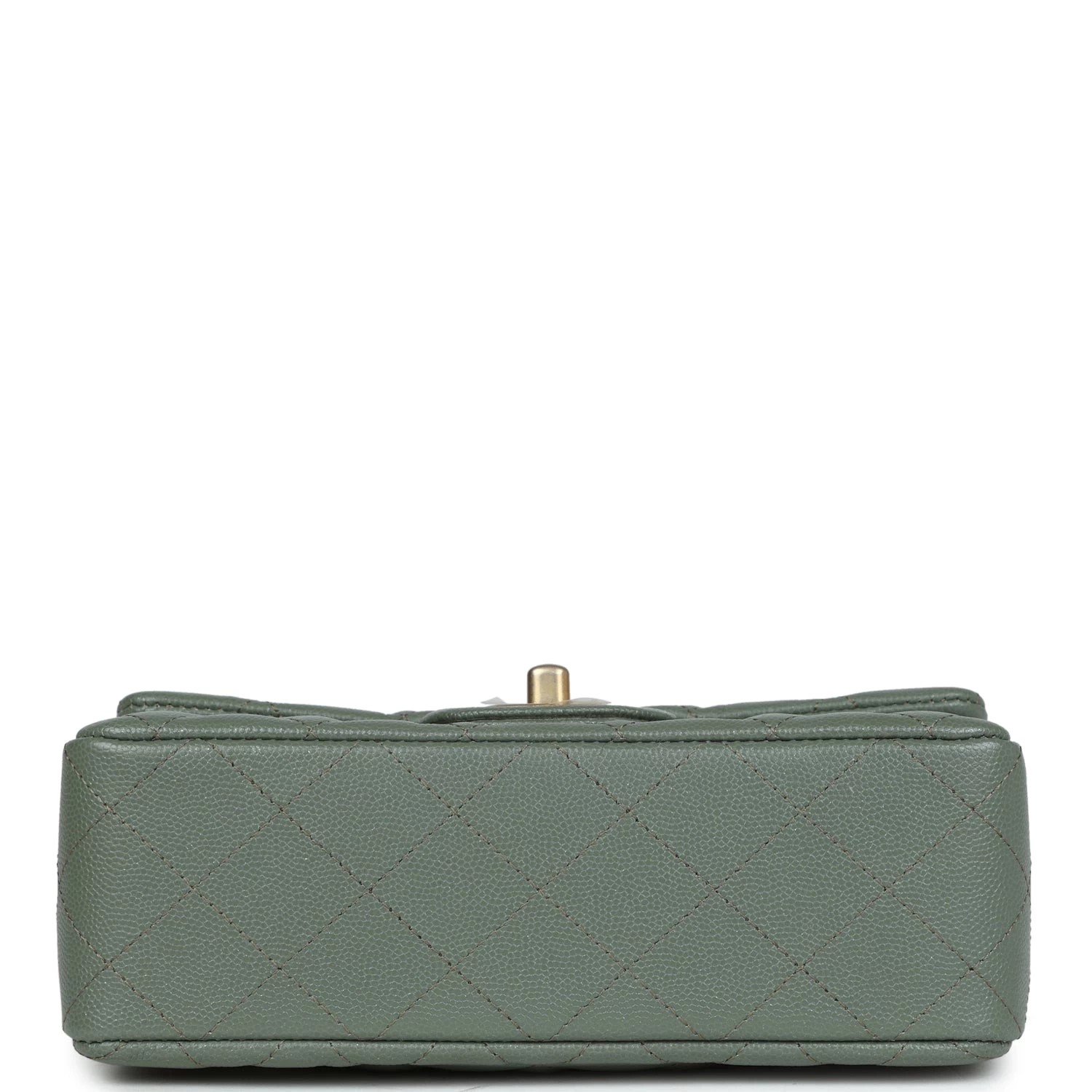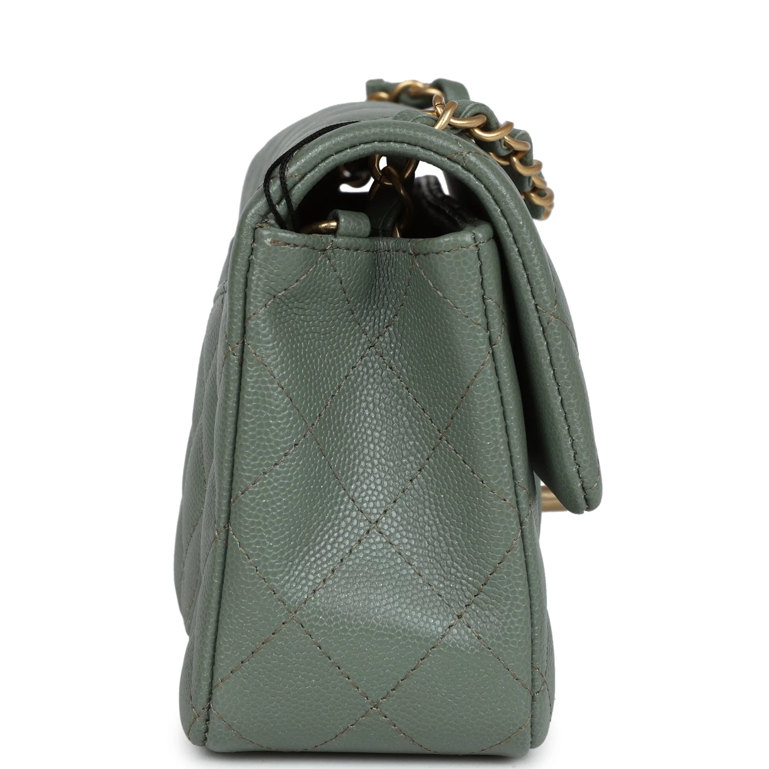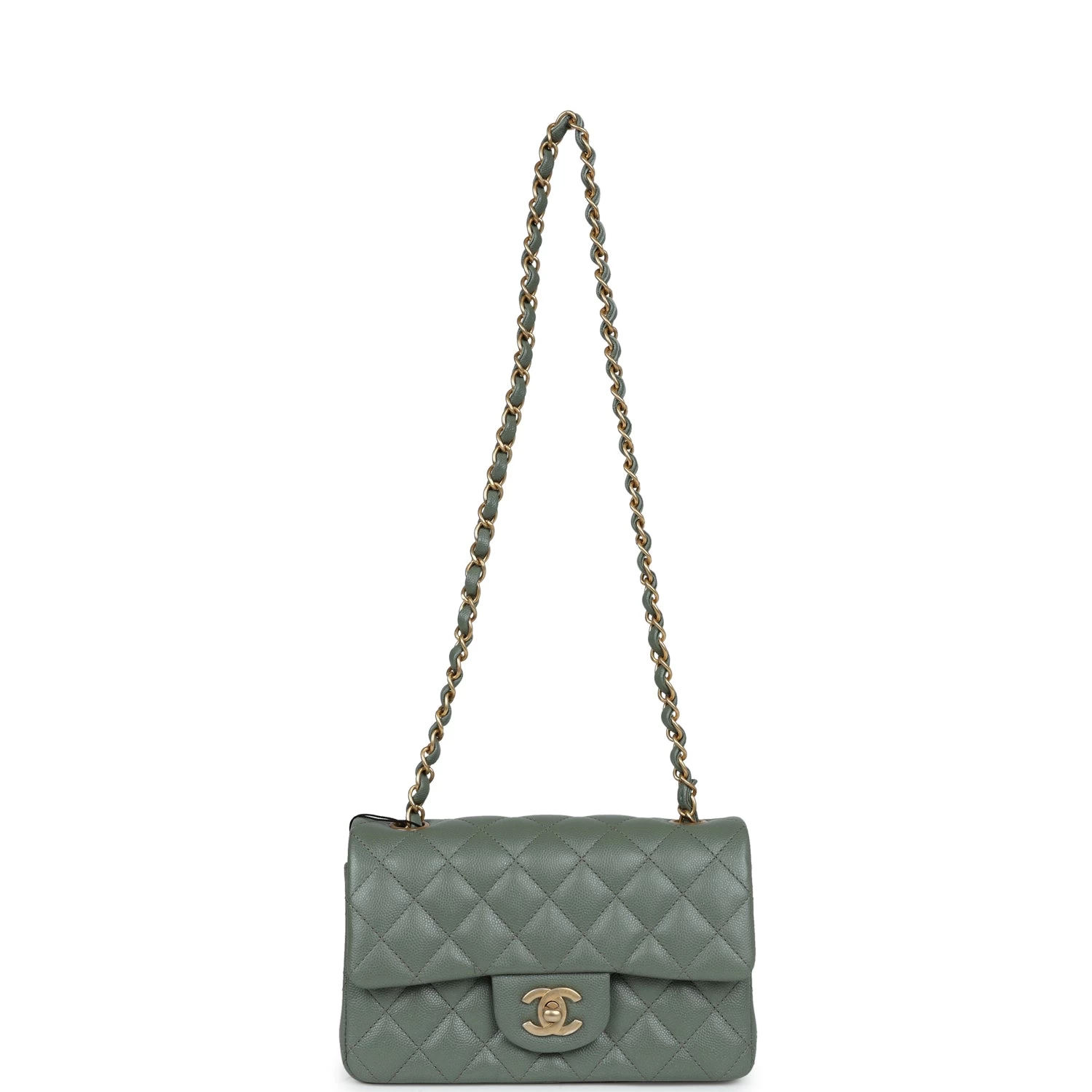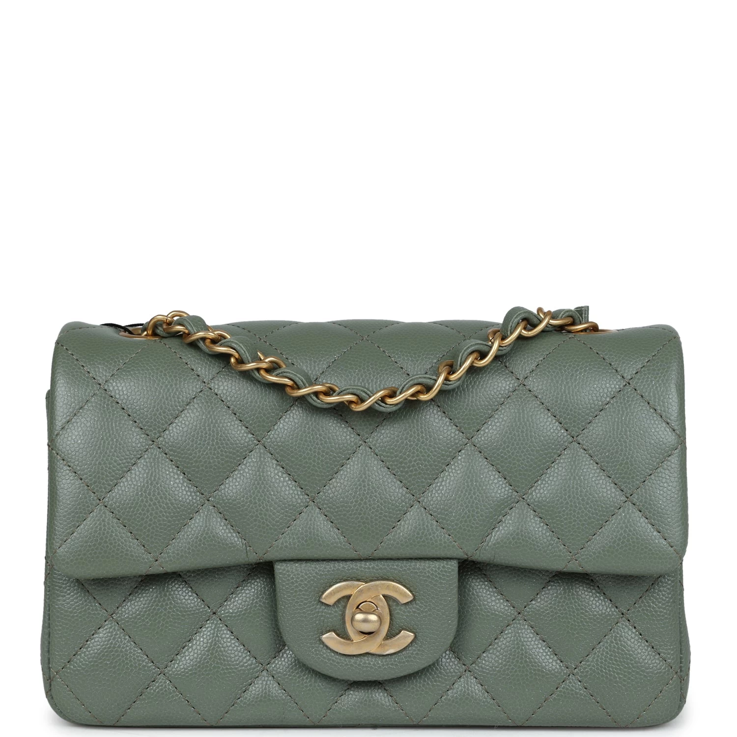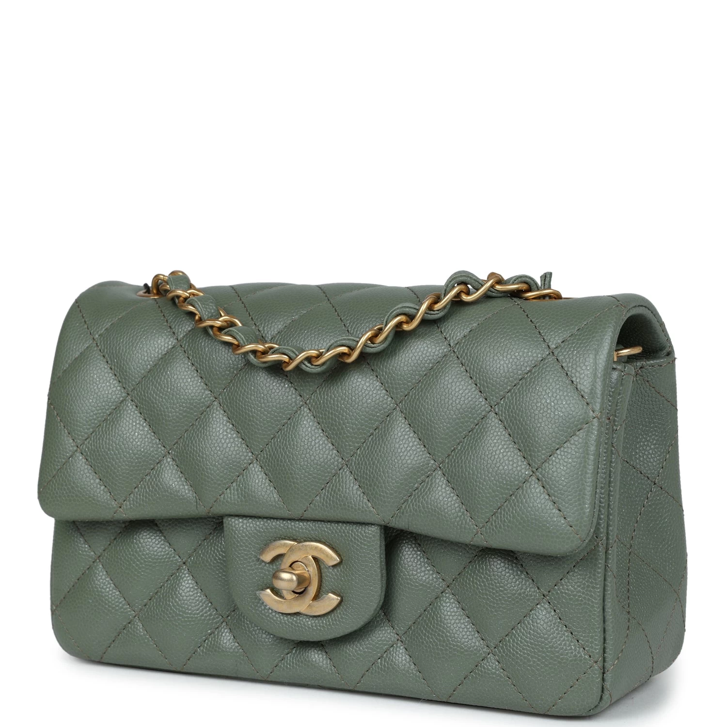 This Mini Rectangular flap bag is in olive caviar with antique gold tone hardware and has a front flap with signature CC turnlock closure, rear half moon pocket and single interwoven olive leather and antique gold tone chain link shoulder/crossbody strap.