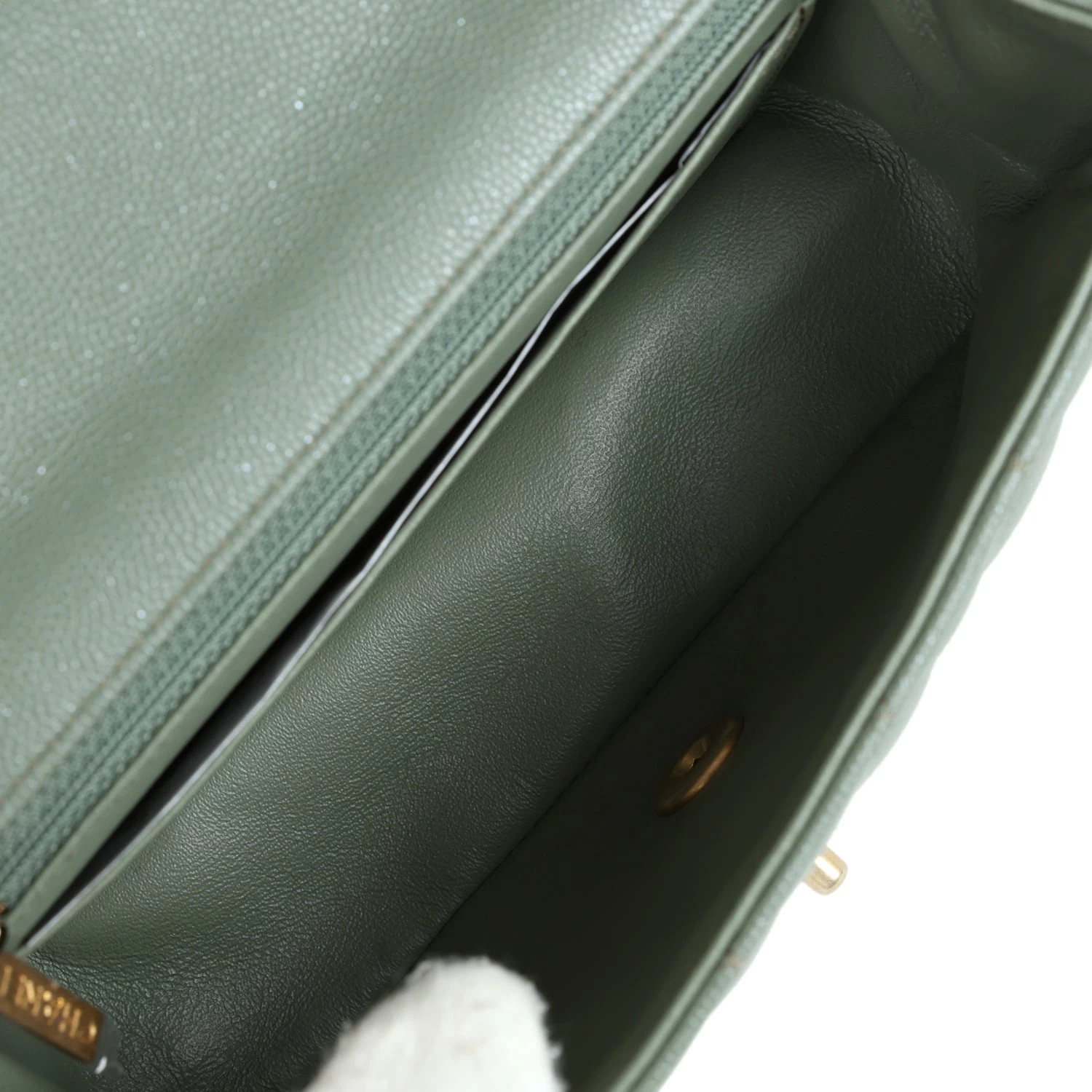 The interior is lined in olive leather and features a zipper pocket with Chanel pull and an open pocket below.