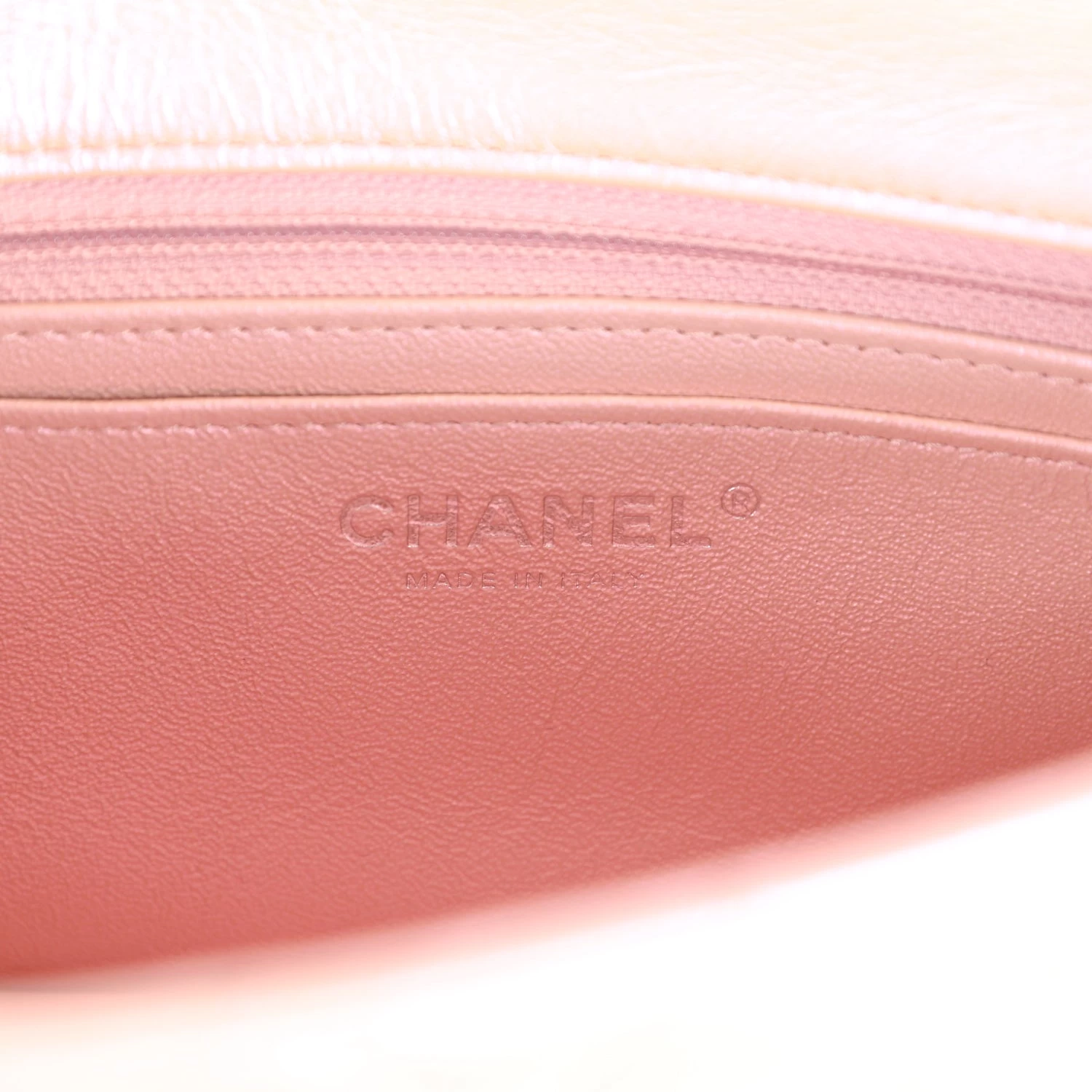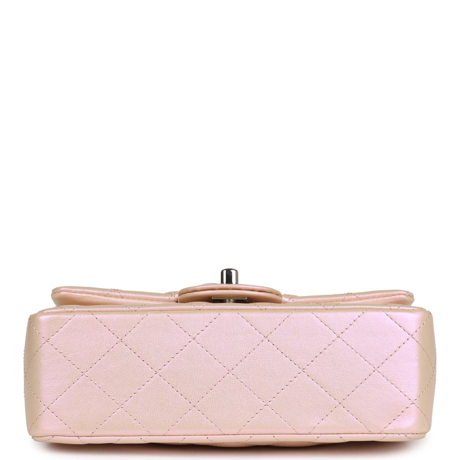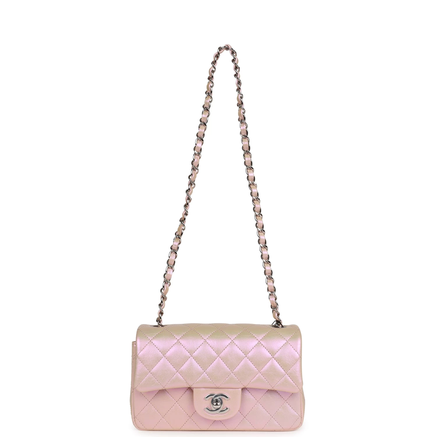 This Mini Rectangular flap bag is in pink iridescent calfskin with silver tone hardware and has a front flap with signature CC turnlock closure, rear half moon pocket and single interwoven pink leather and silver tone chain link shoulder/crossbody strap.