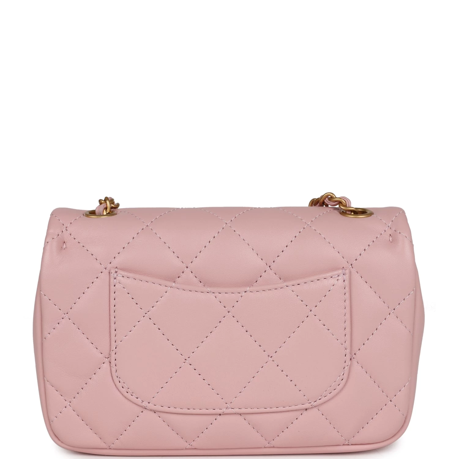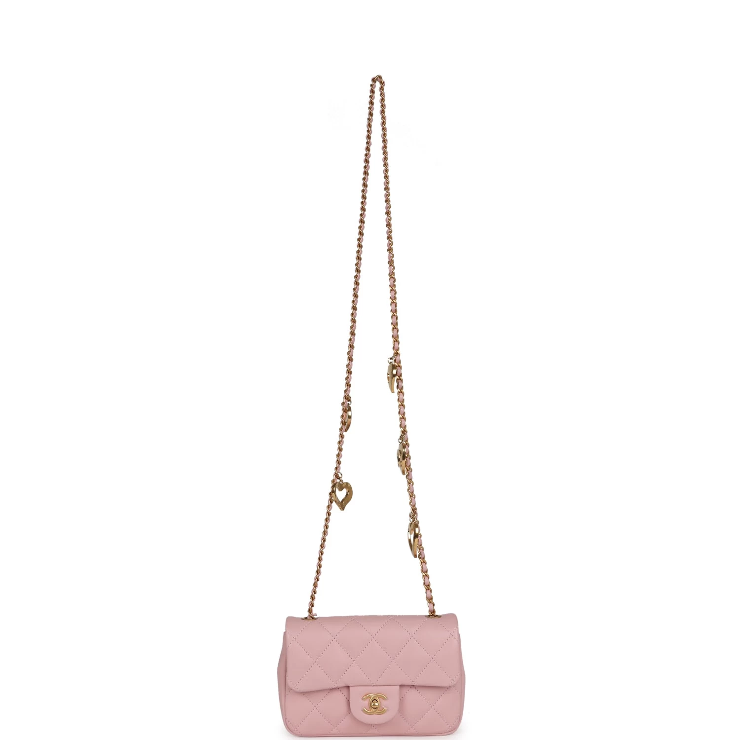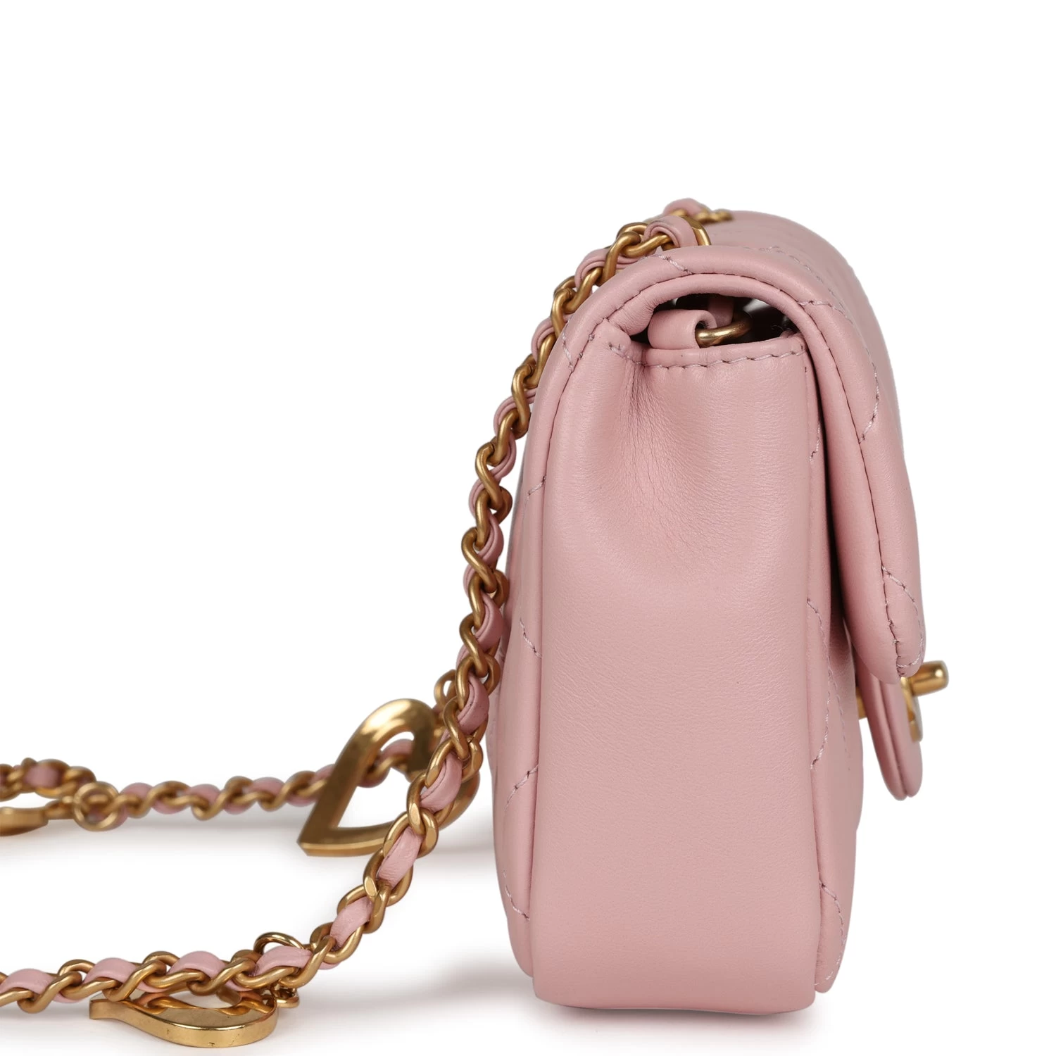 This Mini Rectangular flap bag is of pink lambskin leather with antique gold tone hardware and has a front flap with signature CC turnlock closure, rear half moon pocket, single interwoven rose leather and antique gold tone chain link shoulder/crossbody strap with heart charms.