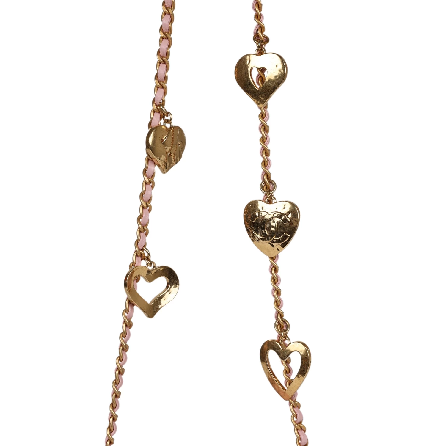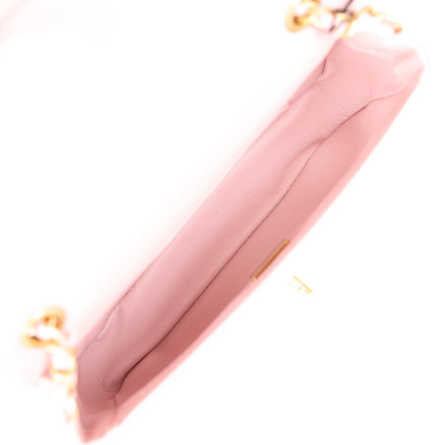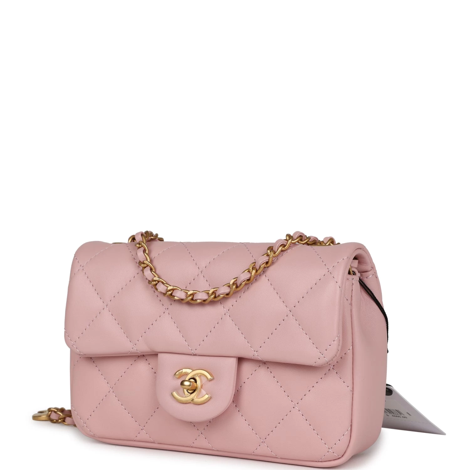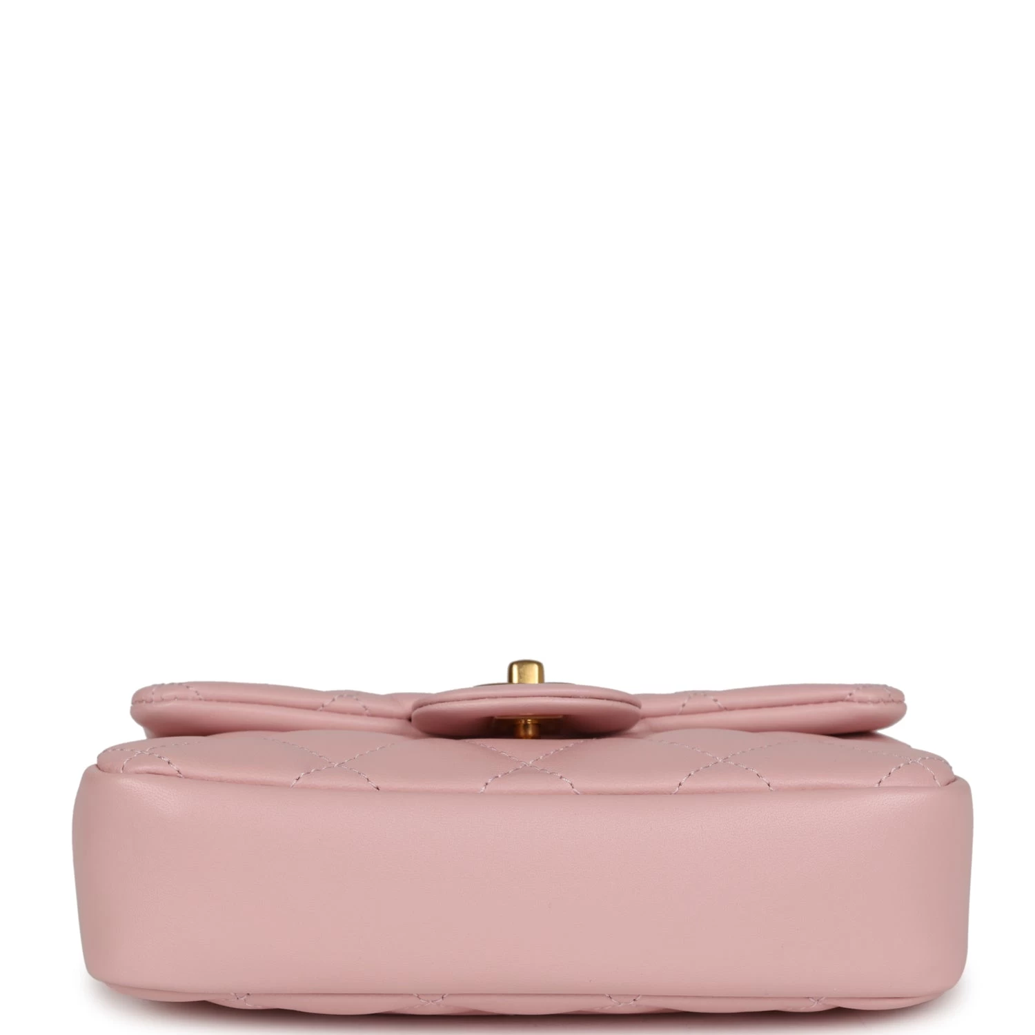 This Mini Rectangular flap bag is of pink lambskin leather with antique gold tone hardware and has a front flap with signature CC turnlock closure, rear half moon pocket, single interwoven rose leather and antique gold tone chain link shoulder/crossbody strap with heart charms.