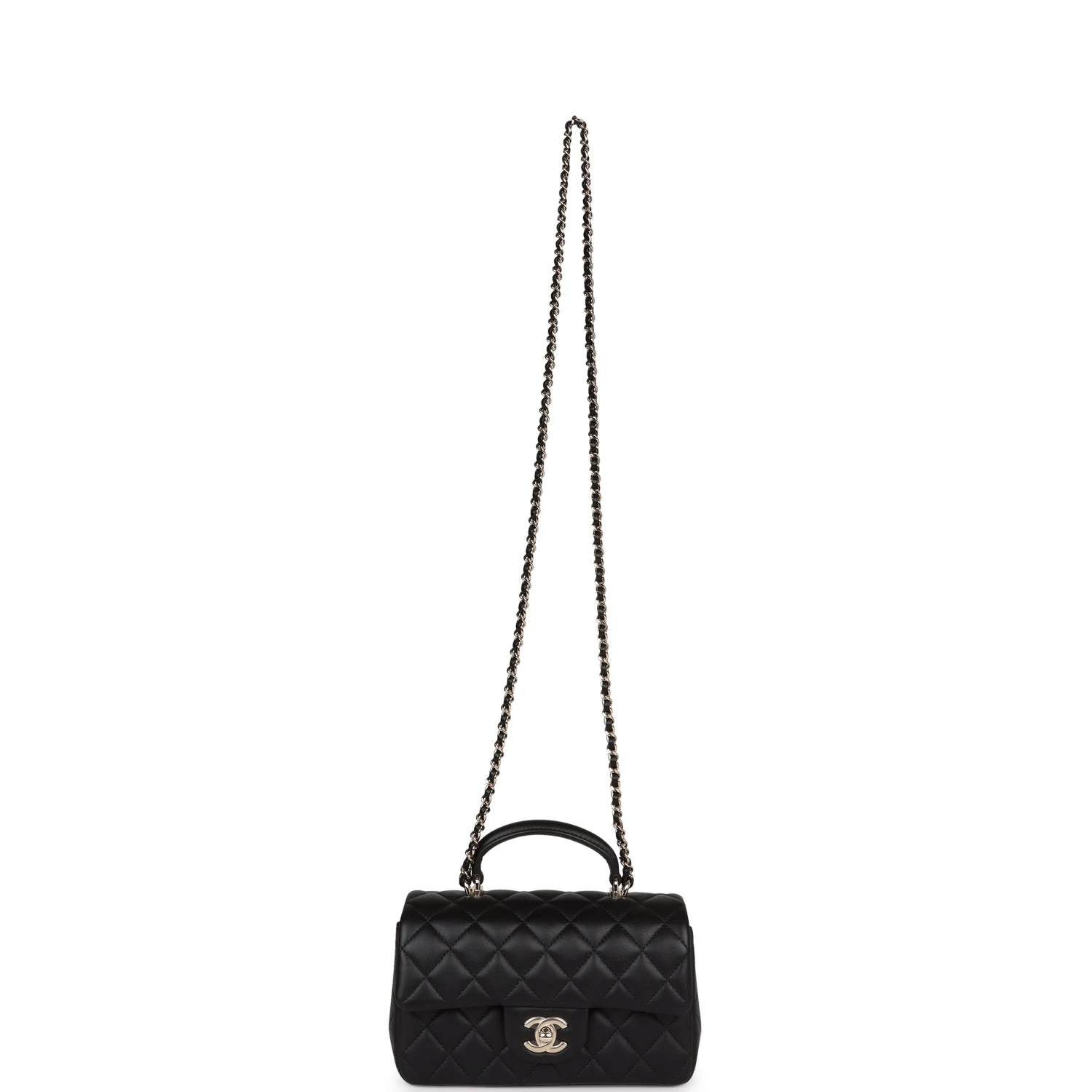 This Mini Rectangular flap bag is in Black lambskin with light gold tone hardware and has a front flap with signature CC turnlock closure, rear half moon pocket, top handle and single interwoven black leather and light gold tone chain link shoulder/crossbody strap.
