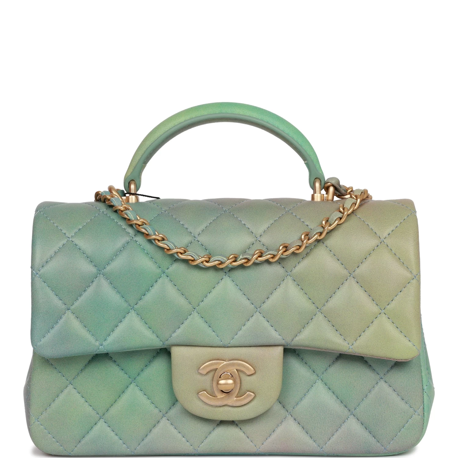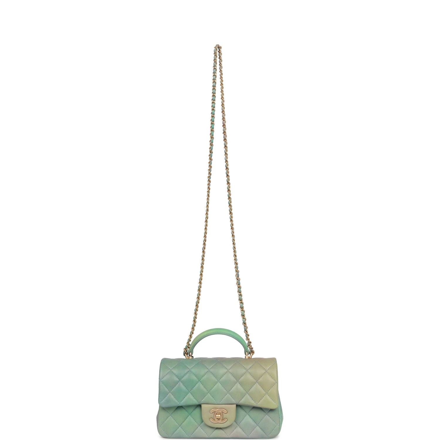 This Mini Rectangular flap bag is in green ombre lambskin with antique gold tone hardware and has a front flap with signature CC turnlock closure, rear half moon pocket, top handle and single interwoven green ombre leather and antique gold tone chain link shoulder/crossbody strap.