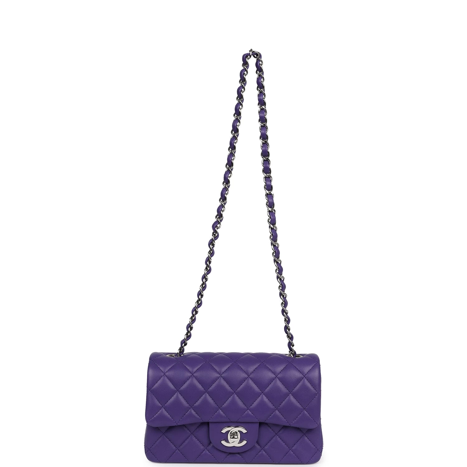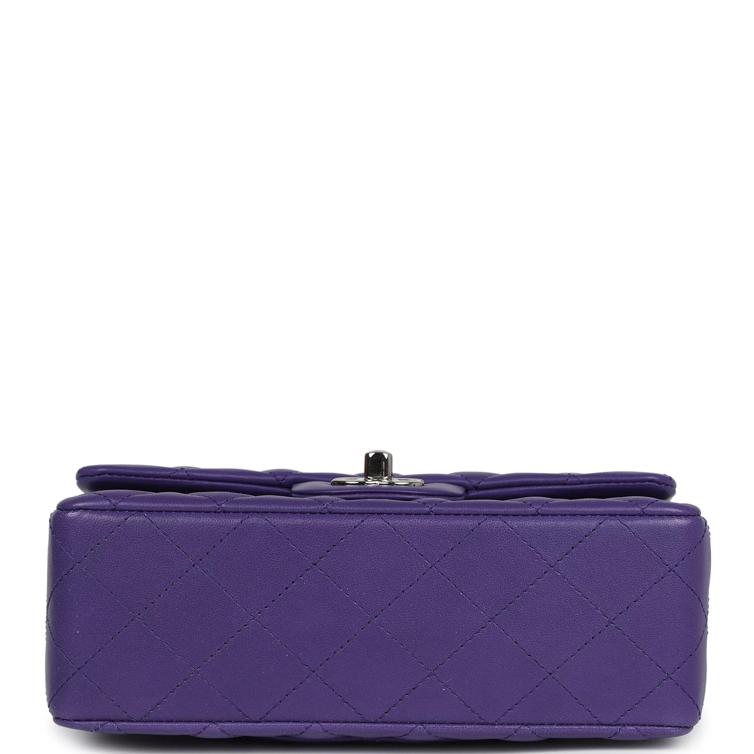 This Chanel mini classic rectangular flap bag is of dark purple lambskin leather with silver tone hardware and has a front flap with signature CC turnlock closure, rear half moon pocket, single interwoven dark purple leather and silver chain link shoulder/crossbody strap.