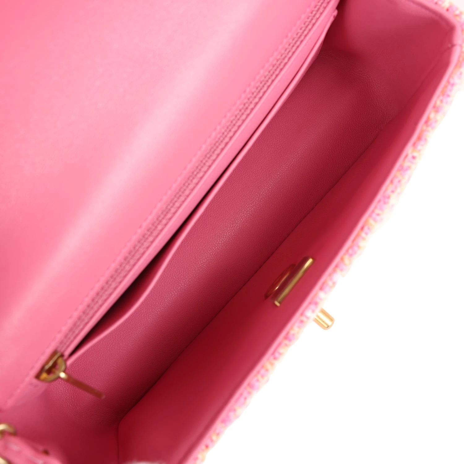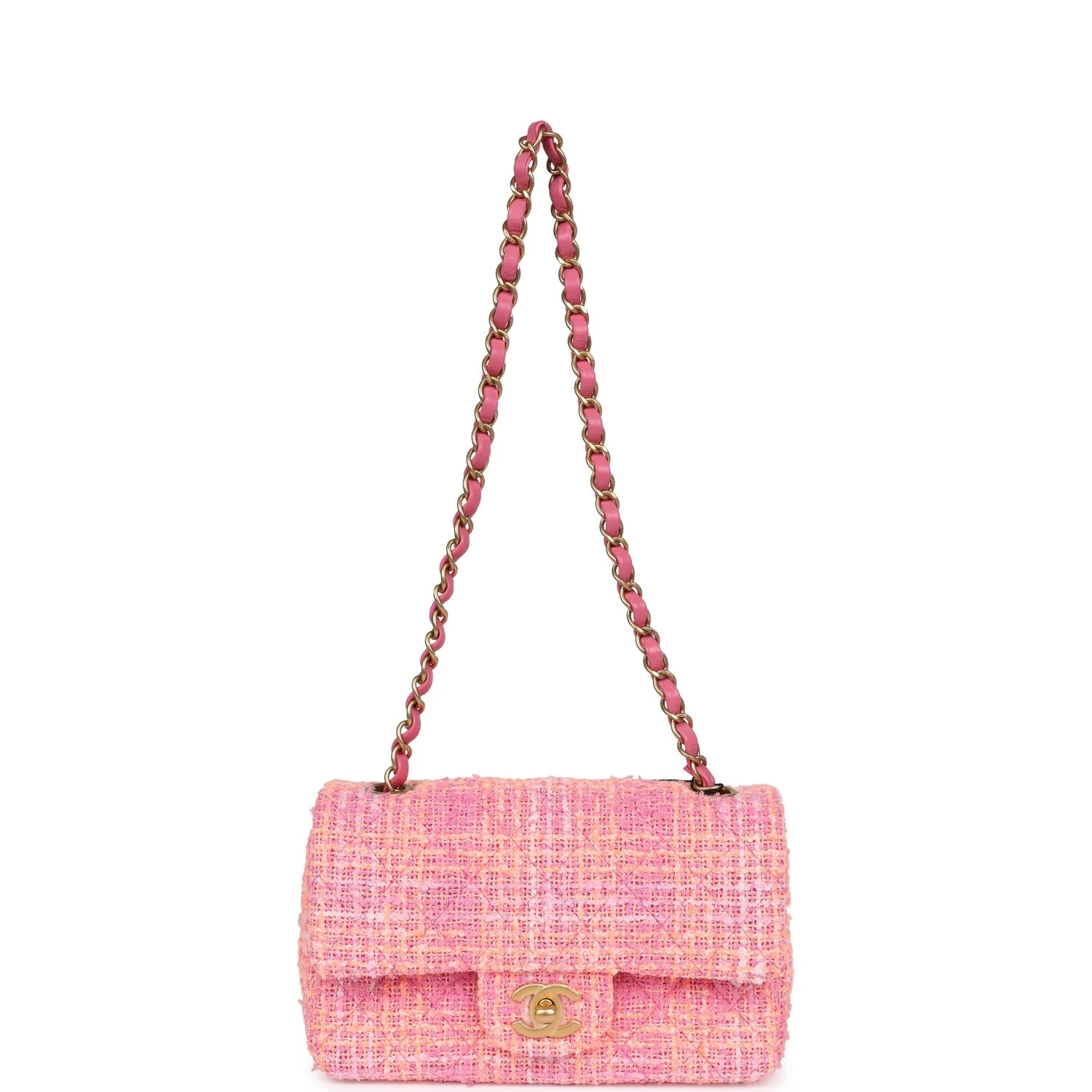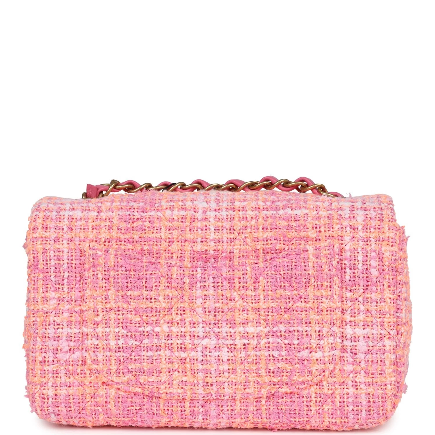 This Chanel mini classic rectangular flap bag is in orange and pink tweed with gold hardware and features a front flap with CC turnlock closure, half moon back pocket and interwoven gold chain link and pink leather shoulder/crossbody strap.