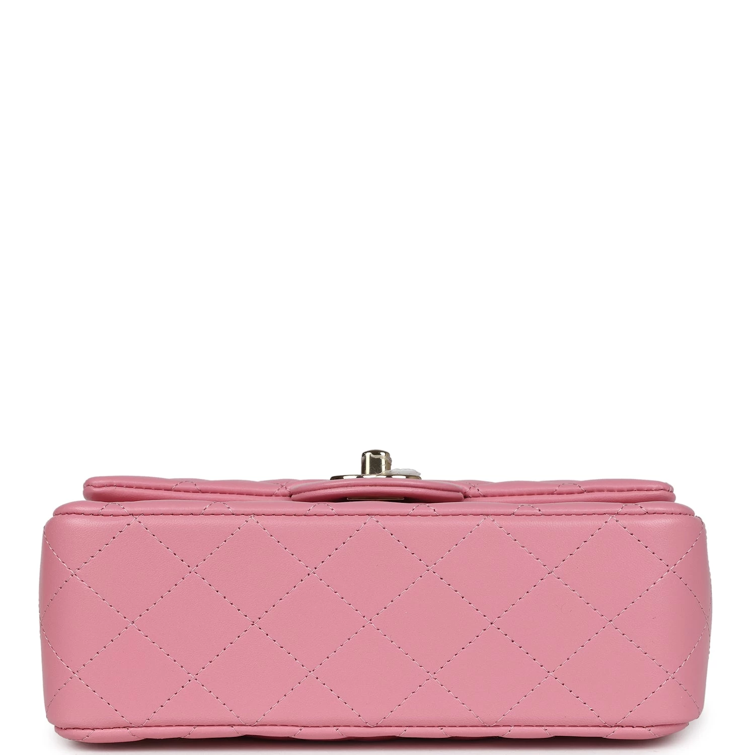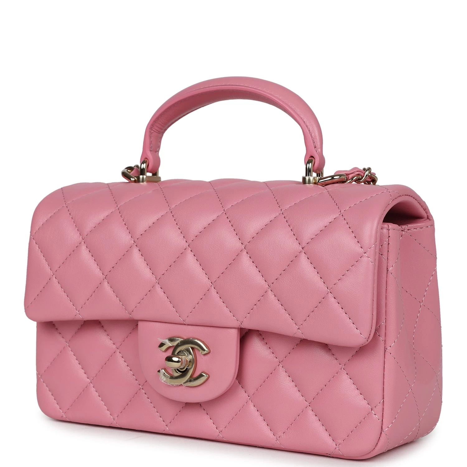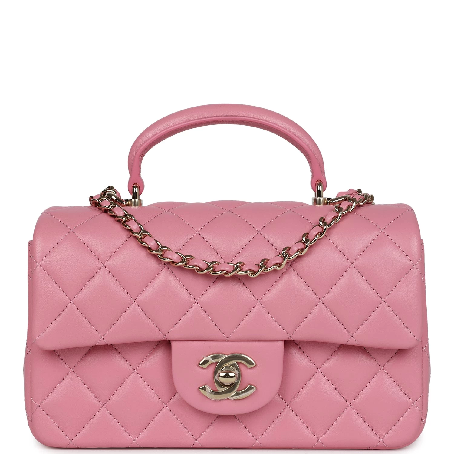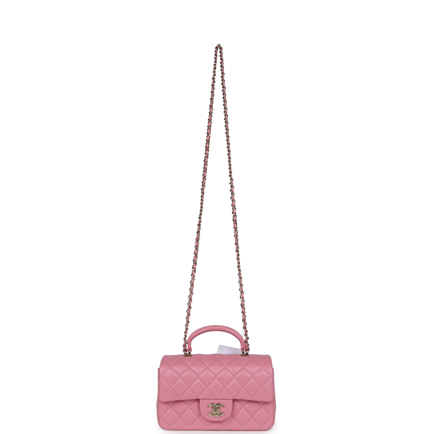 This mini rectangular flap bag is in Dark Pink lambskin with light gold tone hardware and has a front flap with signature CC turnlock closure, rear half moon pocket, top handle and single interwoven Dark Pink leather and light gold tone chain link shoulder/crossbody strap.