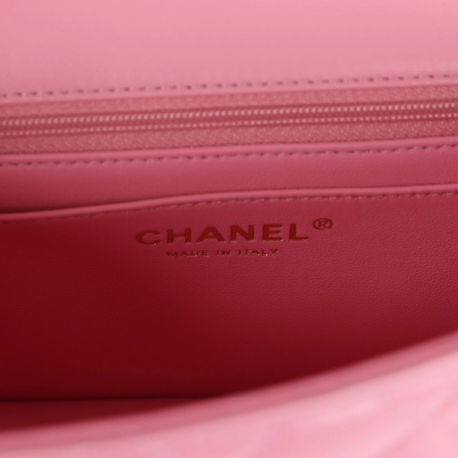 The interior is lined in Dark Pink leather and features a zipper pocket with Chanel pull and an open pocket below.