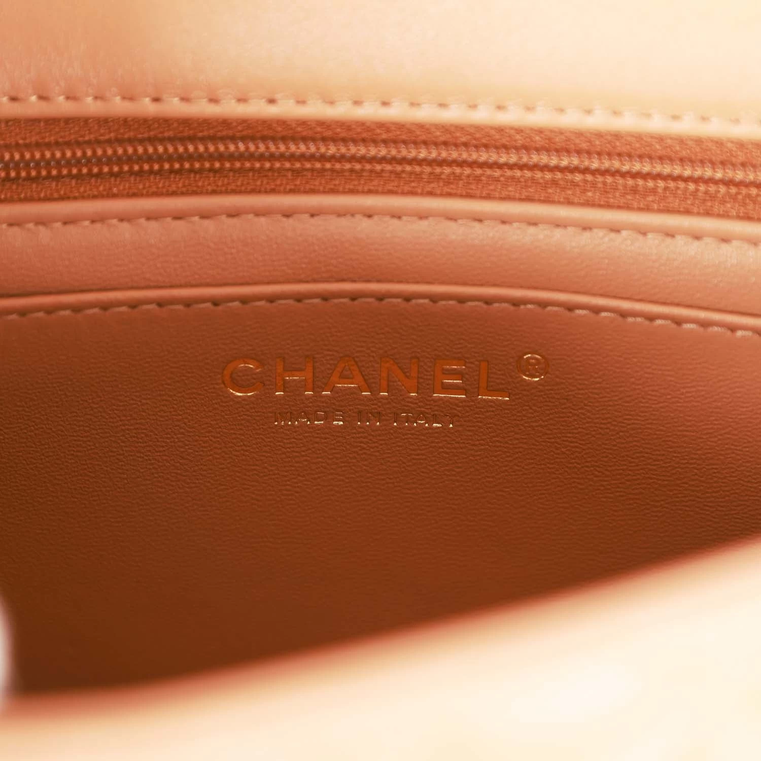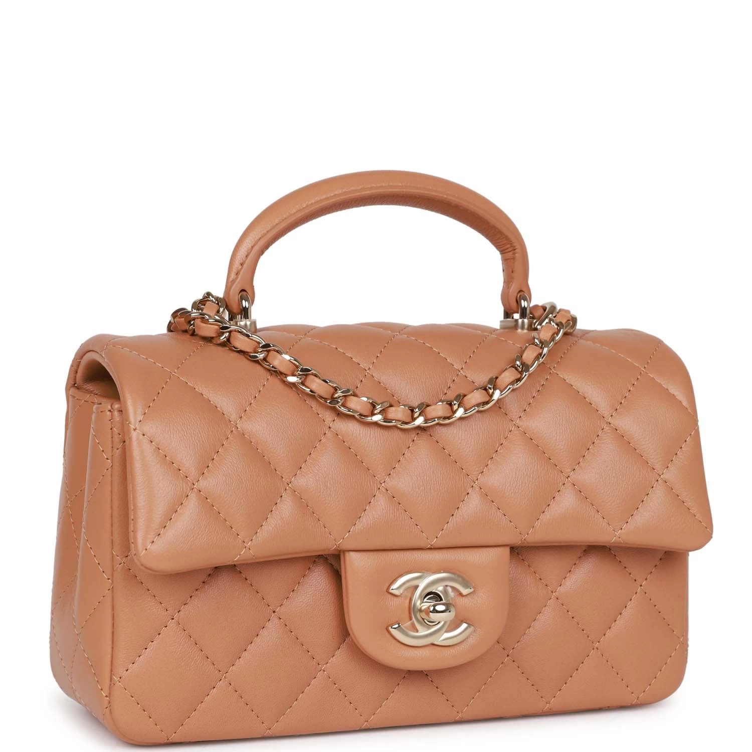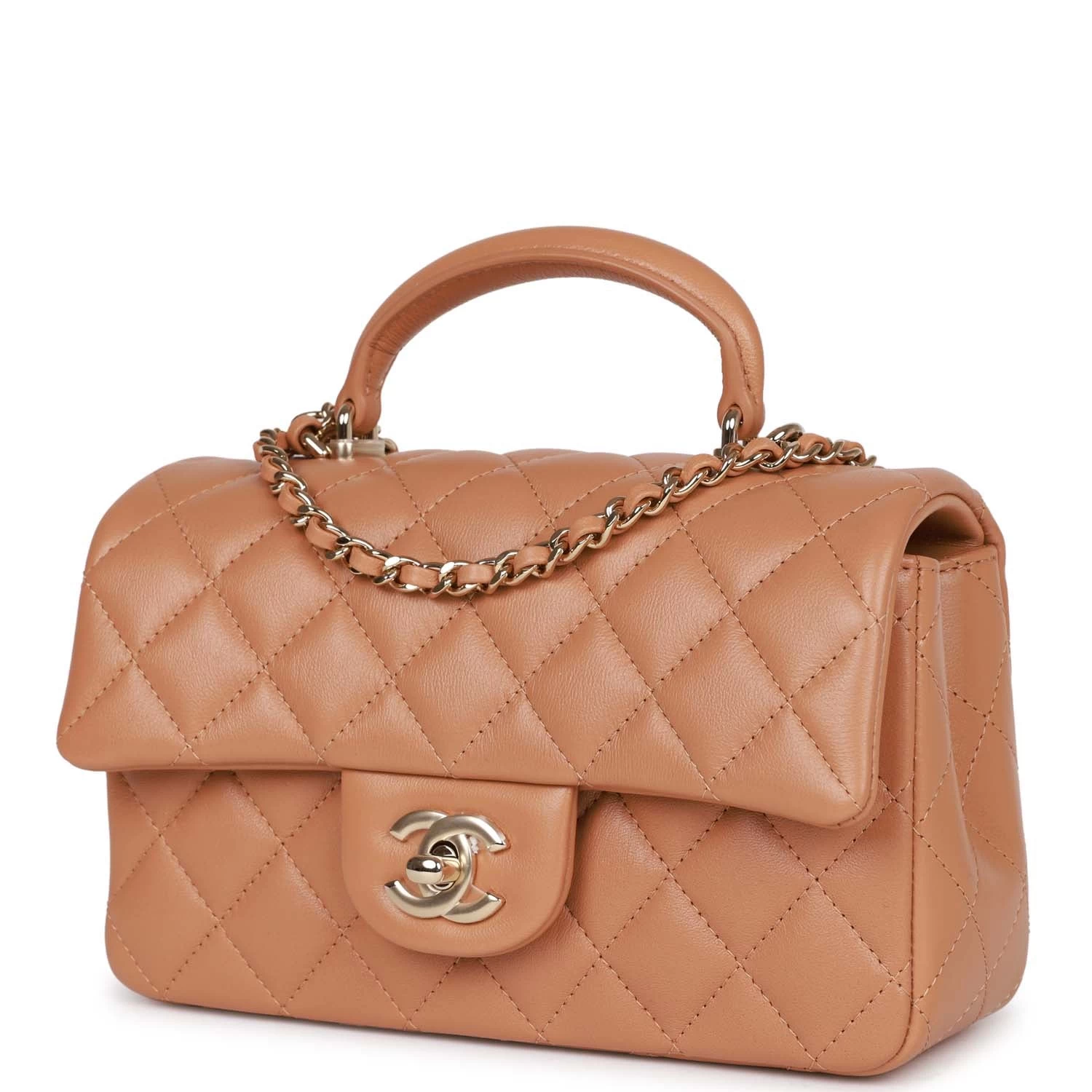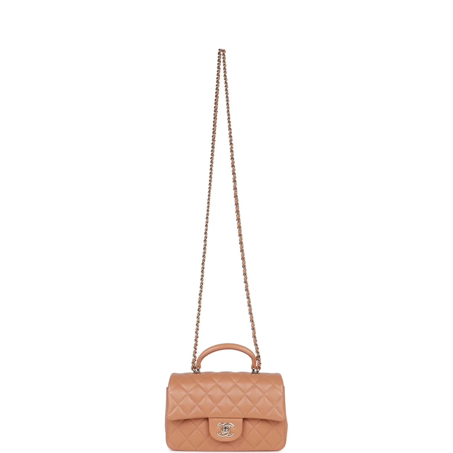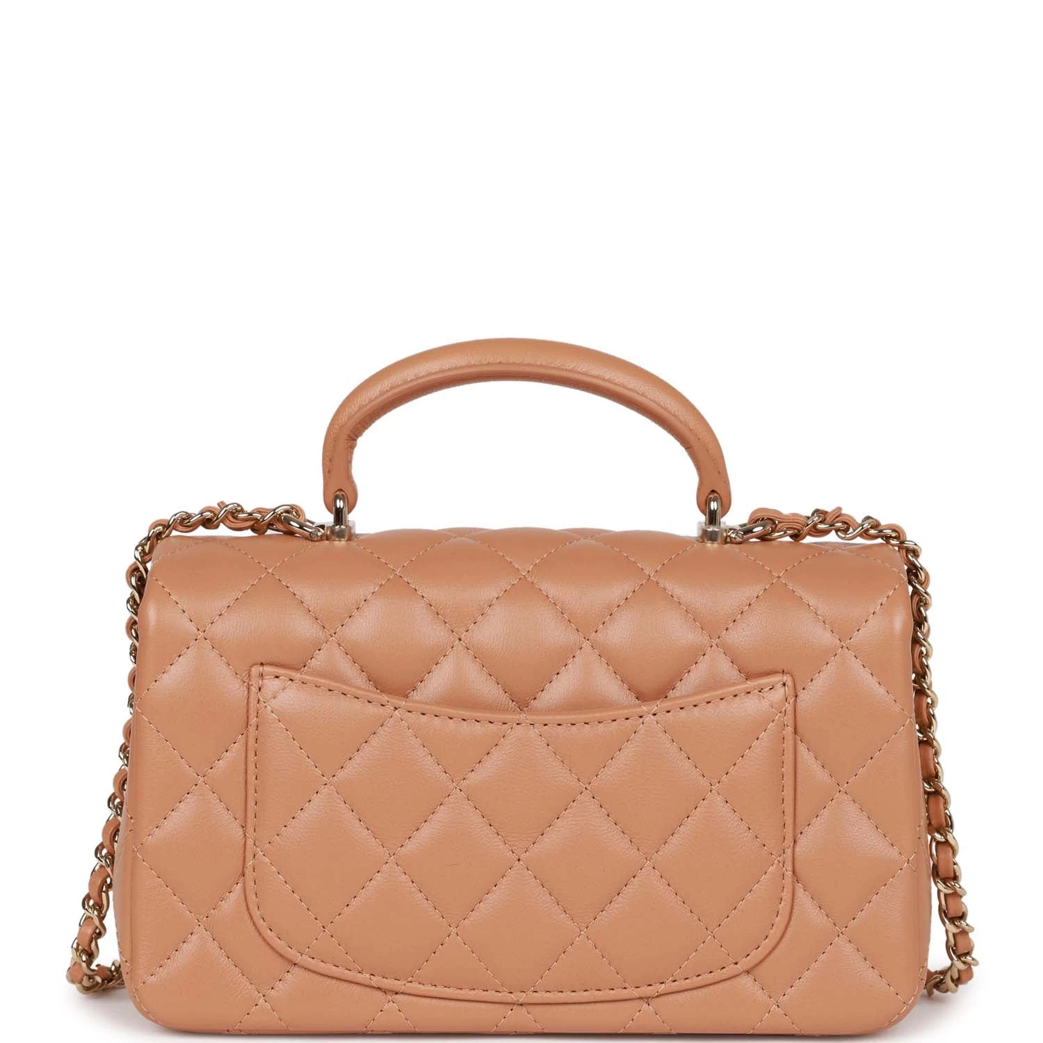 This Mini Rectangular flap bag with top handle is in Caramel quilted lambskin leather with light gold tone hardware, front flap with CC turnlock closure, half moon back pocket and interwoven light gold tone chain link and Caramel shoulder/crossbody strap.