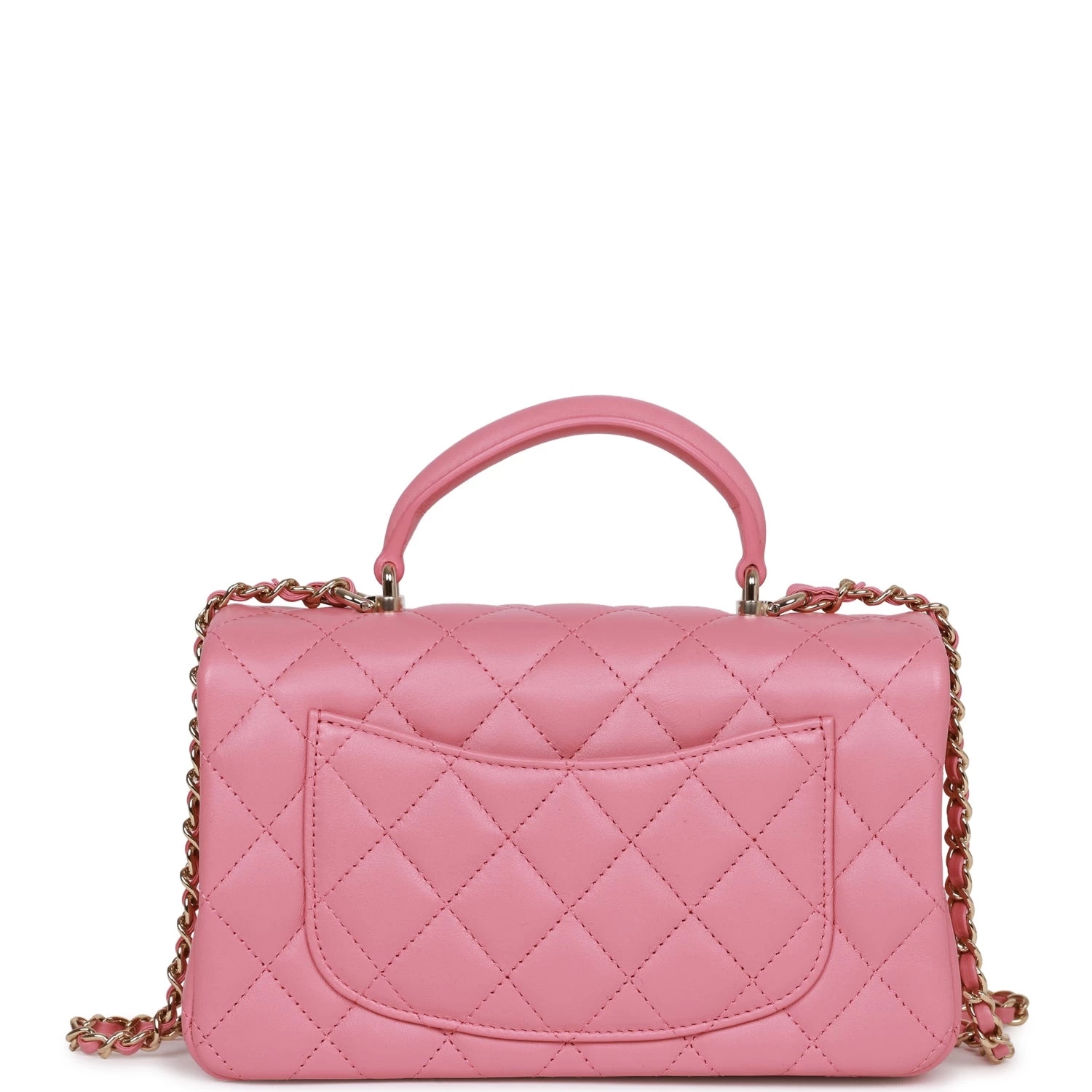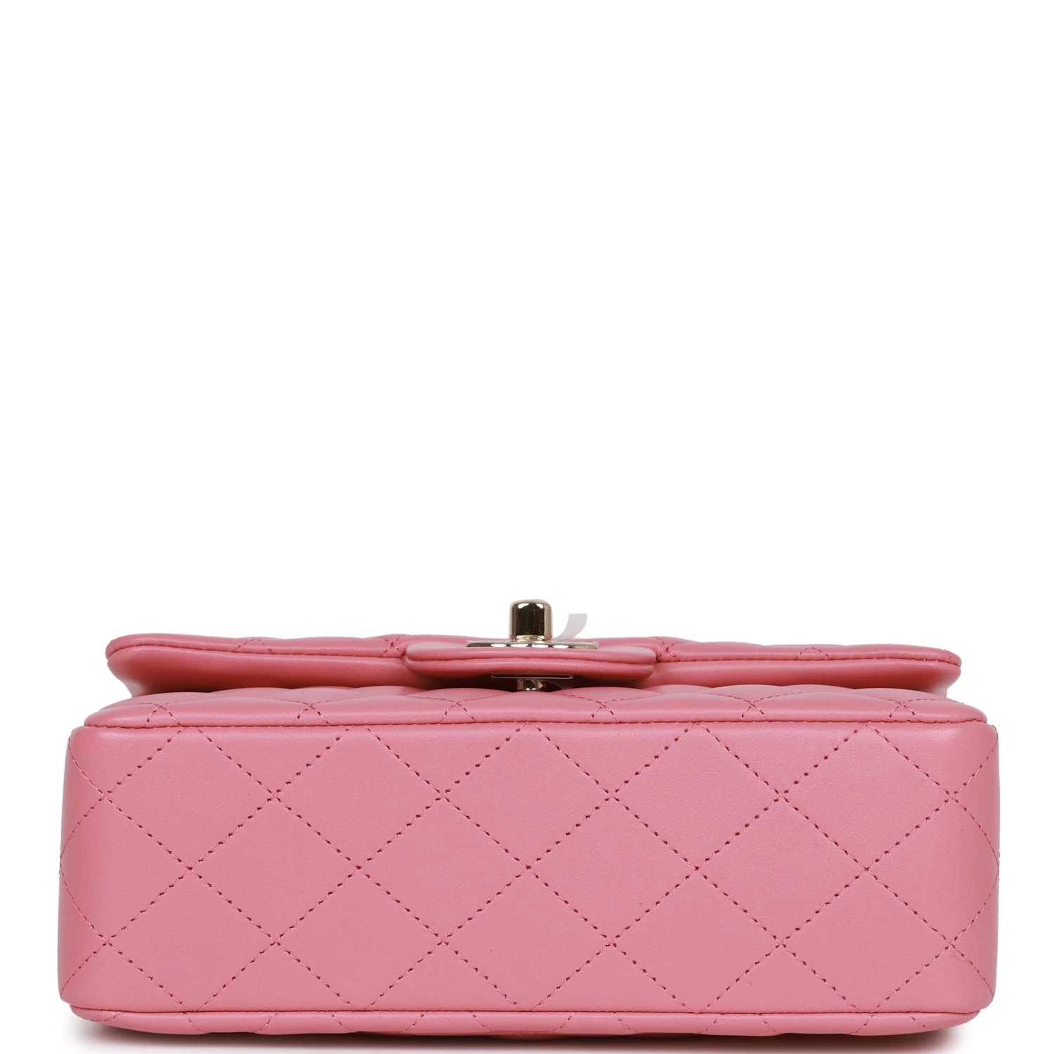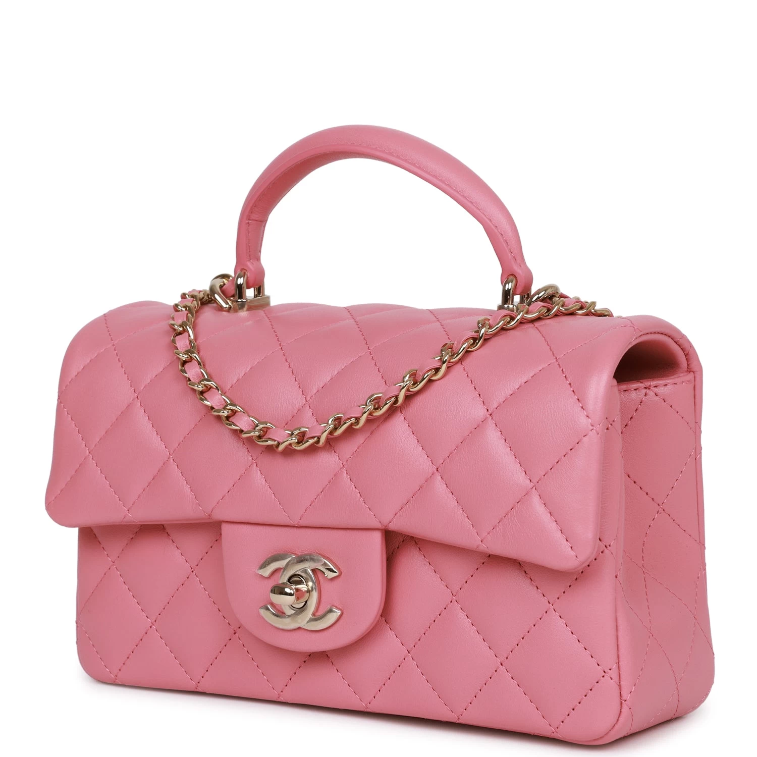 This Mini Rectangular flap bag is in dark pink lambskin with light gold tone hardware and has a front flap with signature CC turnlock closure, rear half moon pocket, top handle and single interwoven dark pink leather and light gold tone chain link shoulder/crossbody strap.
