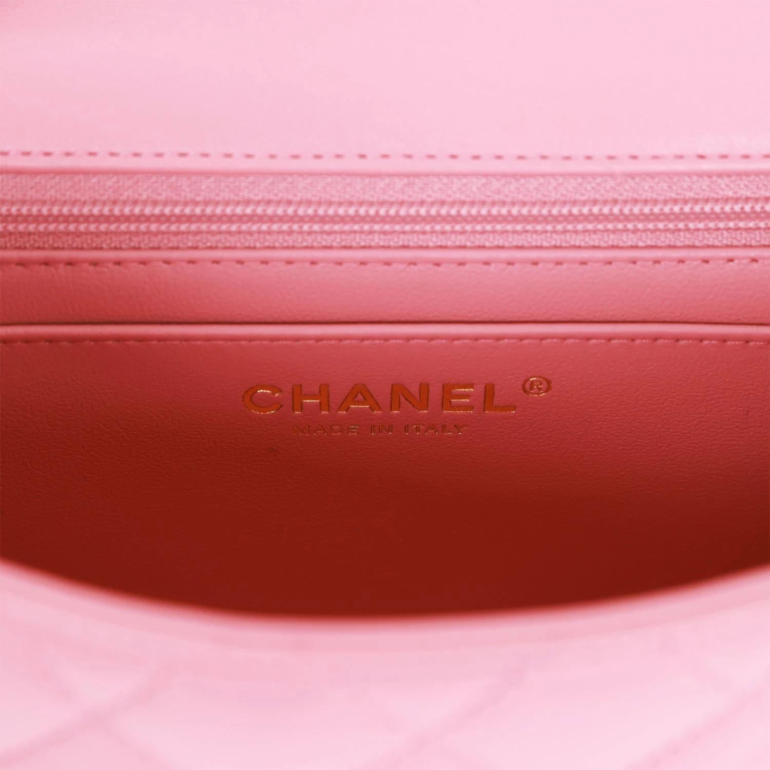 The interior is lined in dark pink leather and features a zipper pocket with Chanel pull and an open pocket below.