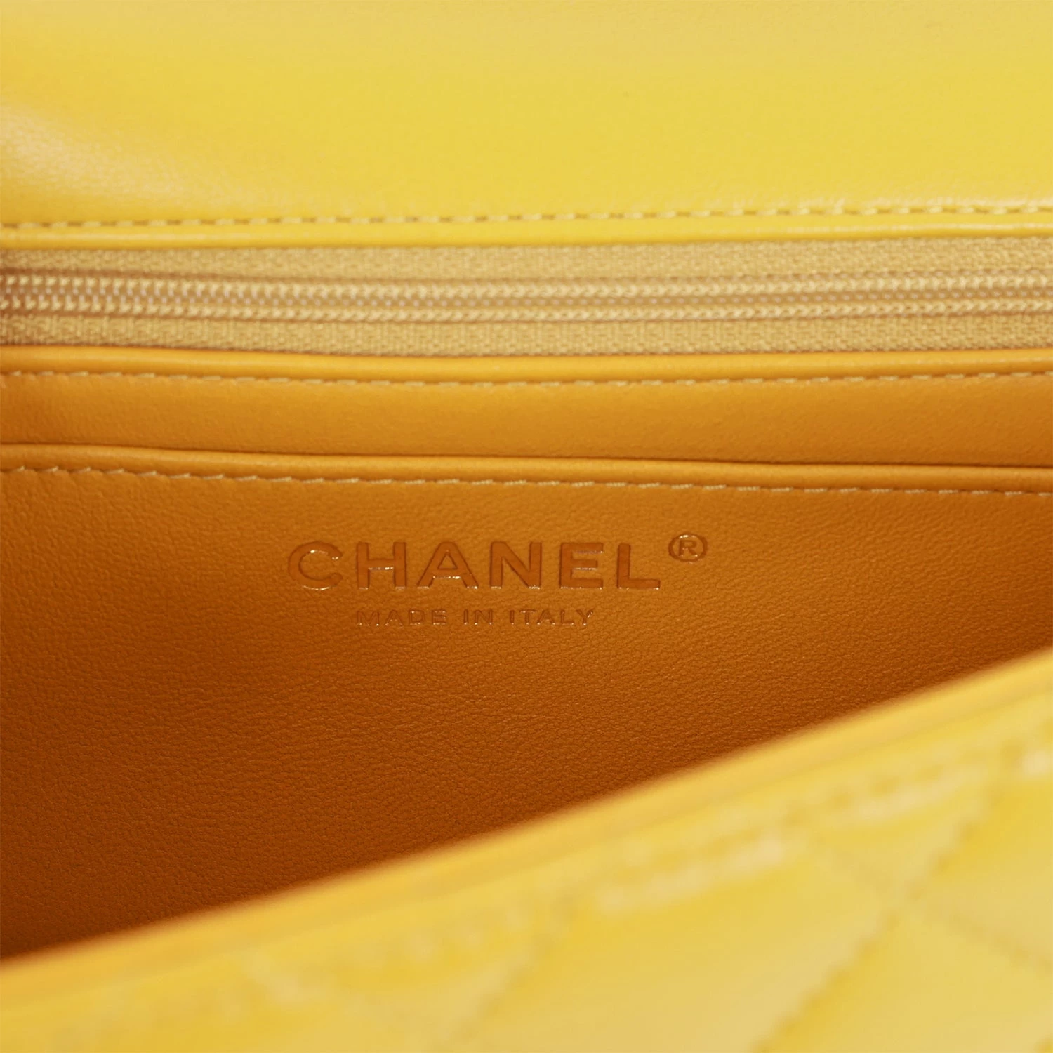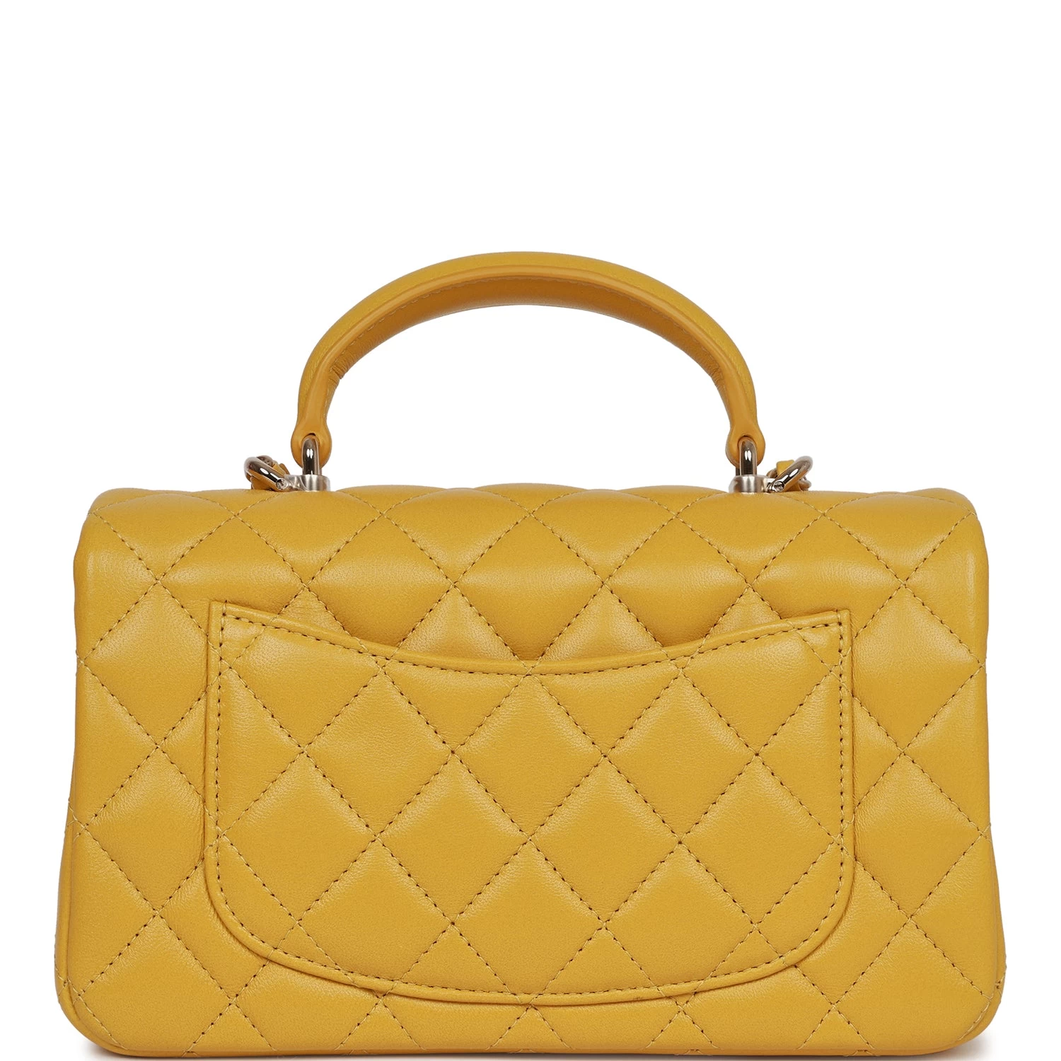This Mini Rectangular flap bag is in yellow lambskin with light gold tone hardware and has a front flap with signature CC turnlock closure, rear half moon pocket, top handle and single interwoven yellow leather and light gold tone chain link shoulder/crossbody strap.