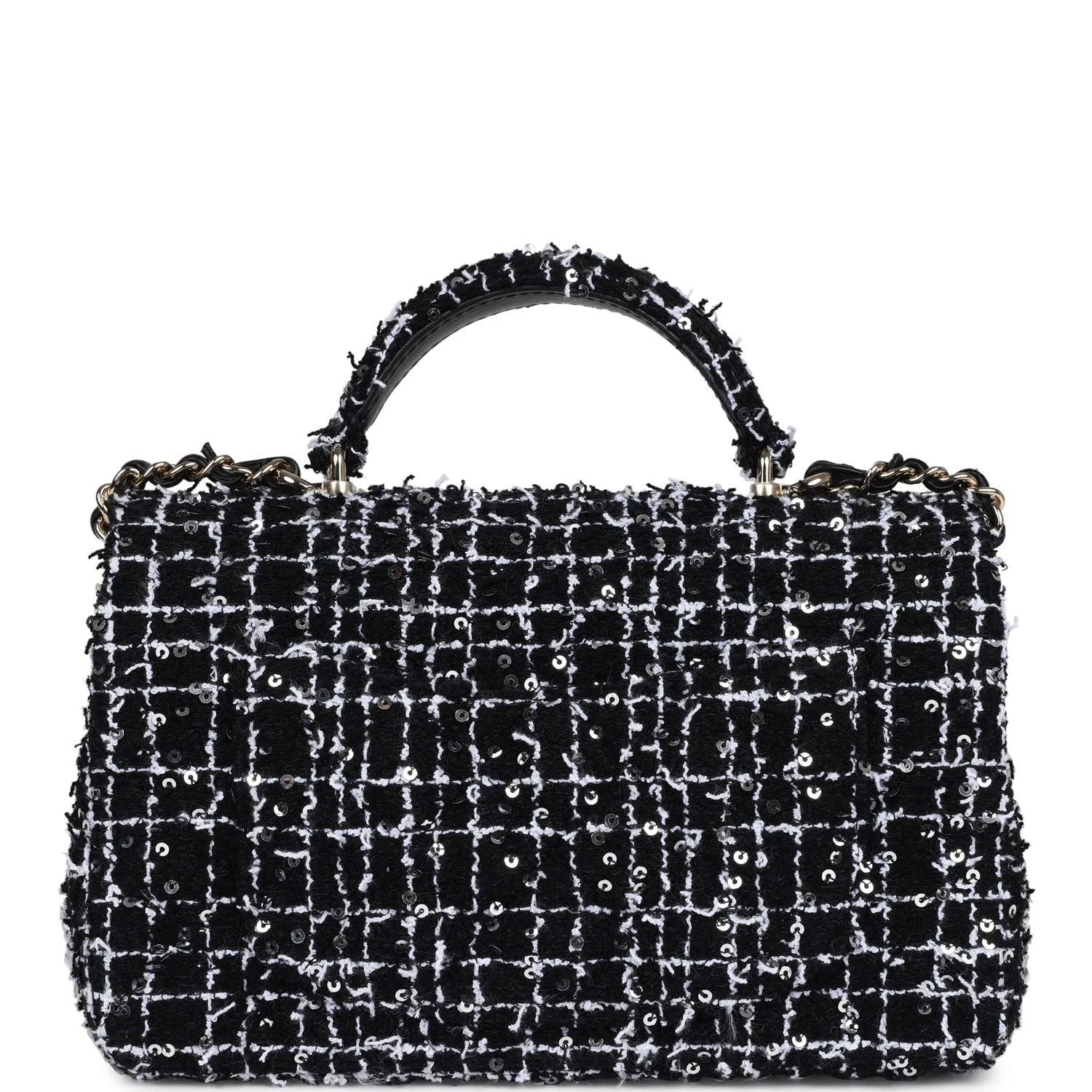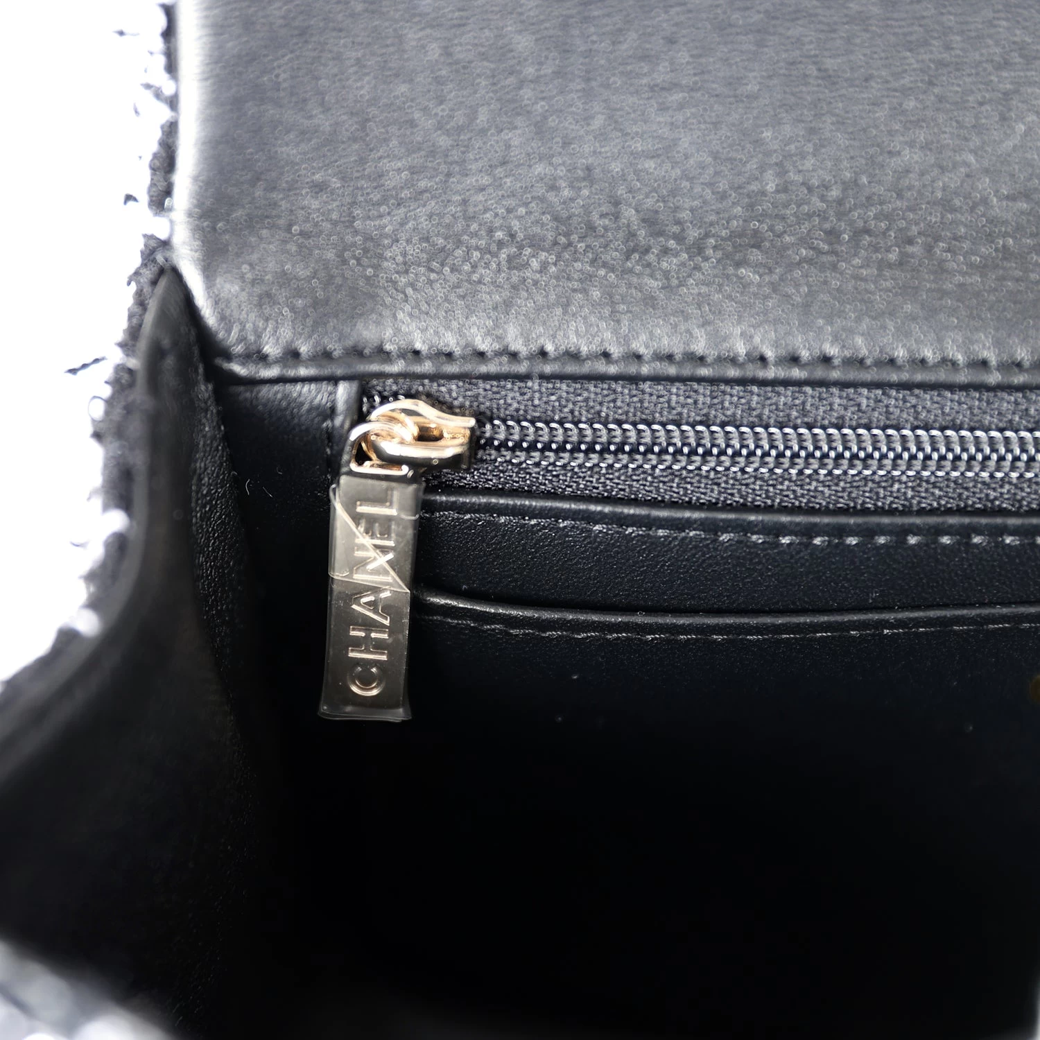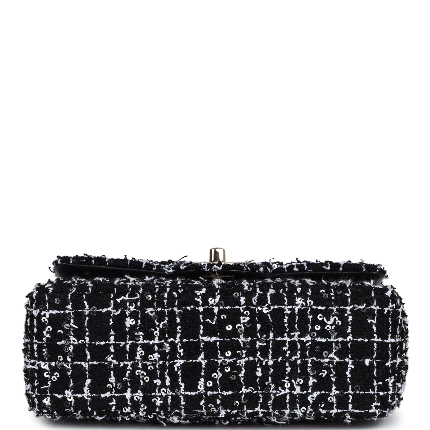 This Chanel Mini rectangular top handle flap bag is in black and white sequin tweed with light gold tone hardware and has a front flap with signature CC turnlock closure, rear half moon pocket, top handle and single interwoven Black leather and light gold tone chain link shoulder/crossbody strap.