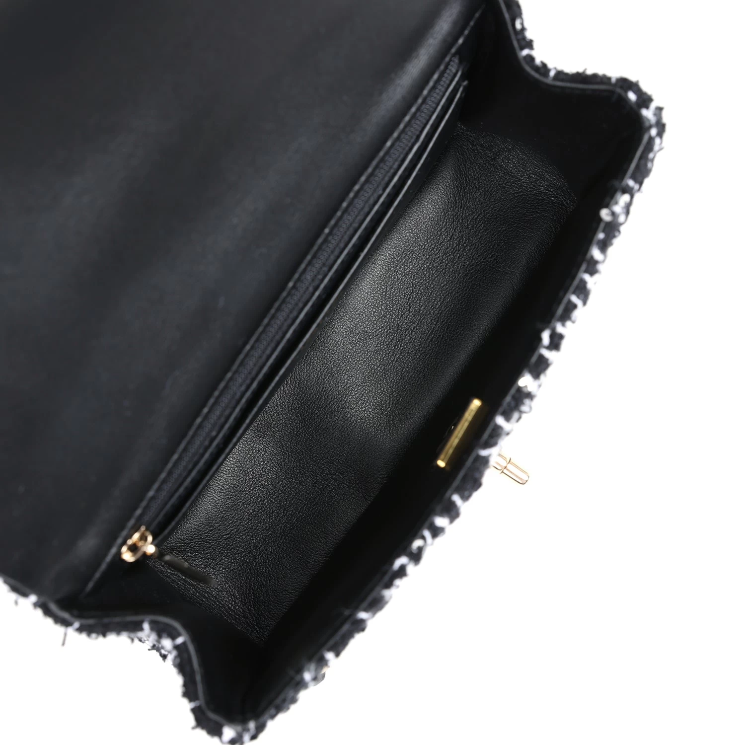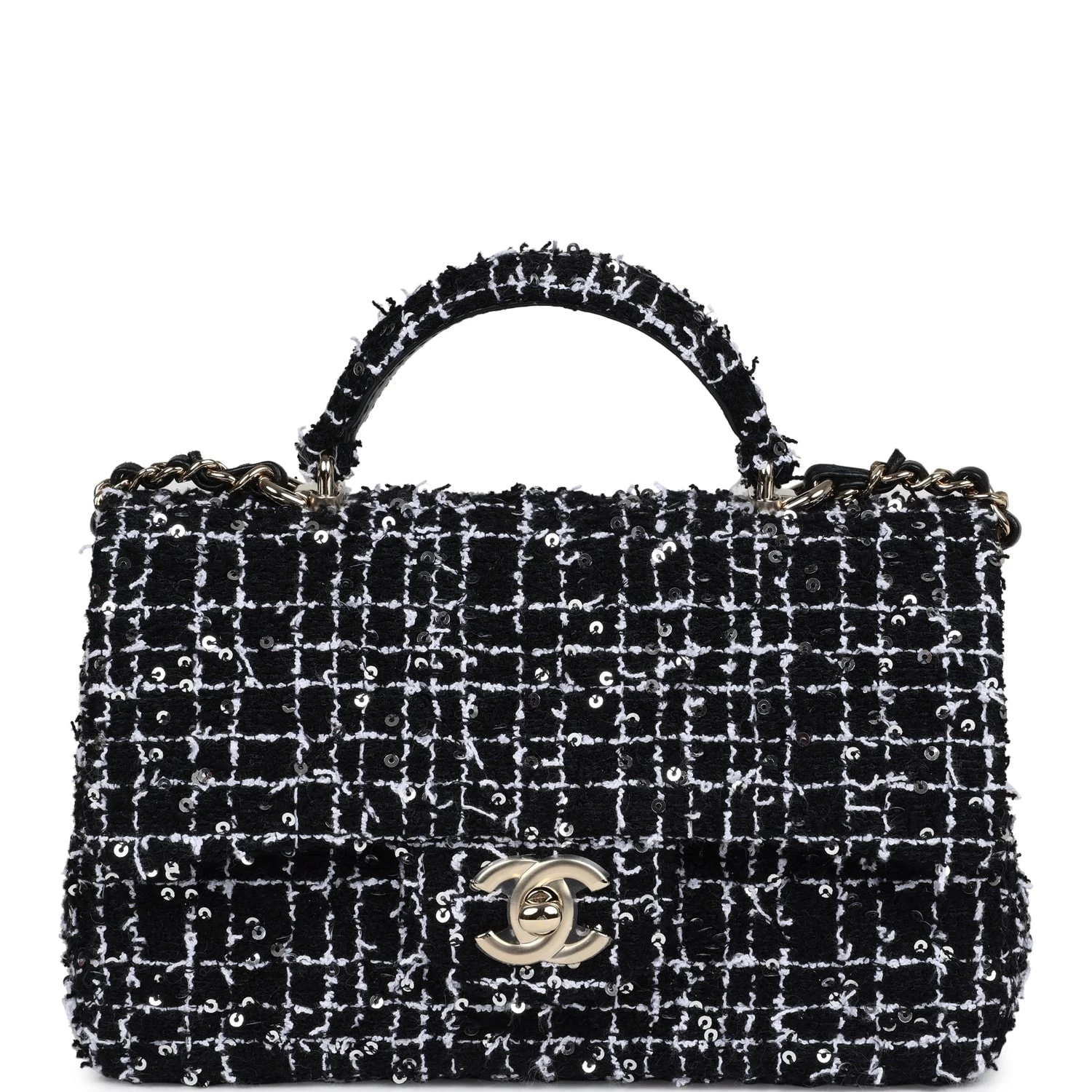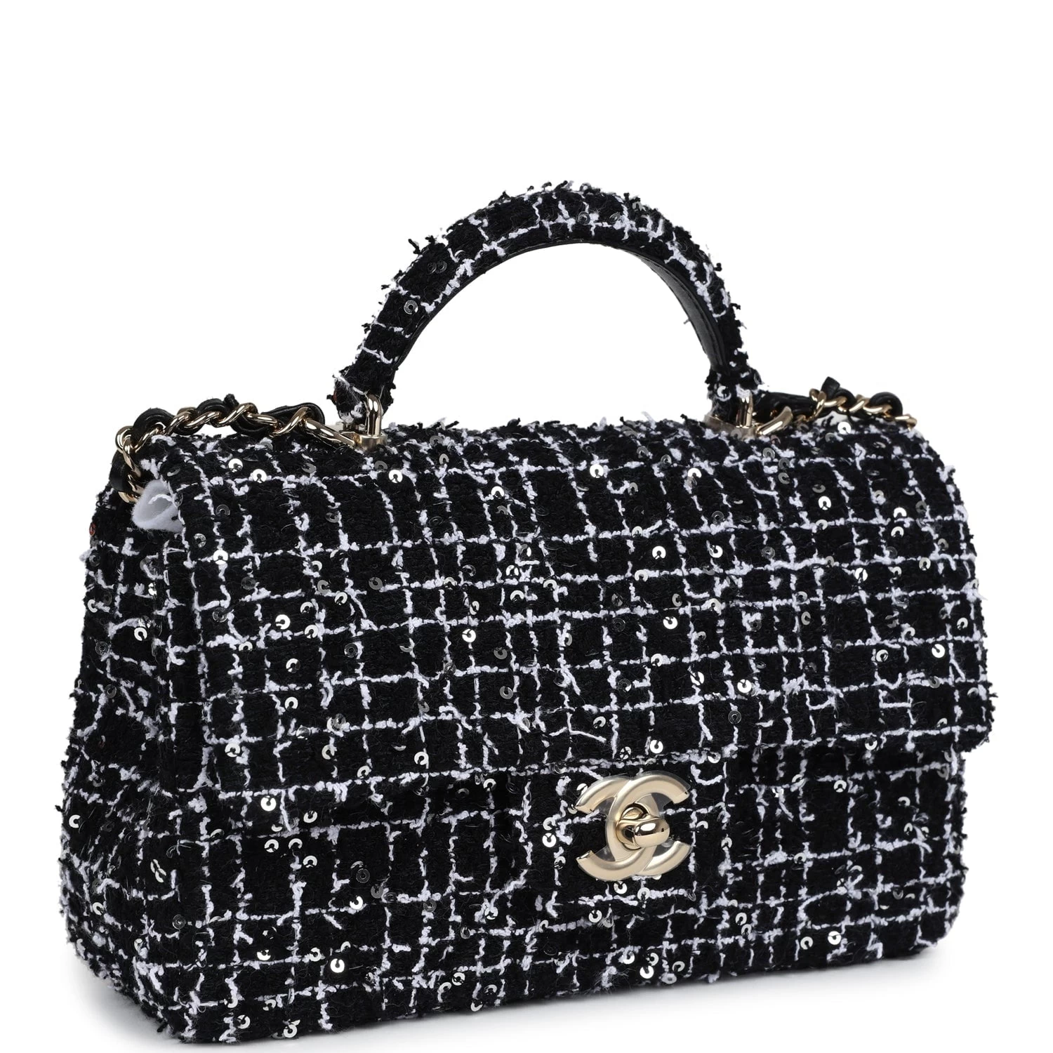 This Chanel Mini rectangular top handle flap bag is in black and white sequin tweed with light gold tone hardware and has a front flap with signature CC turnlock closure, rear half moon pocket, top handle and single interwoven Black leather and light gold tone chain link shoulder/crossbody strap.