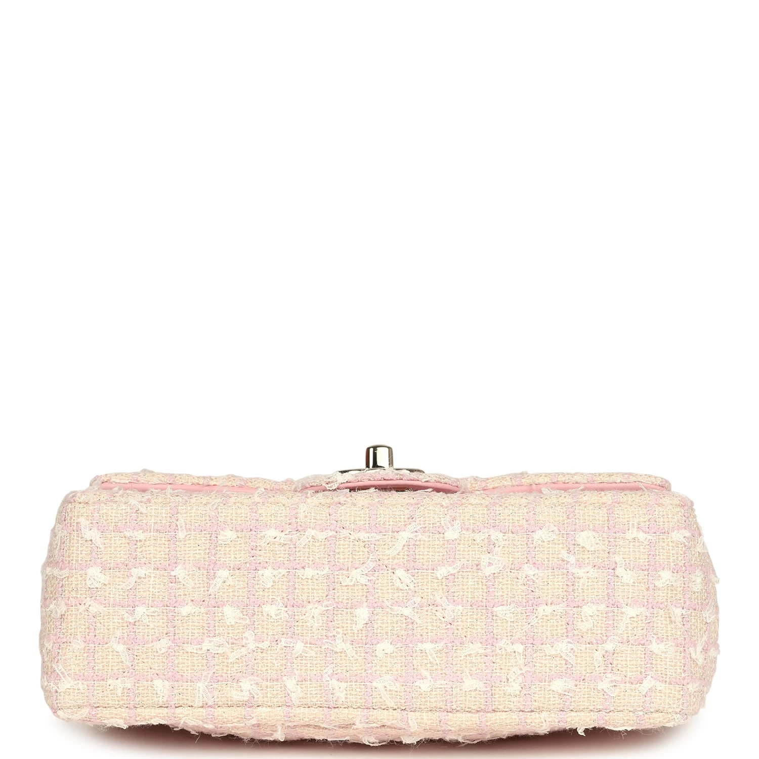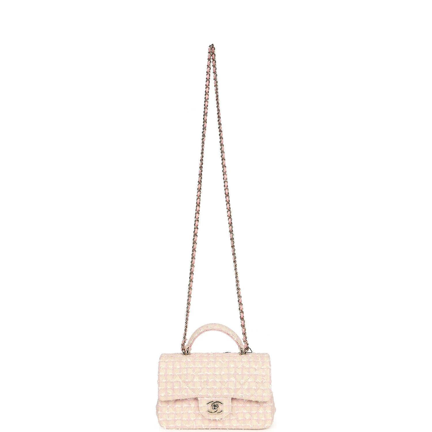 This Chanel Mini rectangular flap bag is in pink and white tweed with light gold hardware, a top handle, front flap with CC turnlock closure, half moon back pocket and an interwoven light gold chain link and pink shoulder/crossbody strap.