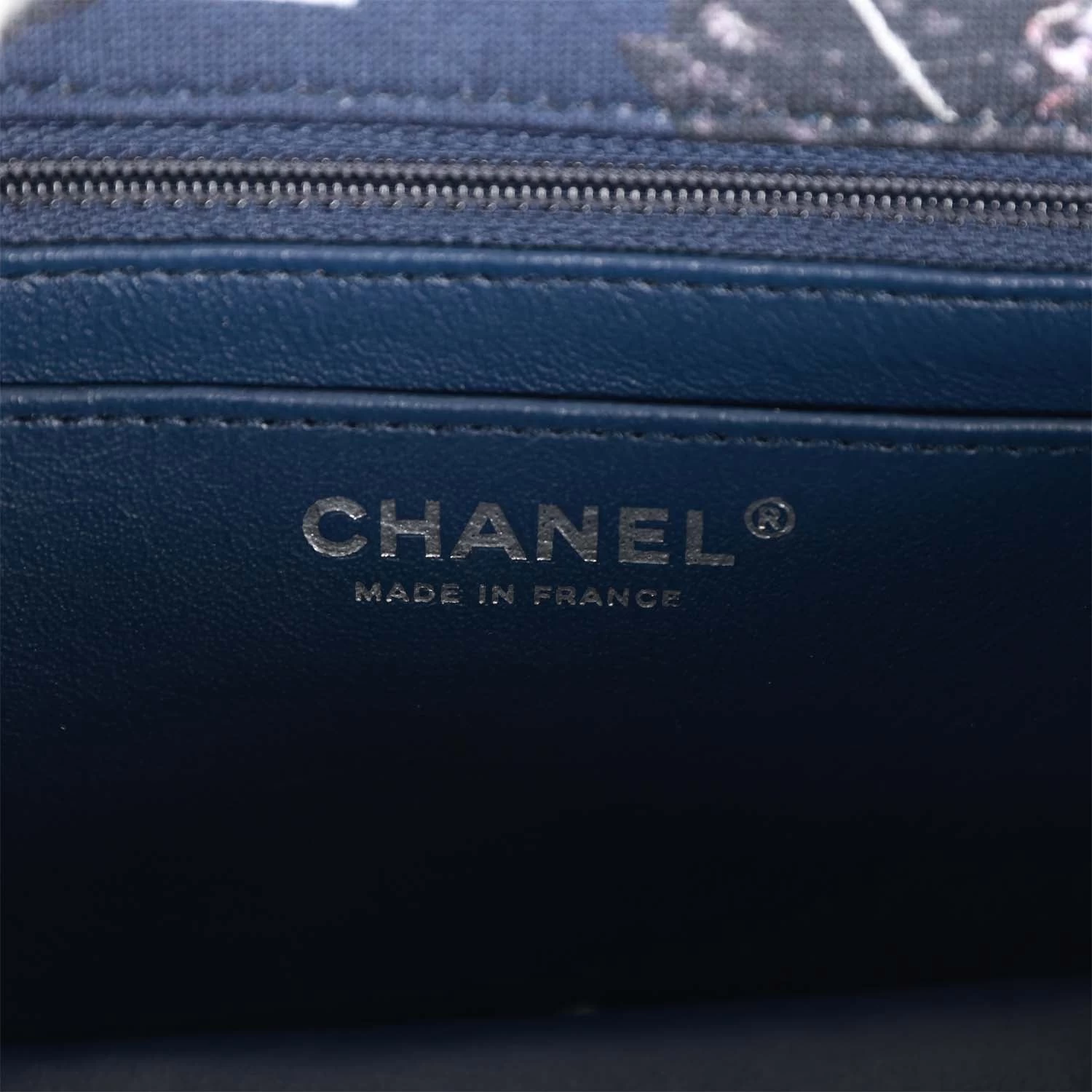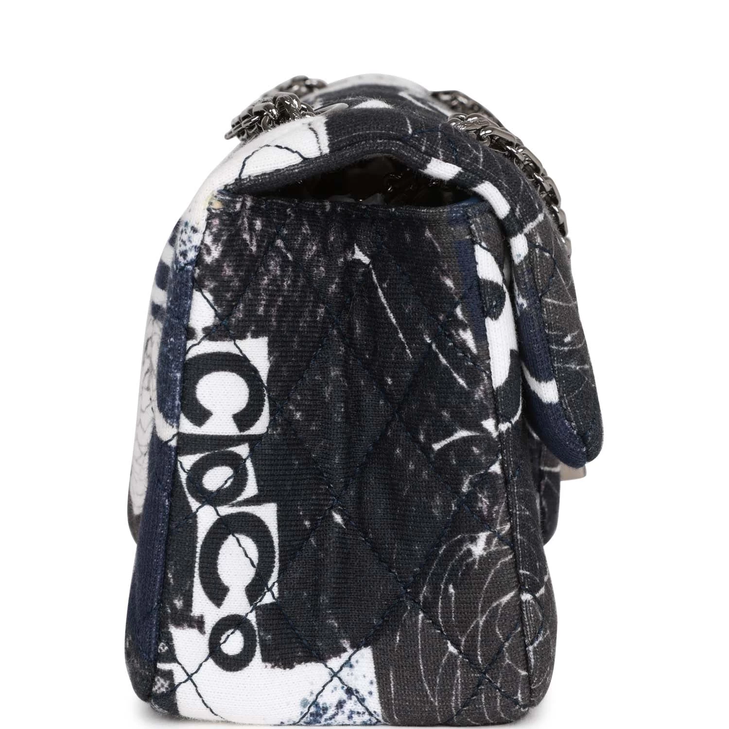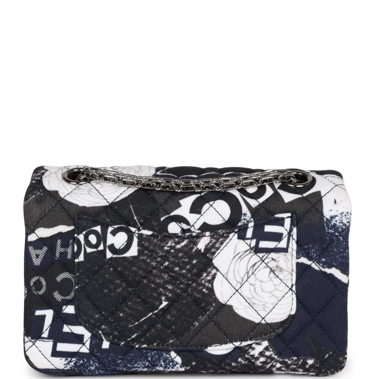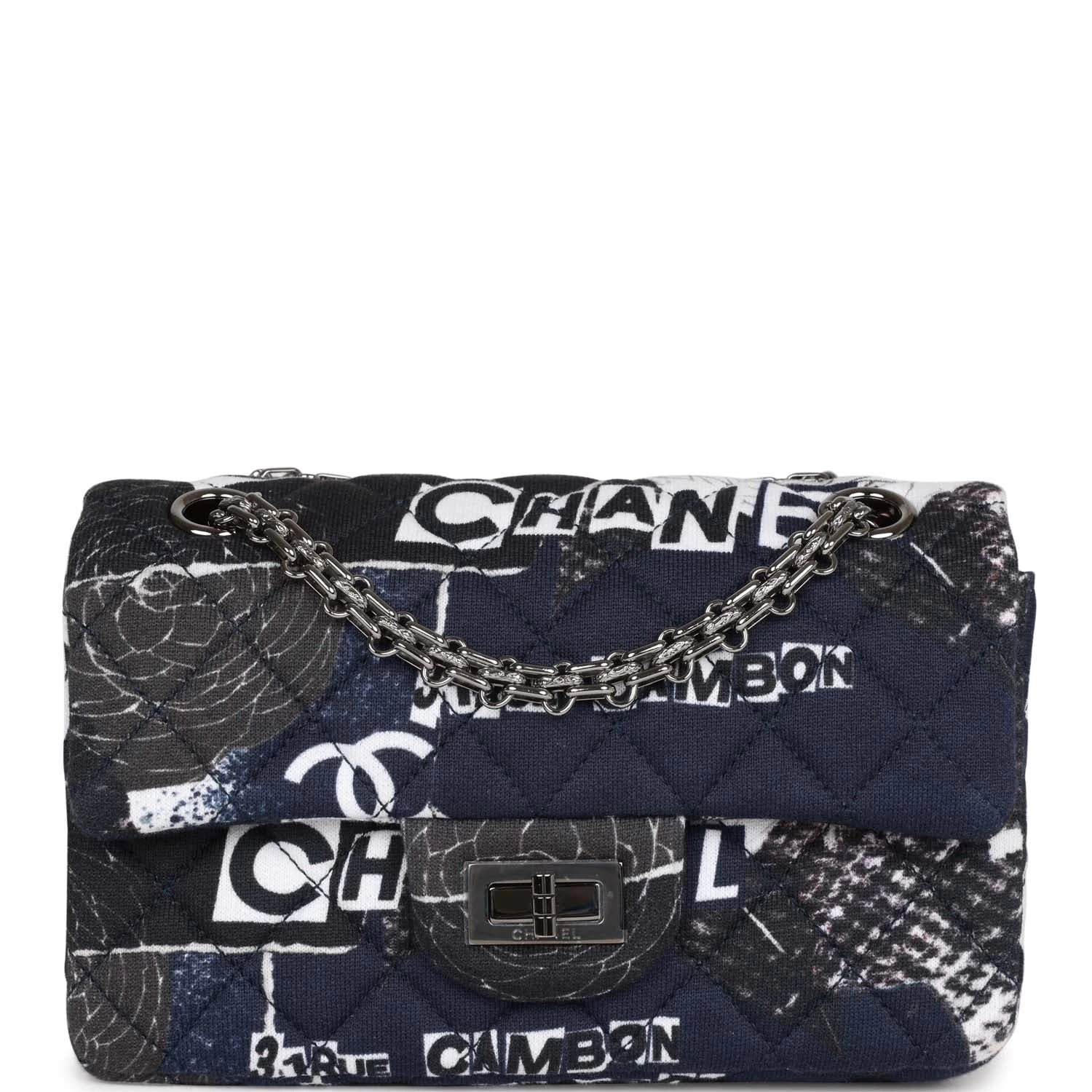 This mini 2.55 Reissue bag in Navy and Black graffiti print jersey fabric with ruthenium hardware and features a front flap with a Mademoiselle turn lock closure, halfmoon back pocket and interwoven ruthenium tone chain link shoulder/crossbody strap.
