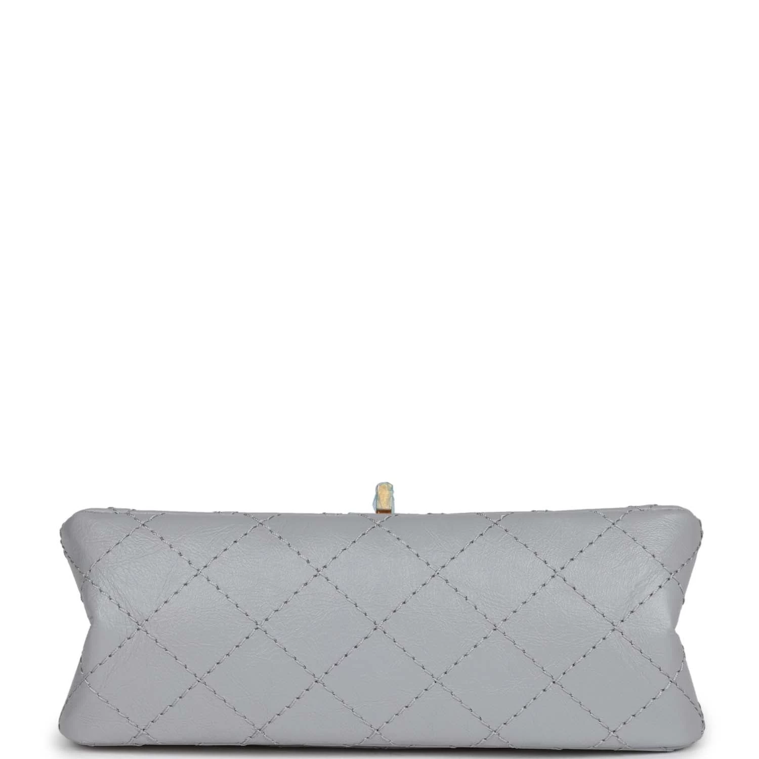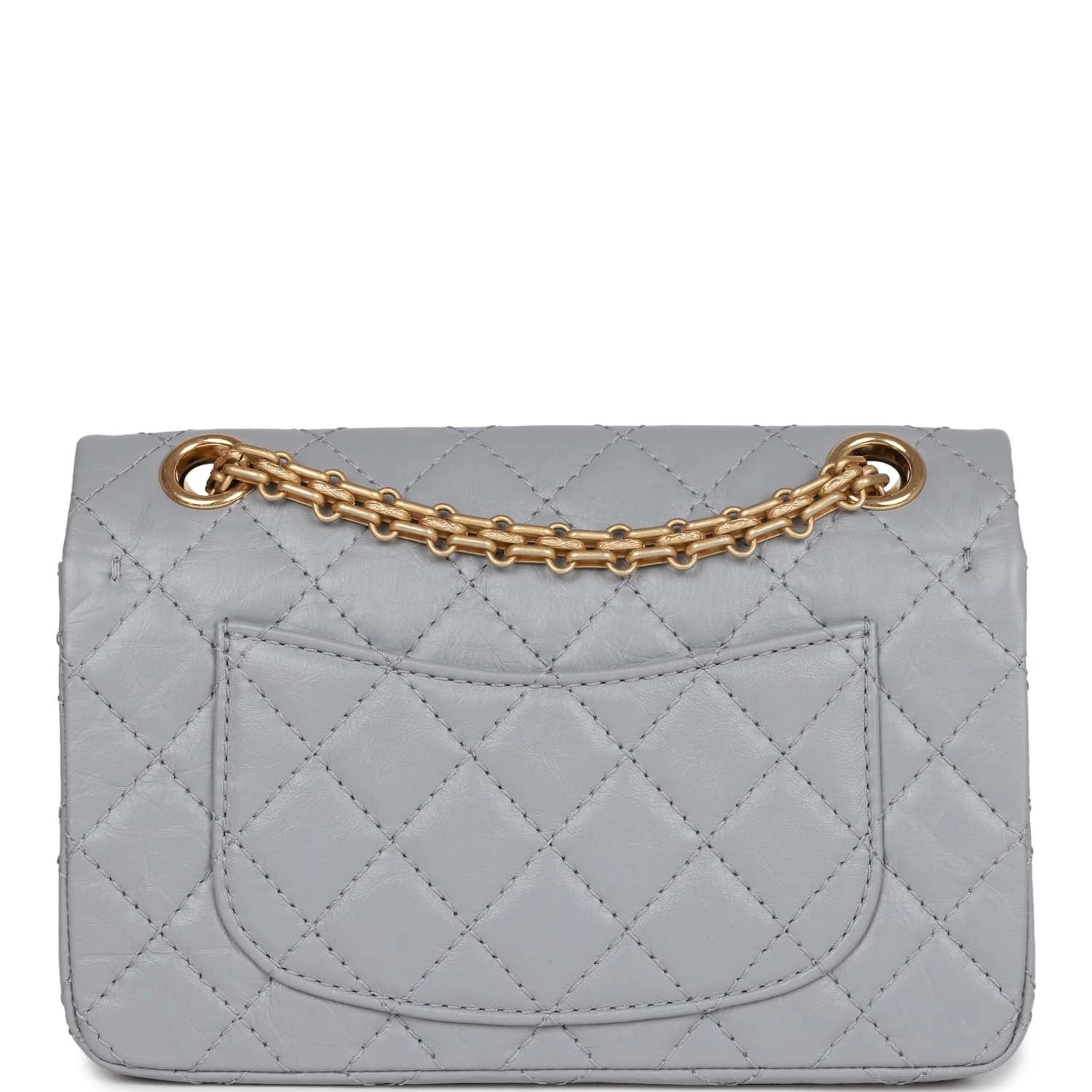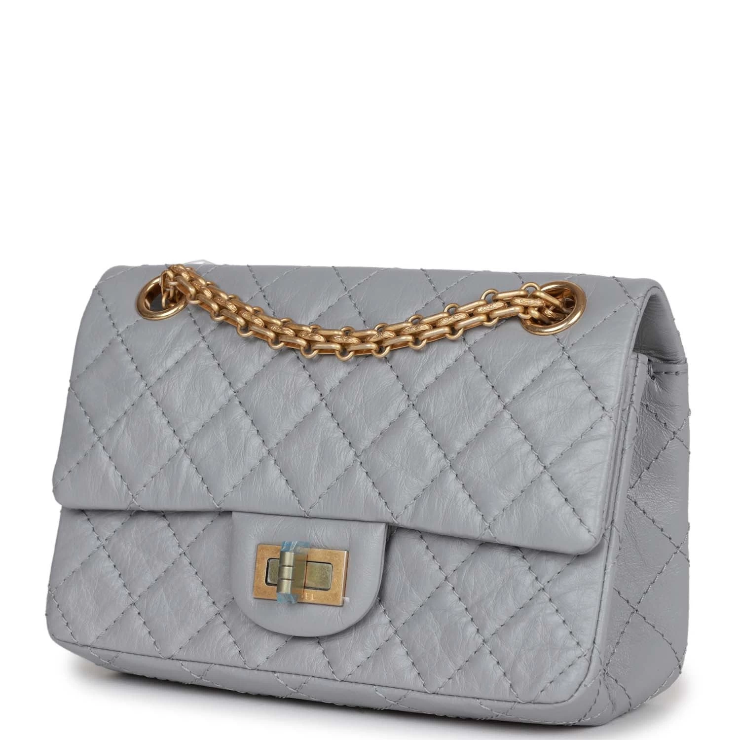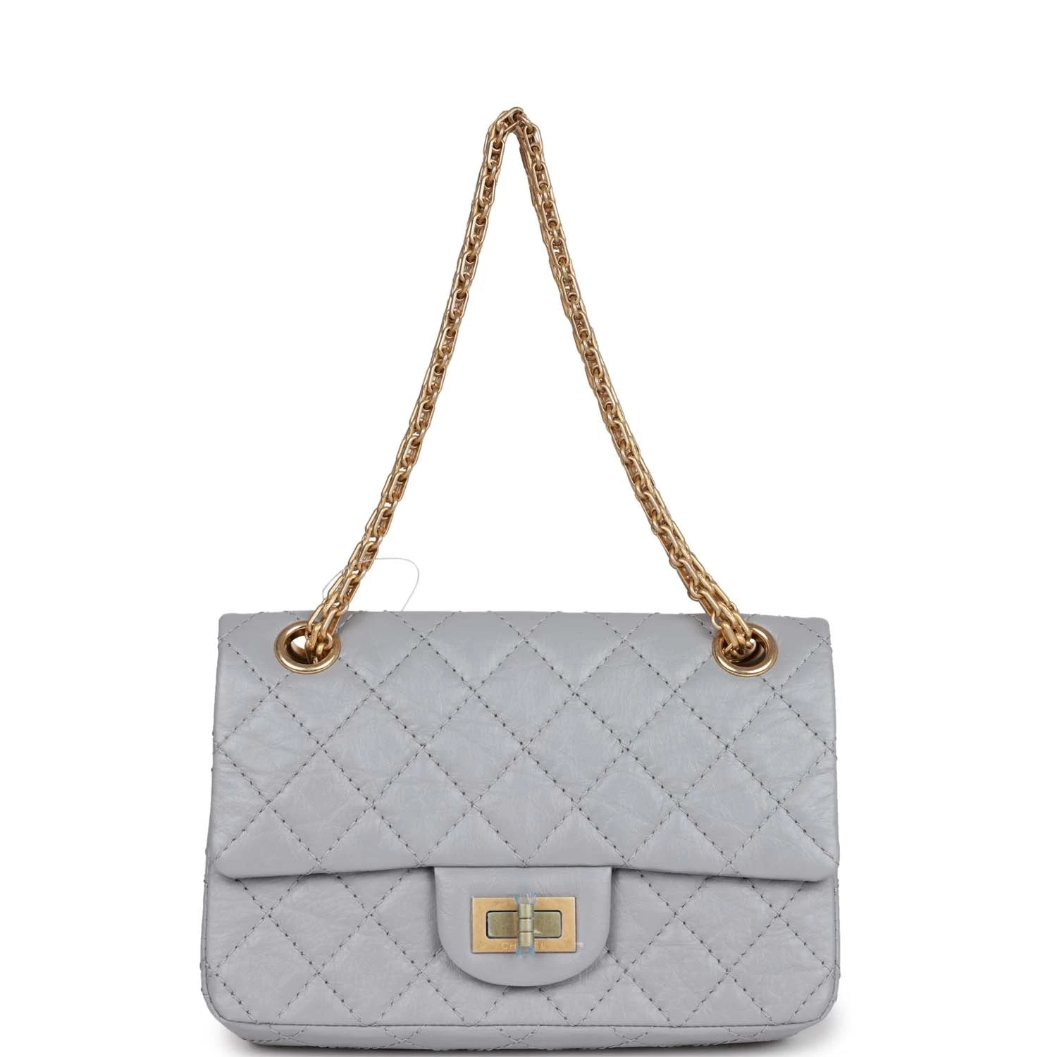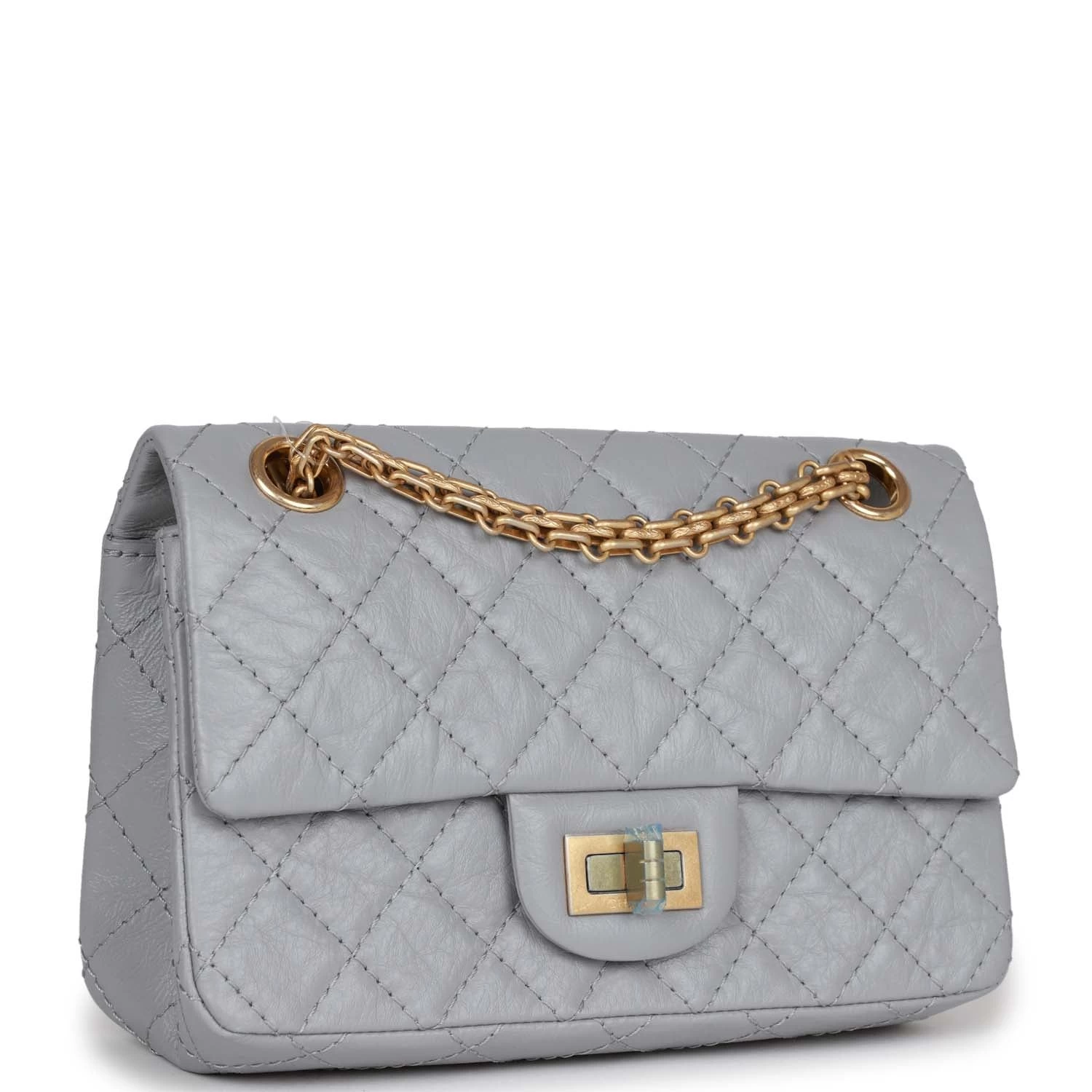 This Chanel Mini Reissue 224 2.55 Single Flap bag is in Grey Aged Calfskin with Antique Gold hardware, front flap with a mademoiselle turnlock closure, half moon back pocket, and interwoven gold tone chain link.