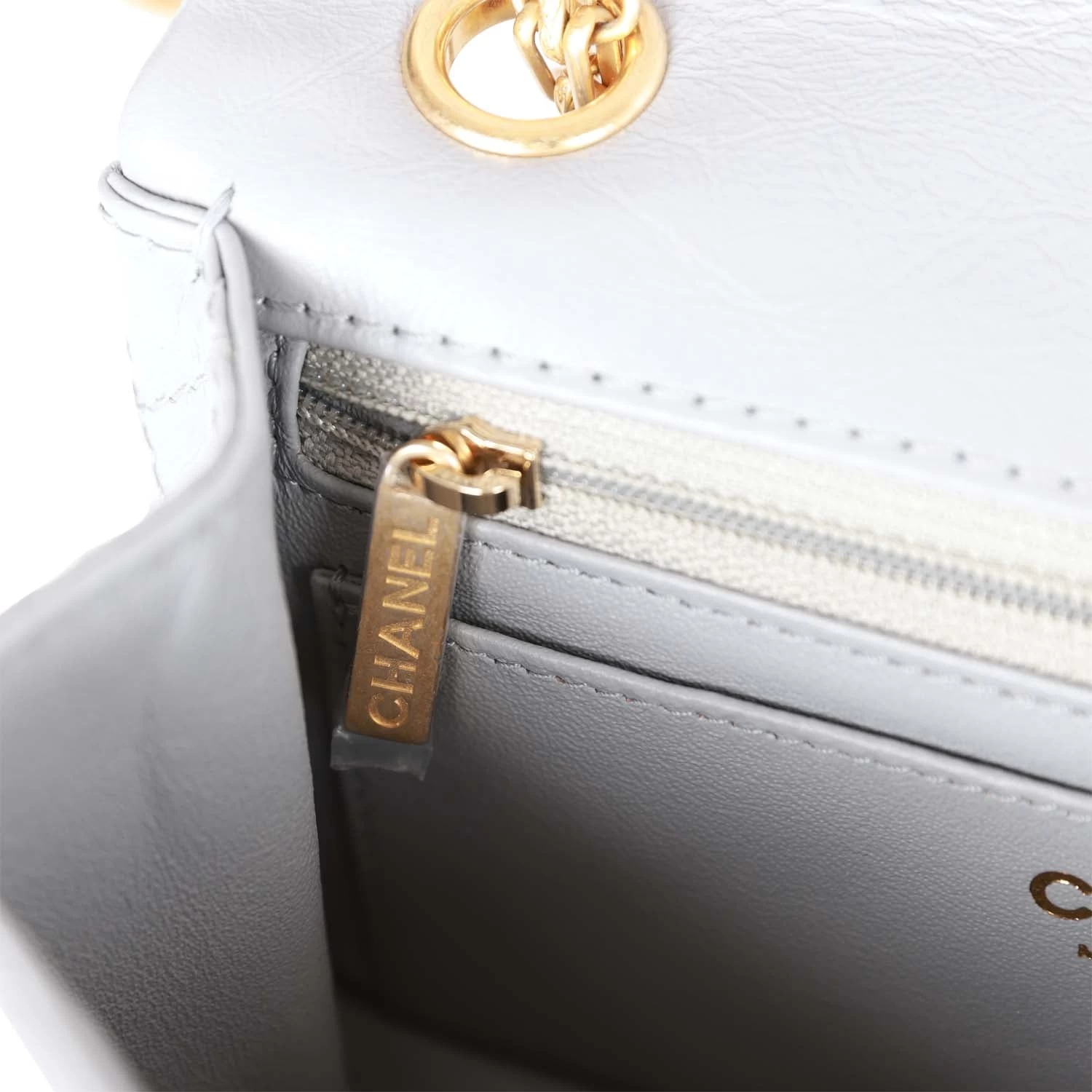 The interior is lined in grey leather with one zip pocket and one slip pocket on the back wall.