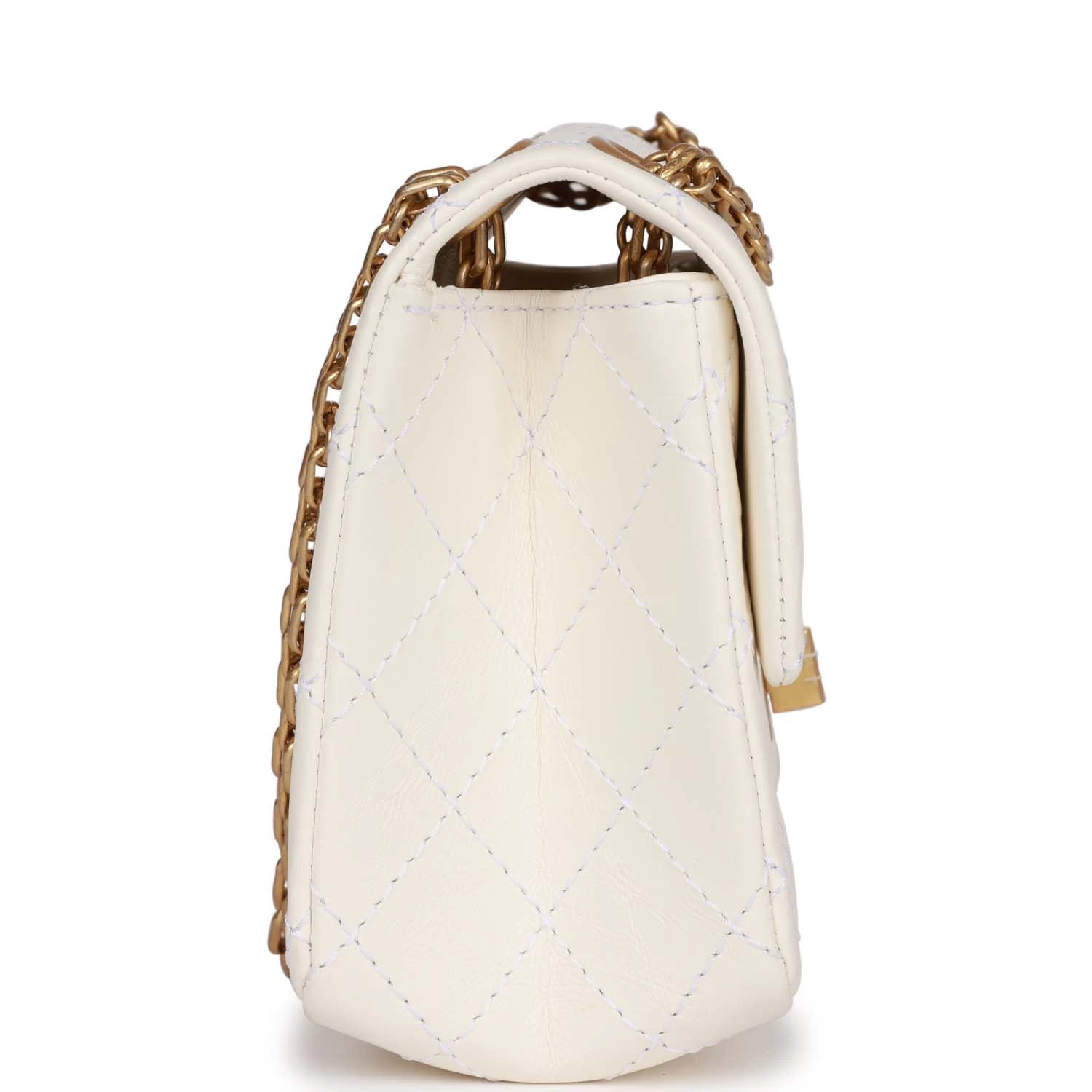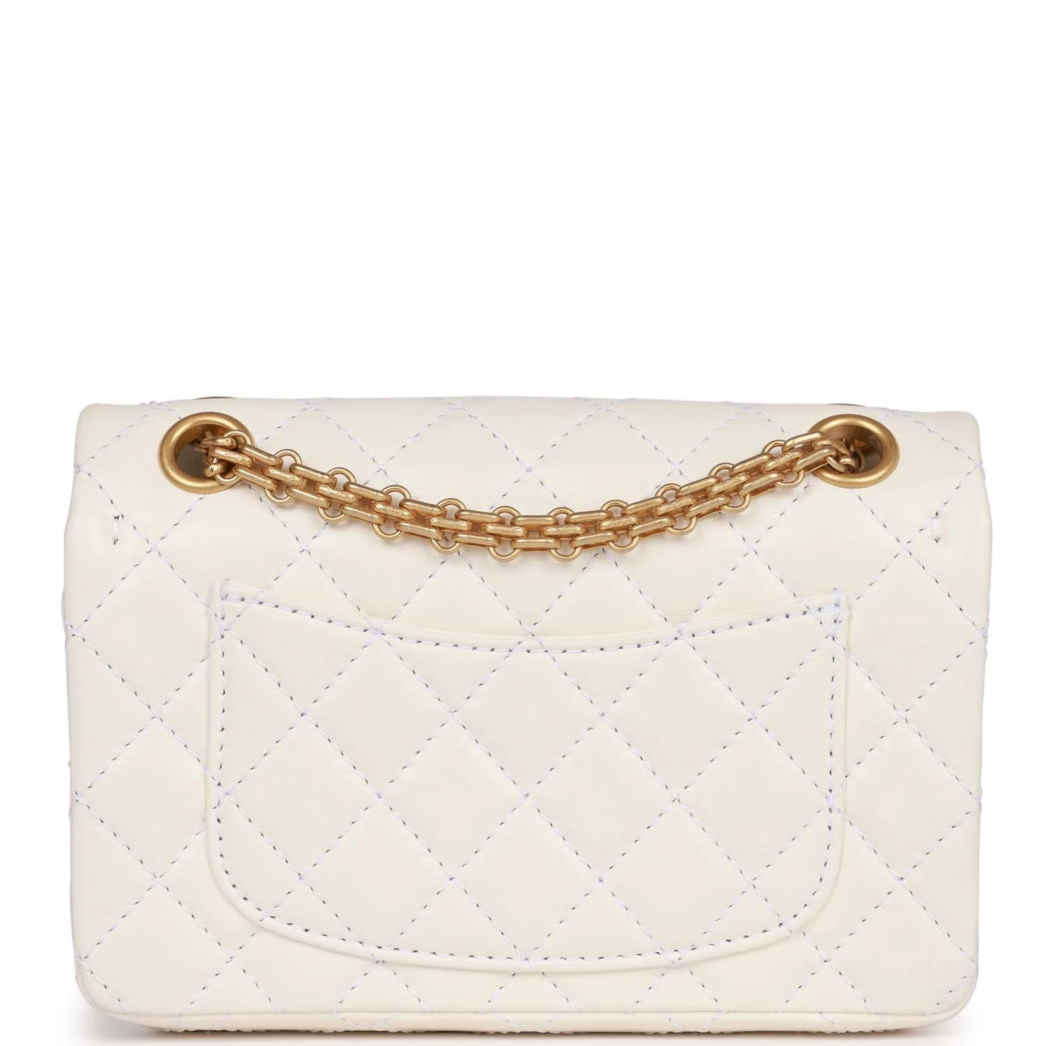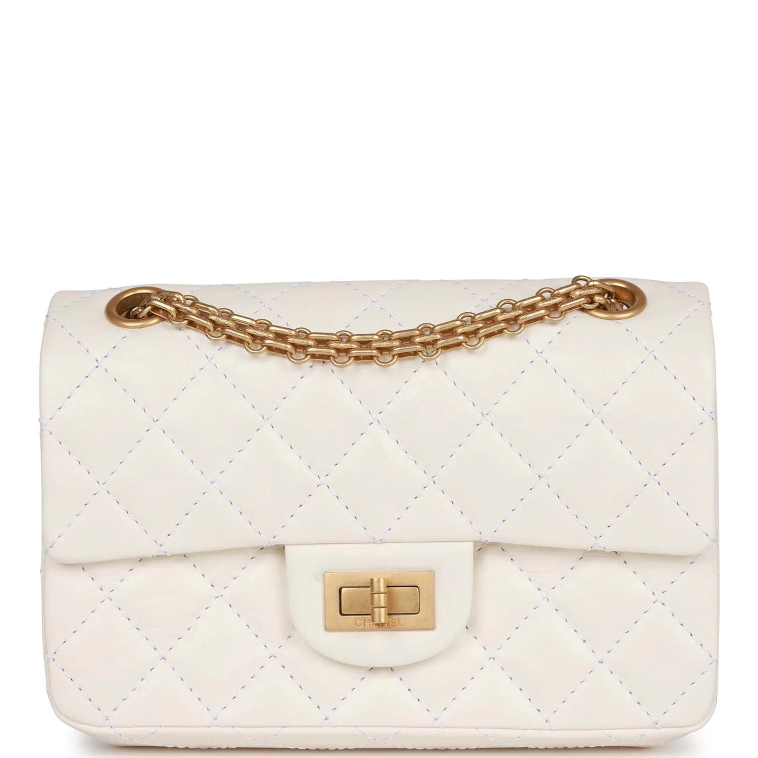 This Mini Reissue 224 2.55 Single Flap bag is in White aged calfskin with antique gold hardware, front flap with a mademoiselle turnlock closure, half moon back pocket, and interwoven gold tone chain link.