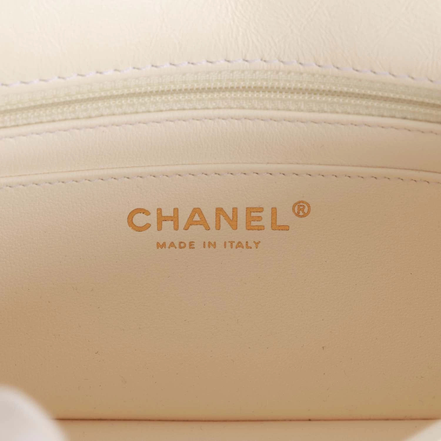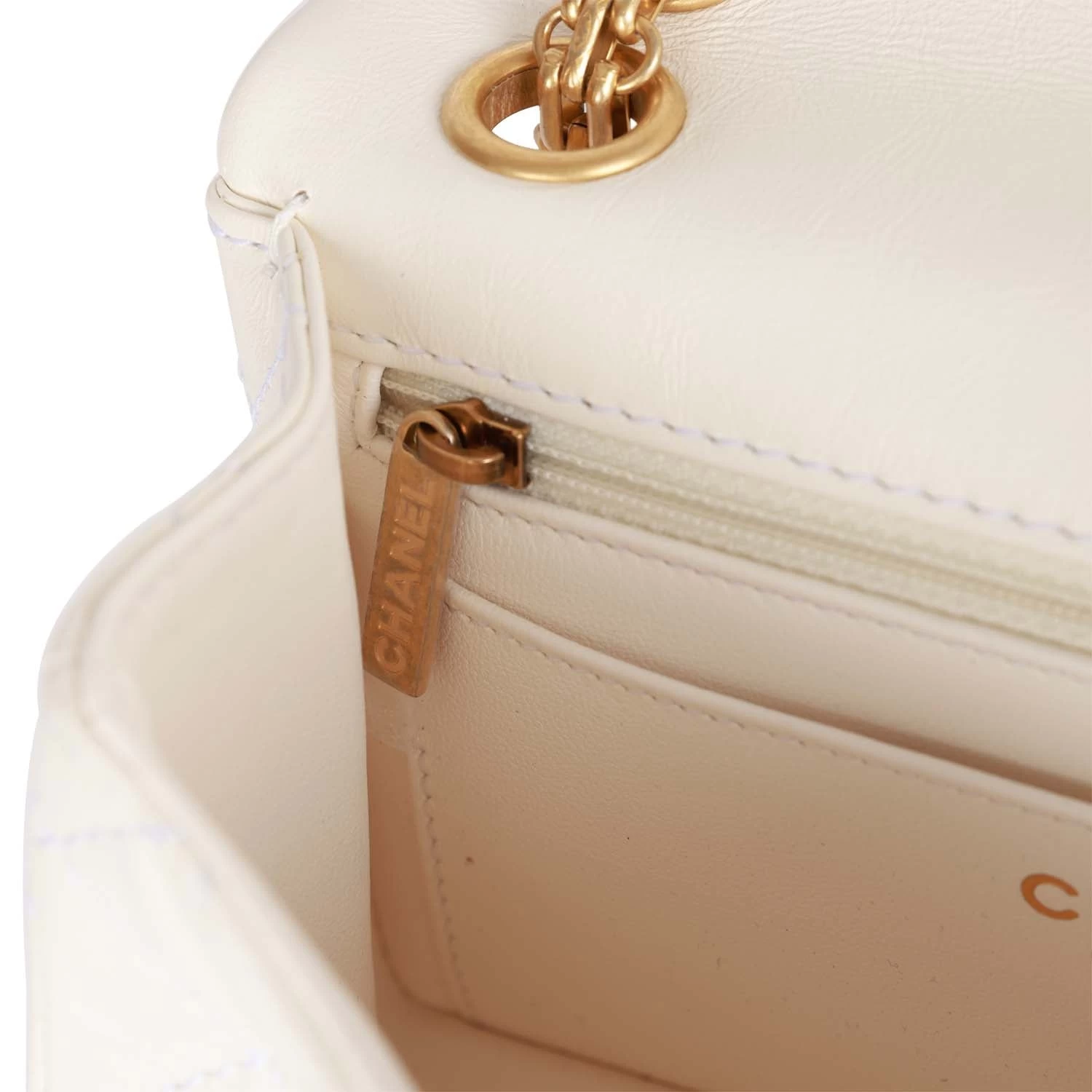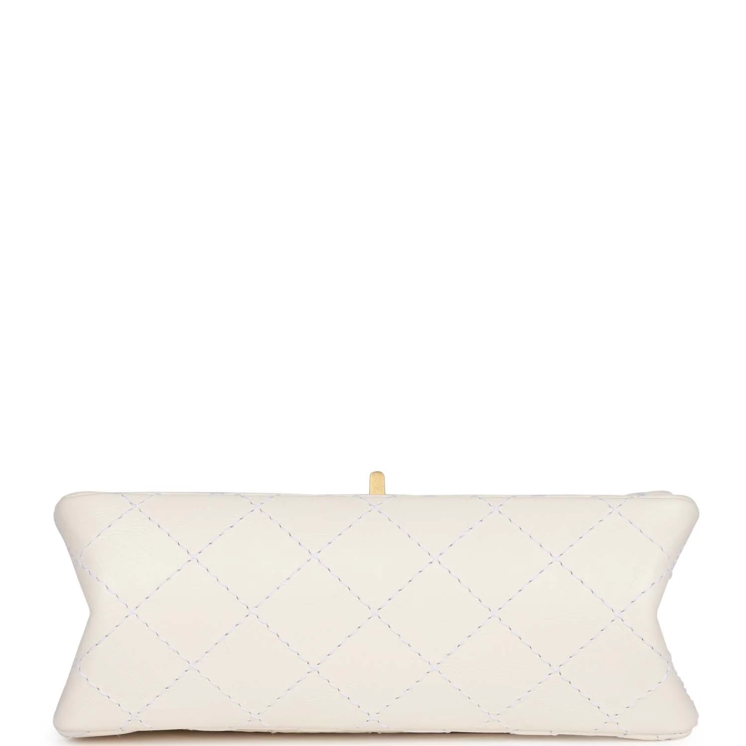 This Mini Reissue 224 2.55 Single Flap bag is in White aged calfskin with antique gold hardware, front flap with a mademoiselle turnlock closure, half moon back pocket, and interwoven gold tone chain link.