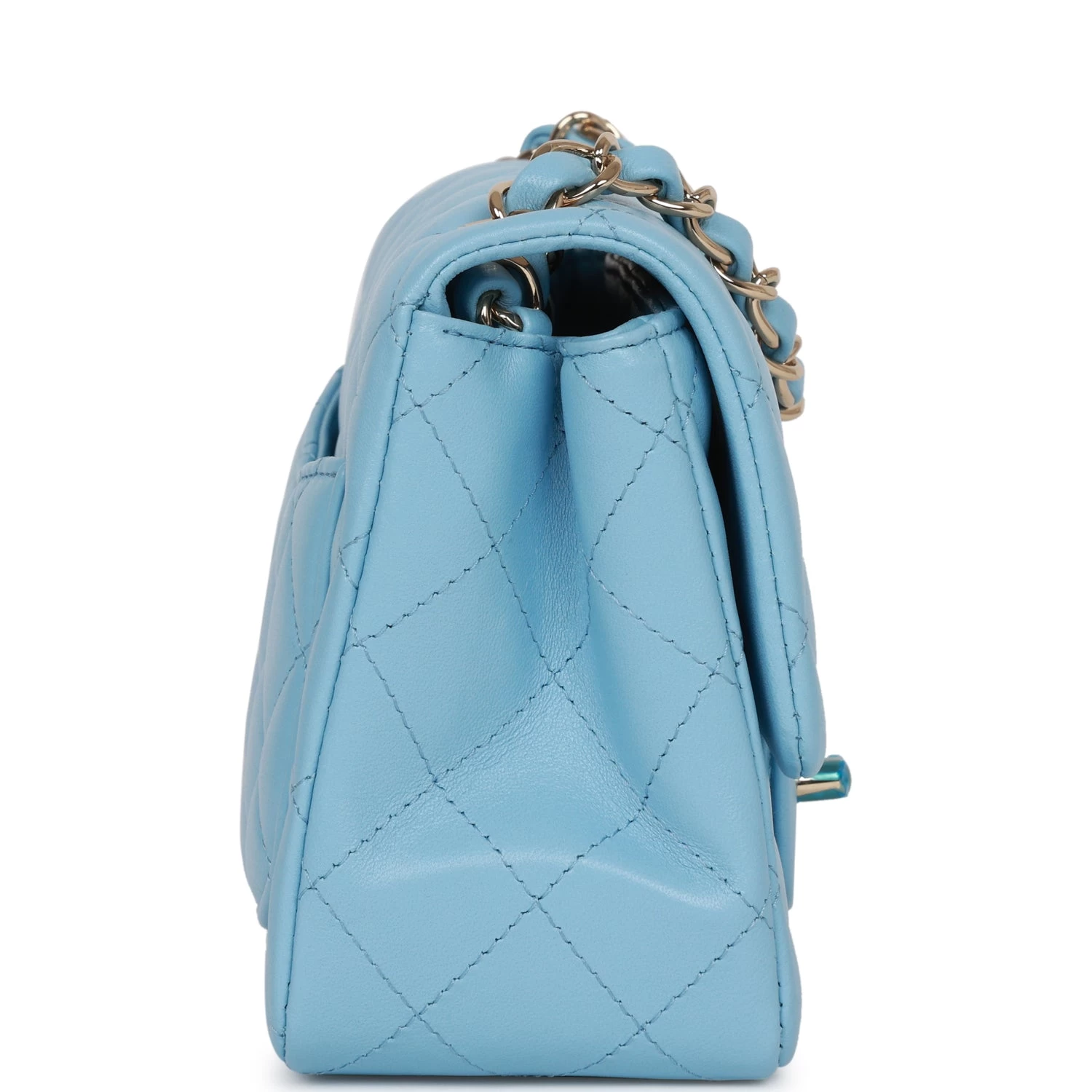 This Mini Square flap bag is in blue lambskin with light gold tone hardware and has a front flap with signature CC turnlock closure, rear half moon pocket and single interwoven blue leather and light gold tone chain link shoulder/crossbody strap.