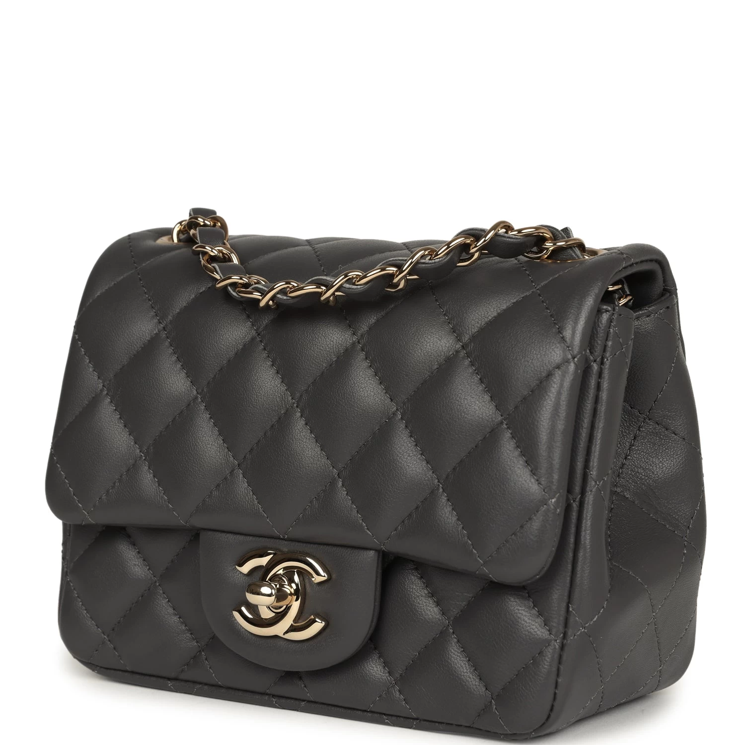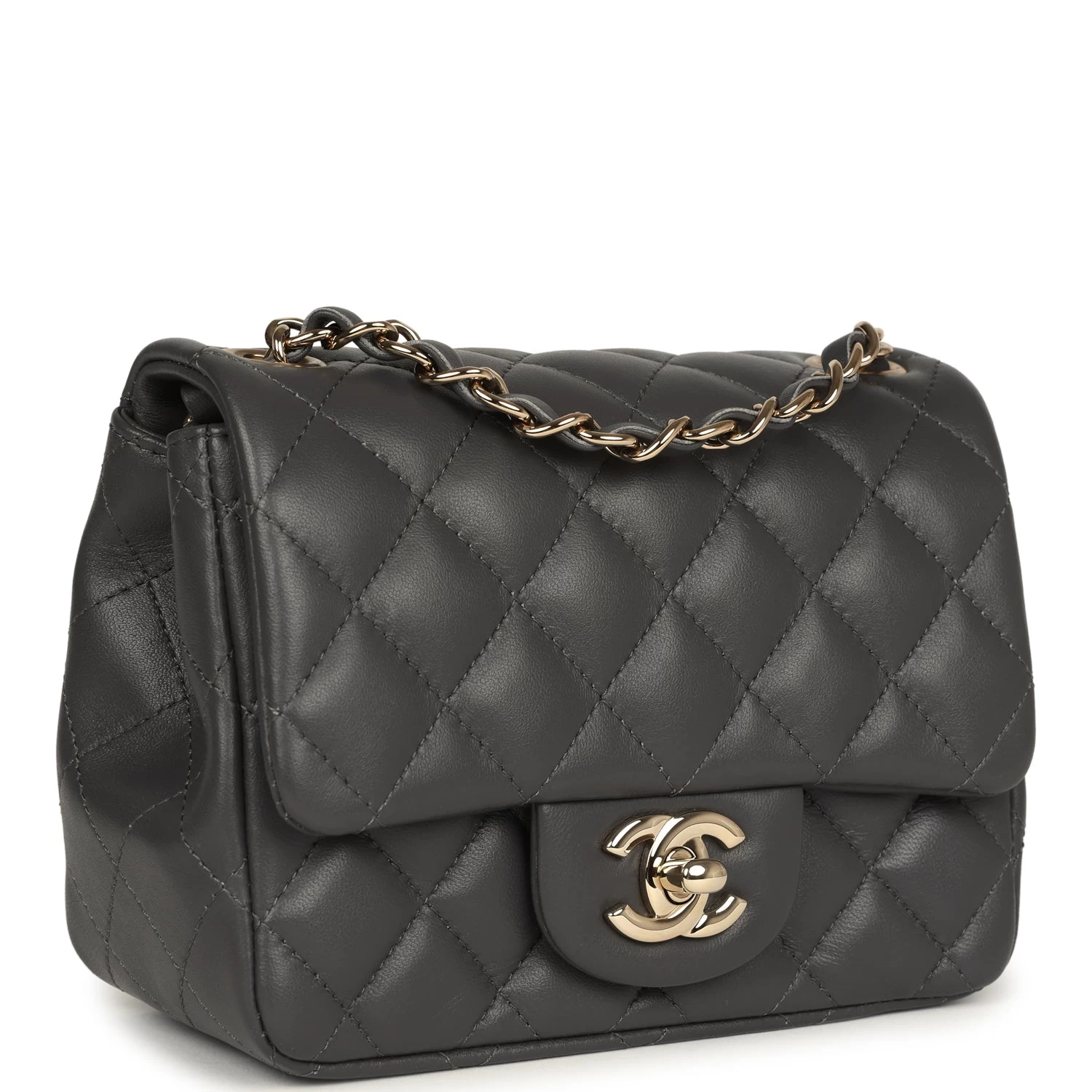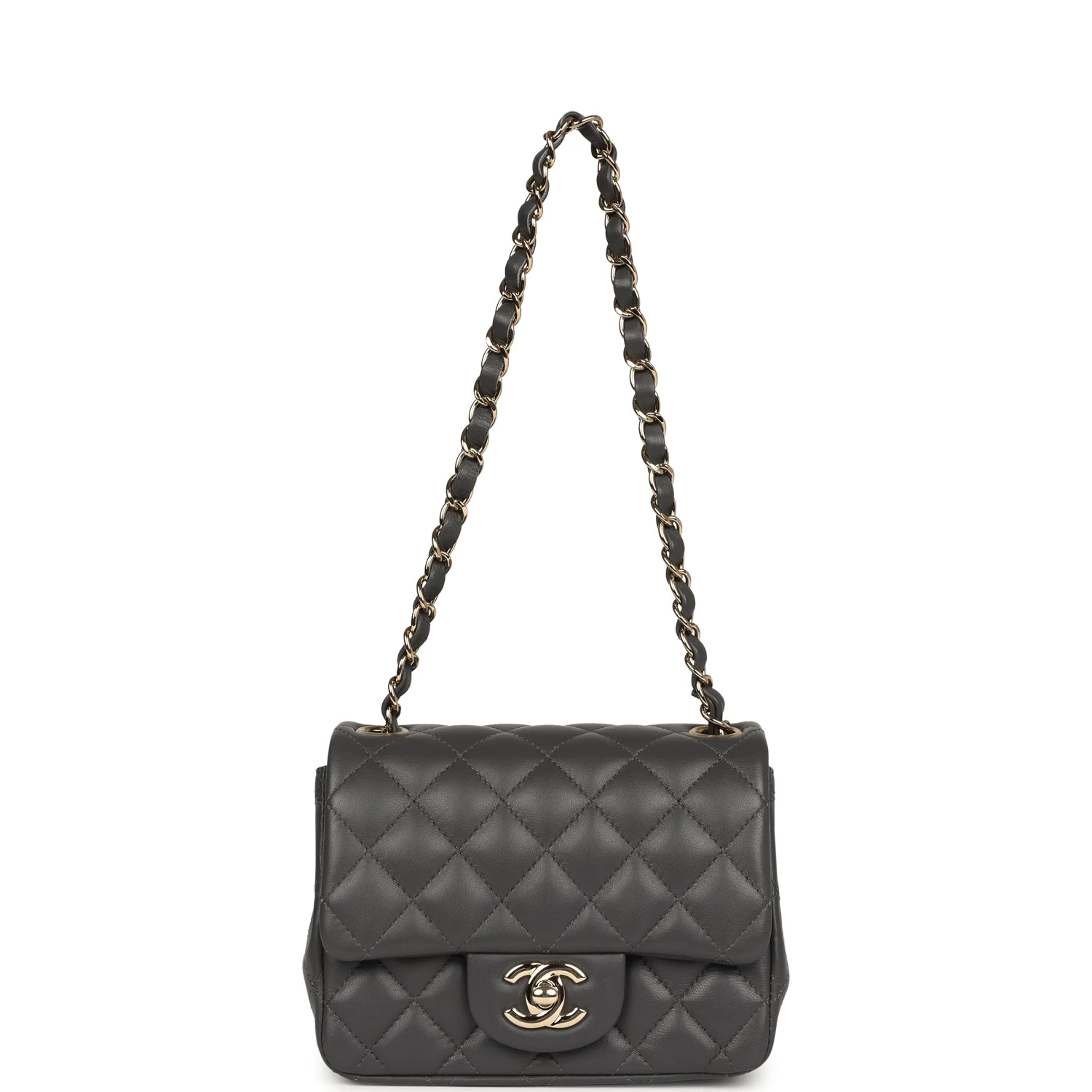 This Chanel Classic mini square flap bag is in dark grey lambskin with light gold tone hardware and has a front flap with signature CC turnlock closure, tonal stitching, rear half moon pocket and single interwoven dark grey leather and light gold tone chain link shoulder/crossbody strap.