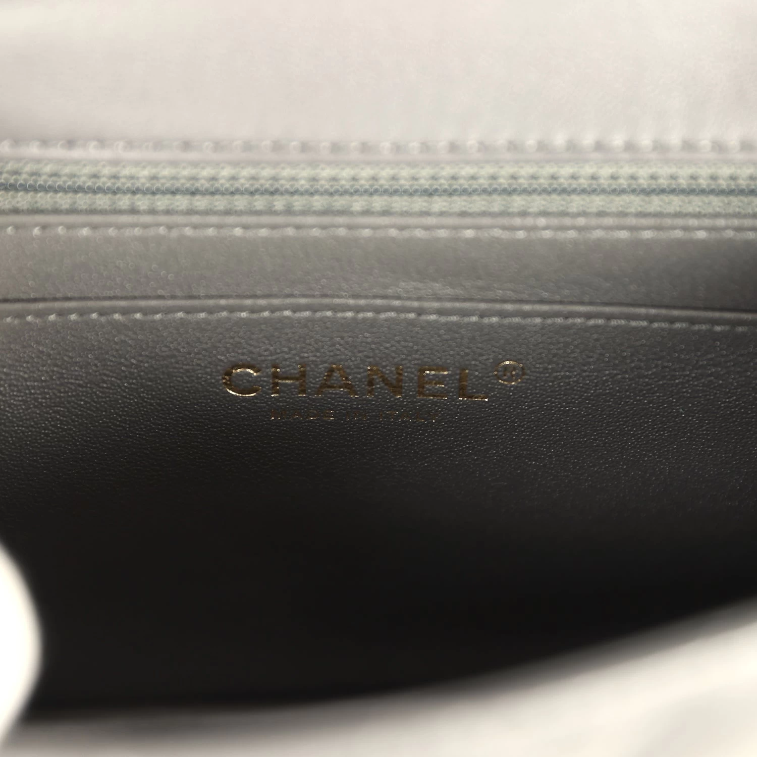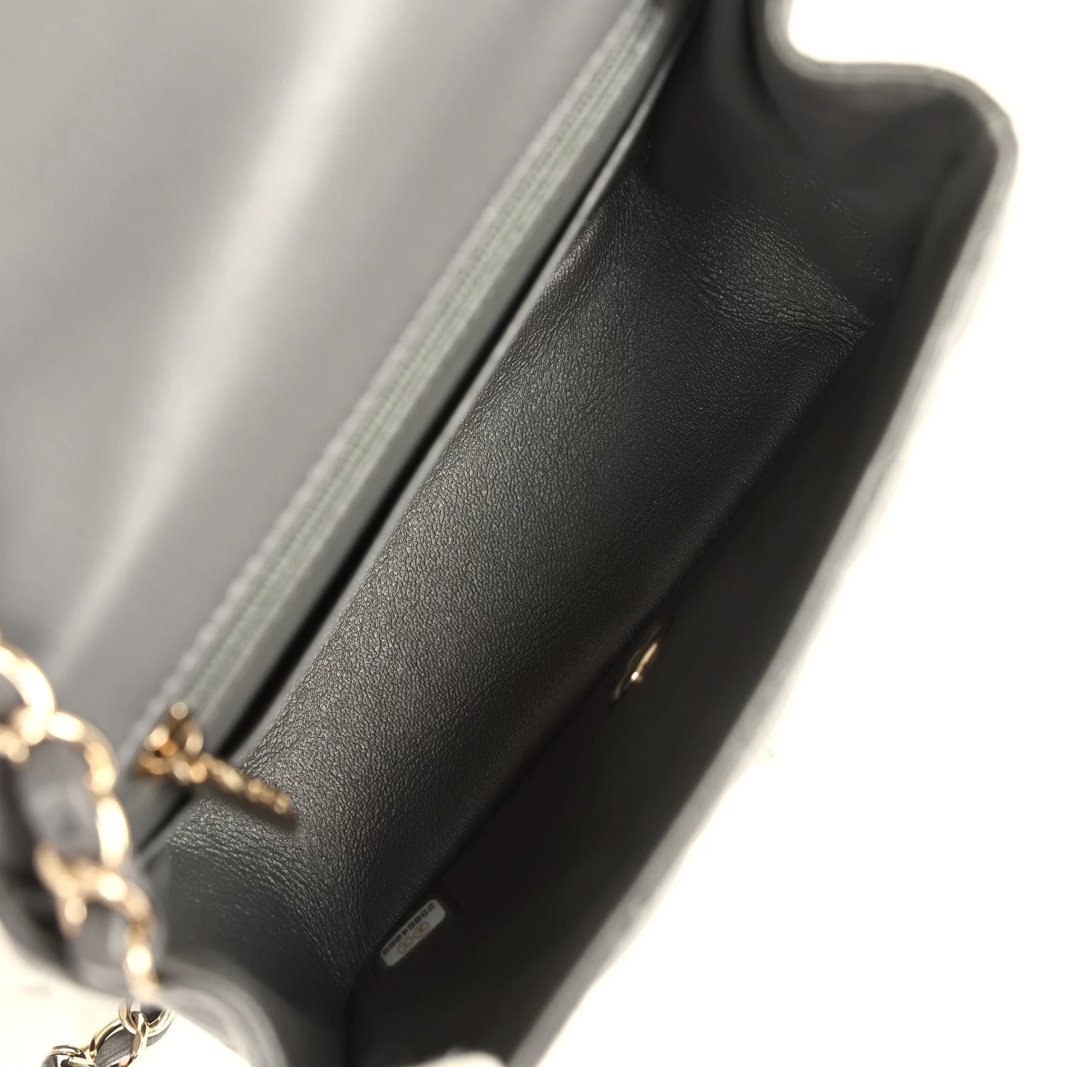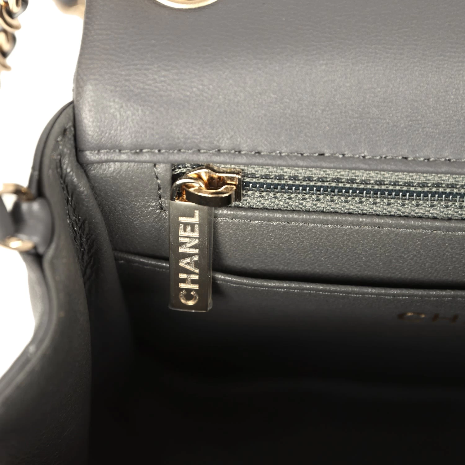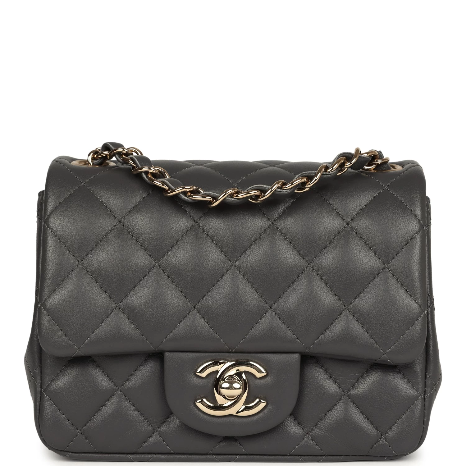This Chanel Classic mini square flap bag is in dark grey lambskin with light gold tone hardware and has a front flap with signature CC turnlock closure, tonal stitching, rear half moon pocket and single interwoven dark grey leather and light gold tone chain link shoulder/crossbody strap.