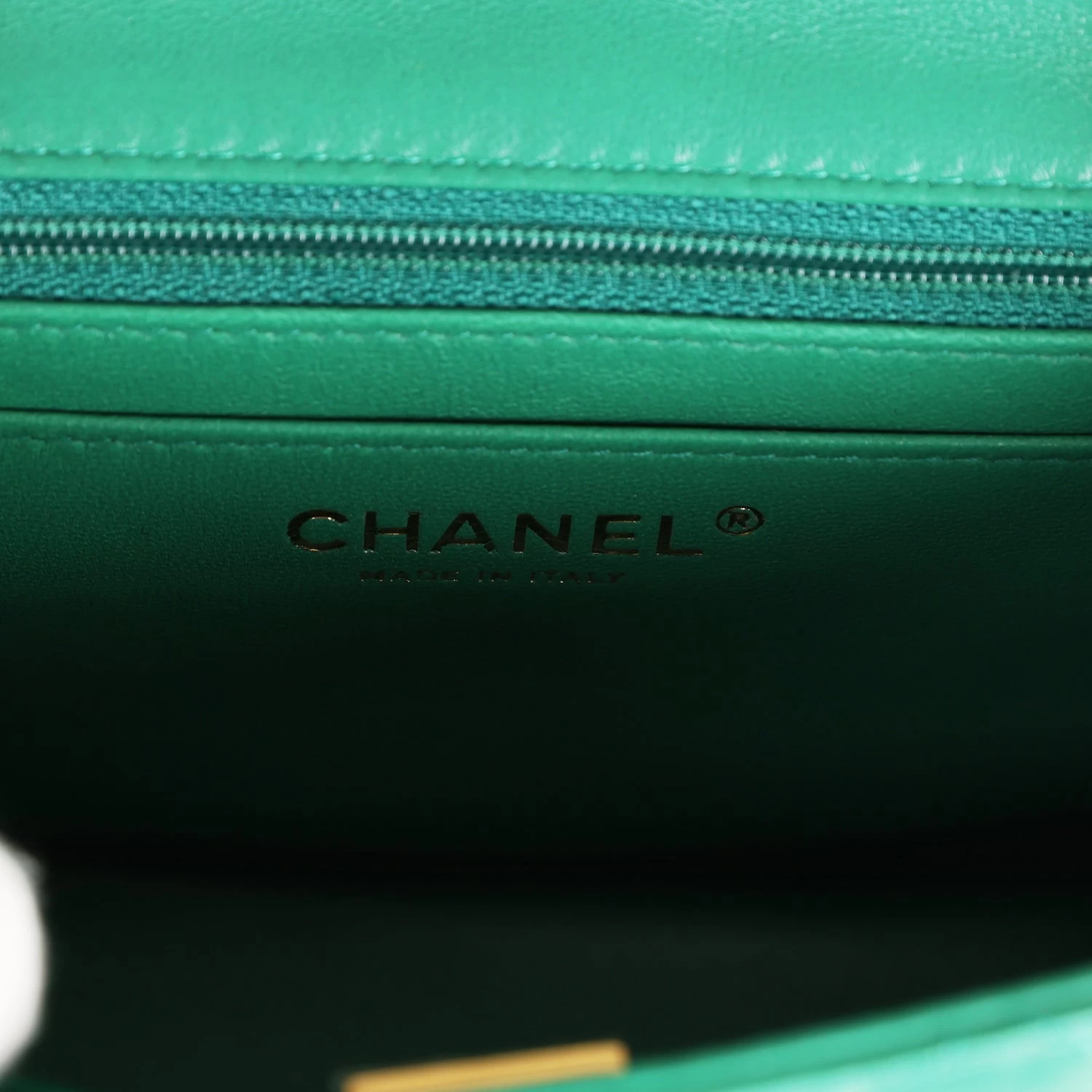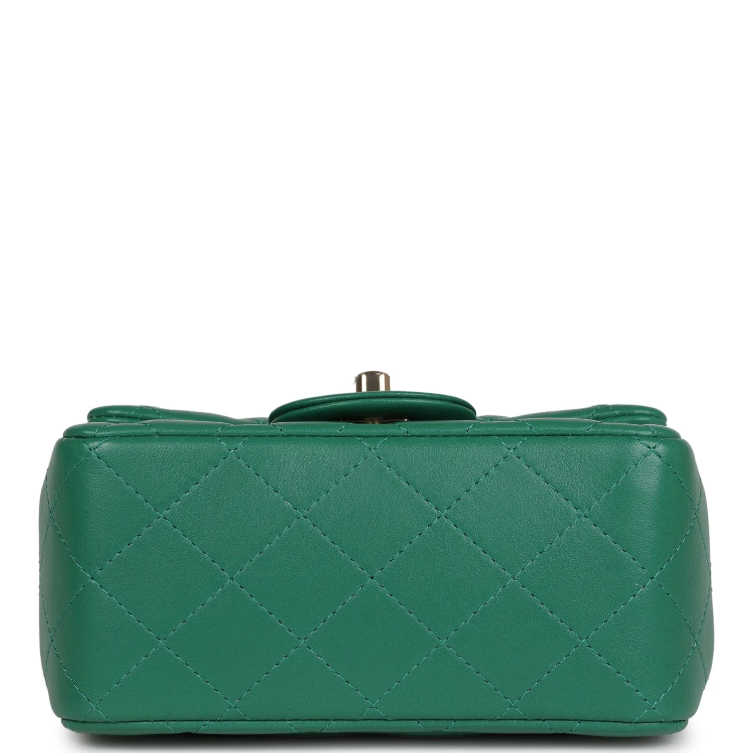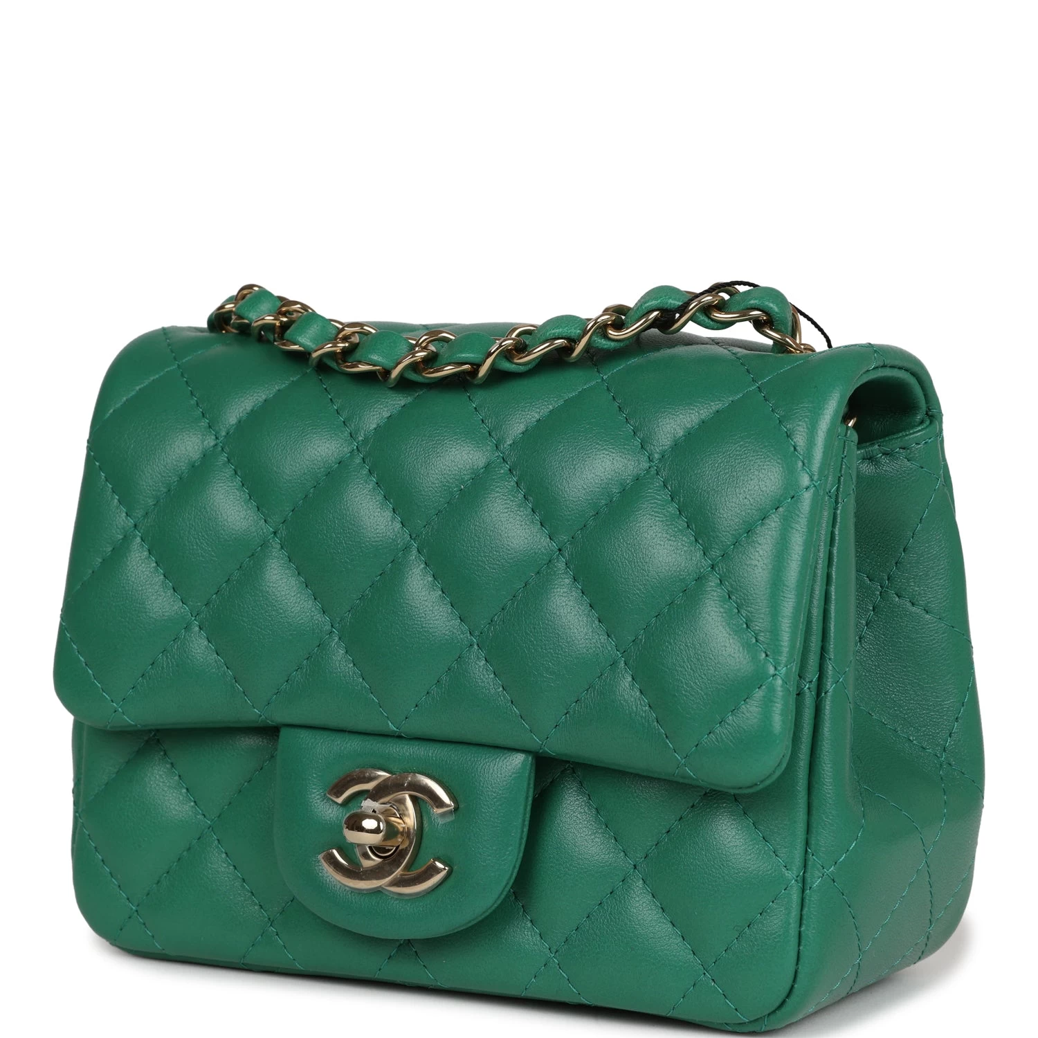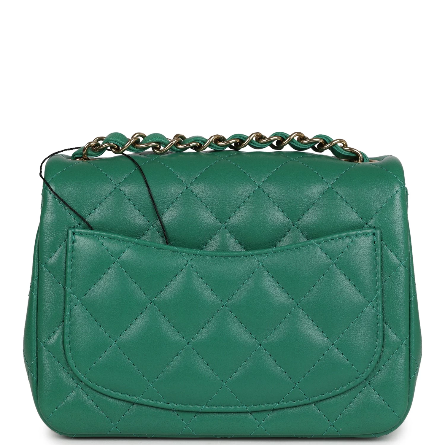 This Mini Square Flap Bag is in Green Lambskin with Gold Hardware, tonal stitching, front flap with CC turnlock closure, half-moon back pocket, and an interwoven green leather and gold chainlink/crossbody strap.