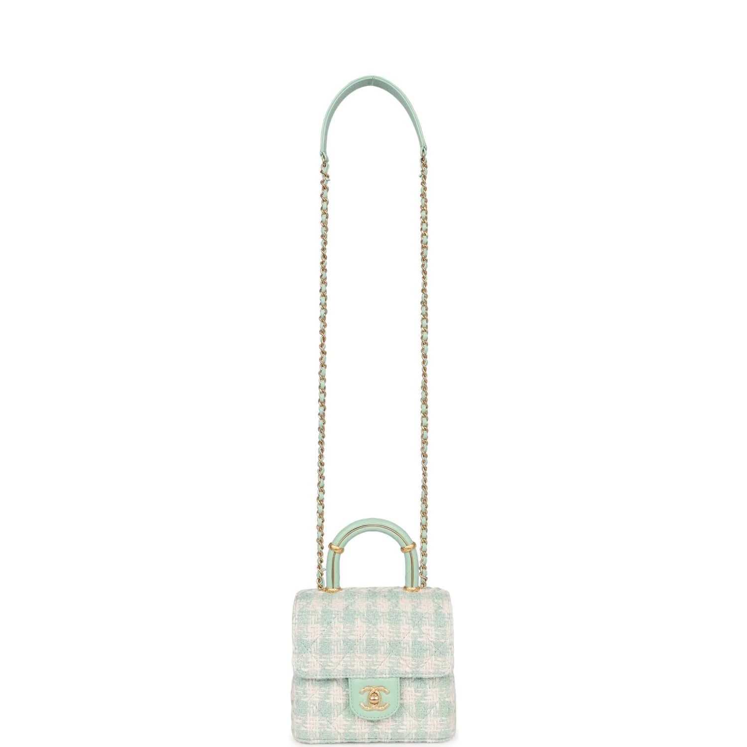 This Mini Square flap bag is of Turquoise and Ecru Tweed with antique gold tone hardware and has a front flap with signature CC turnlock closure, rear slip pocket, single interwoven Turquoise leather and antique gold tone chain link shoulder/crossbody strap.