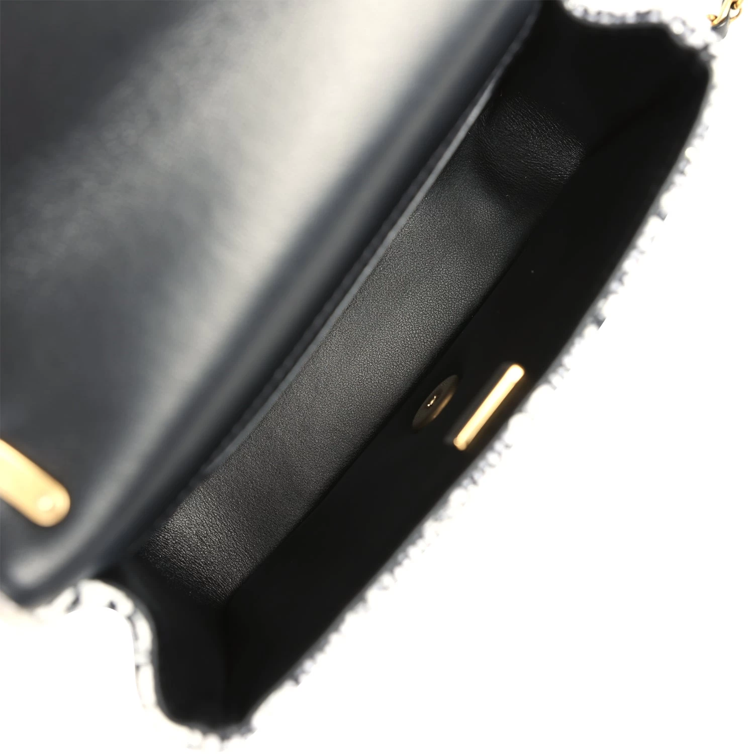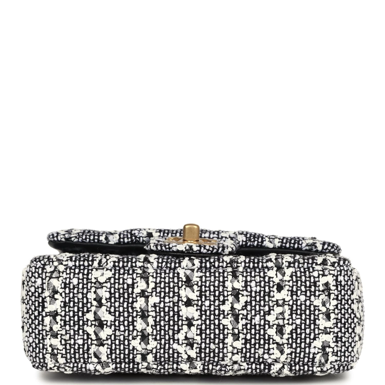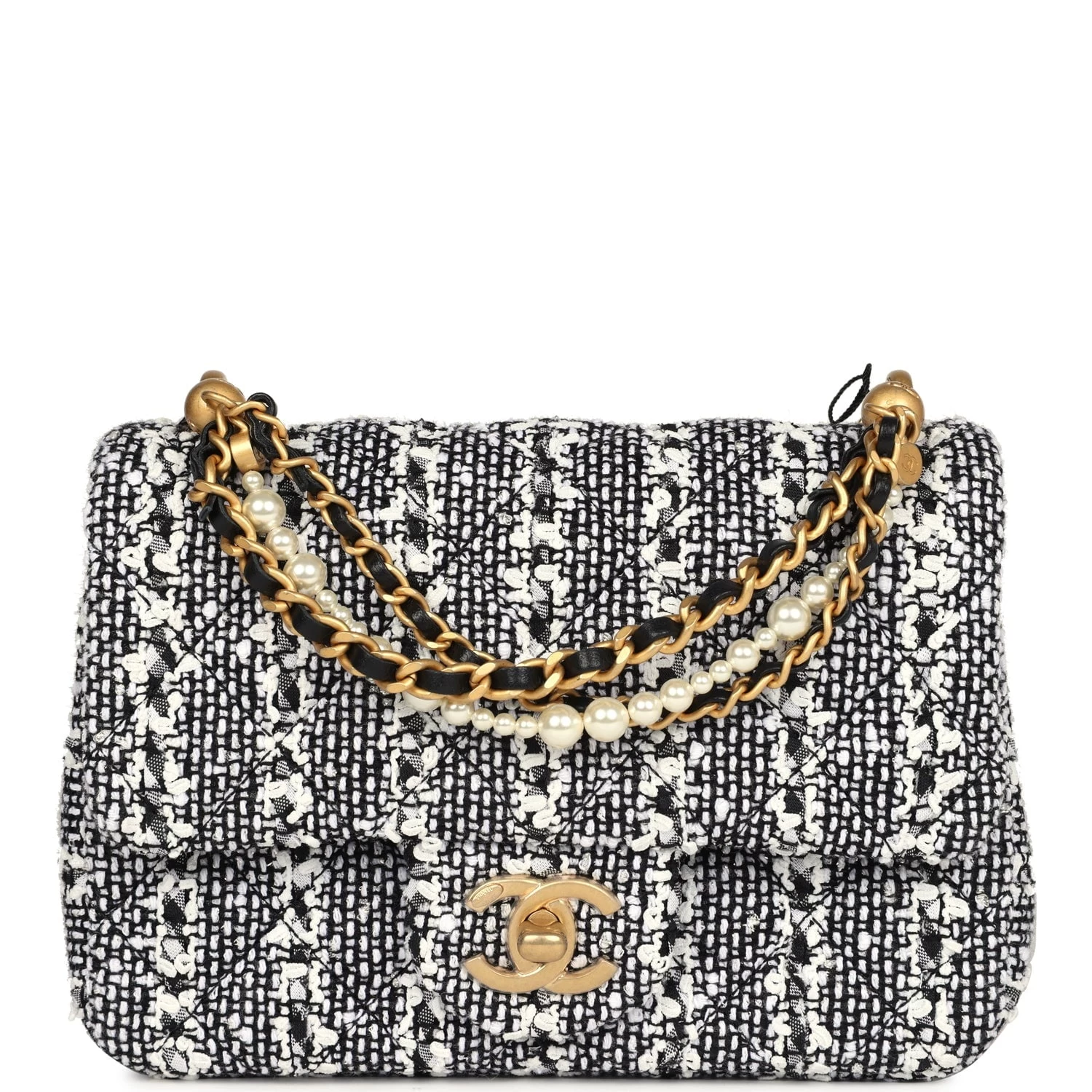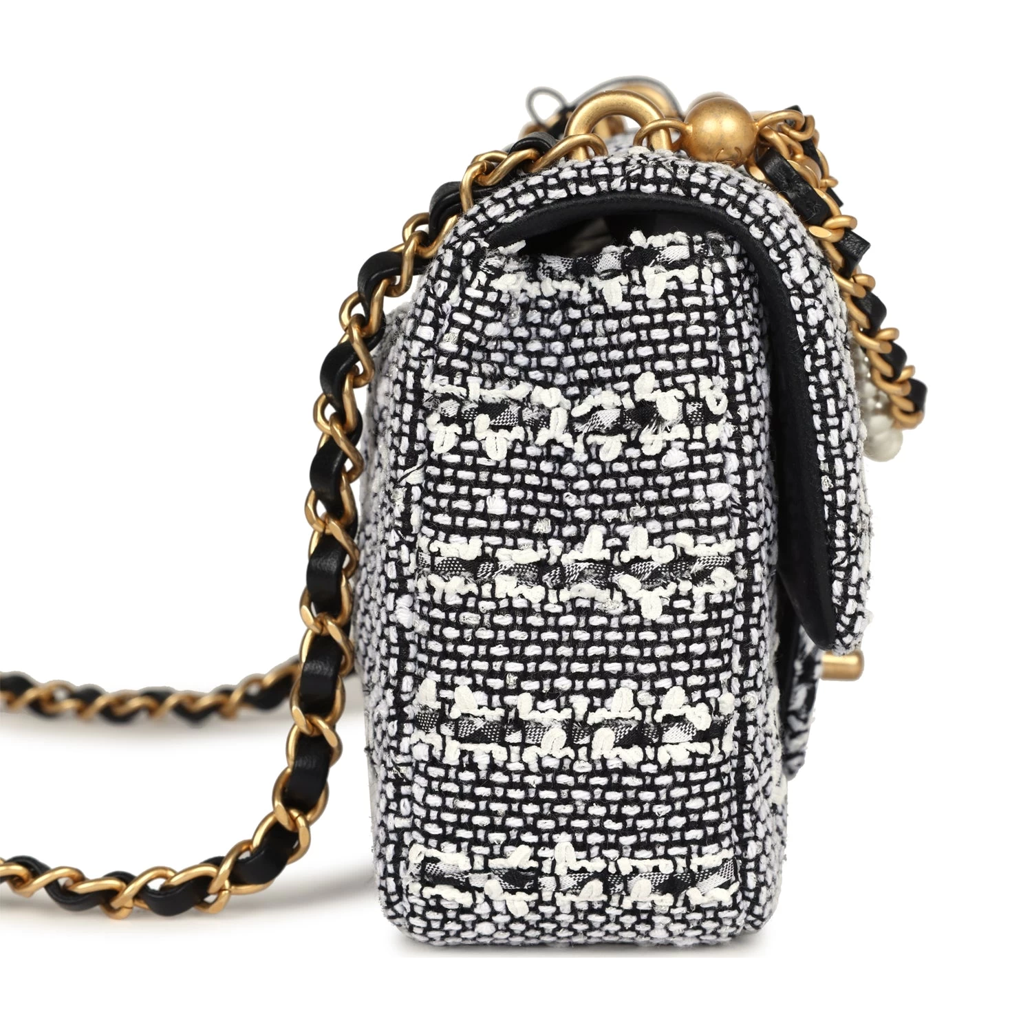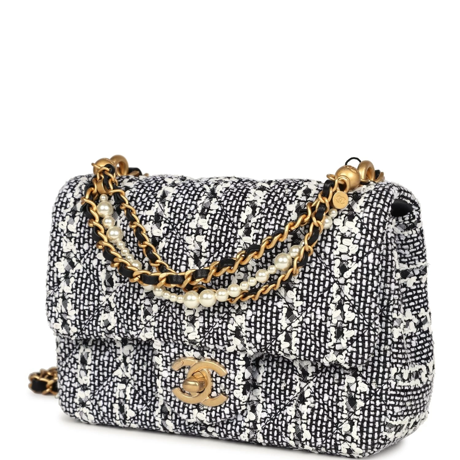This mini square pearl flap bag is in black and white sequin tweed fabric with brushed gold hardware. This bag has a front flap with signature CC turnlock closure, tonal stitching, rear half moon pocket, a brushed gold tone chain and pearl chain top handle, and one single interwoven black leather and brushed gold tone chain link shoulder/crossbody strap.