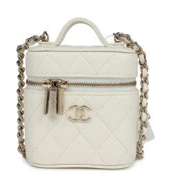 This Chanel mini top handle vanity case in quilted White caviar leather with Gold tone hardware, features tonal stitching, vertical shaped vanity case Gold tone CC logo on front of vanity case, zip around zipper closure, leather top handle, and a long Gold interwoven with White leather shoulder/crossbody strap.