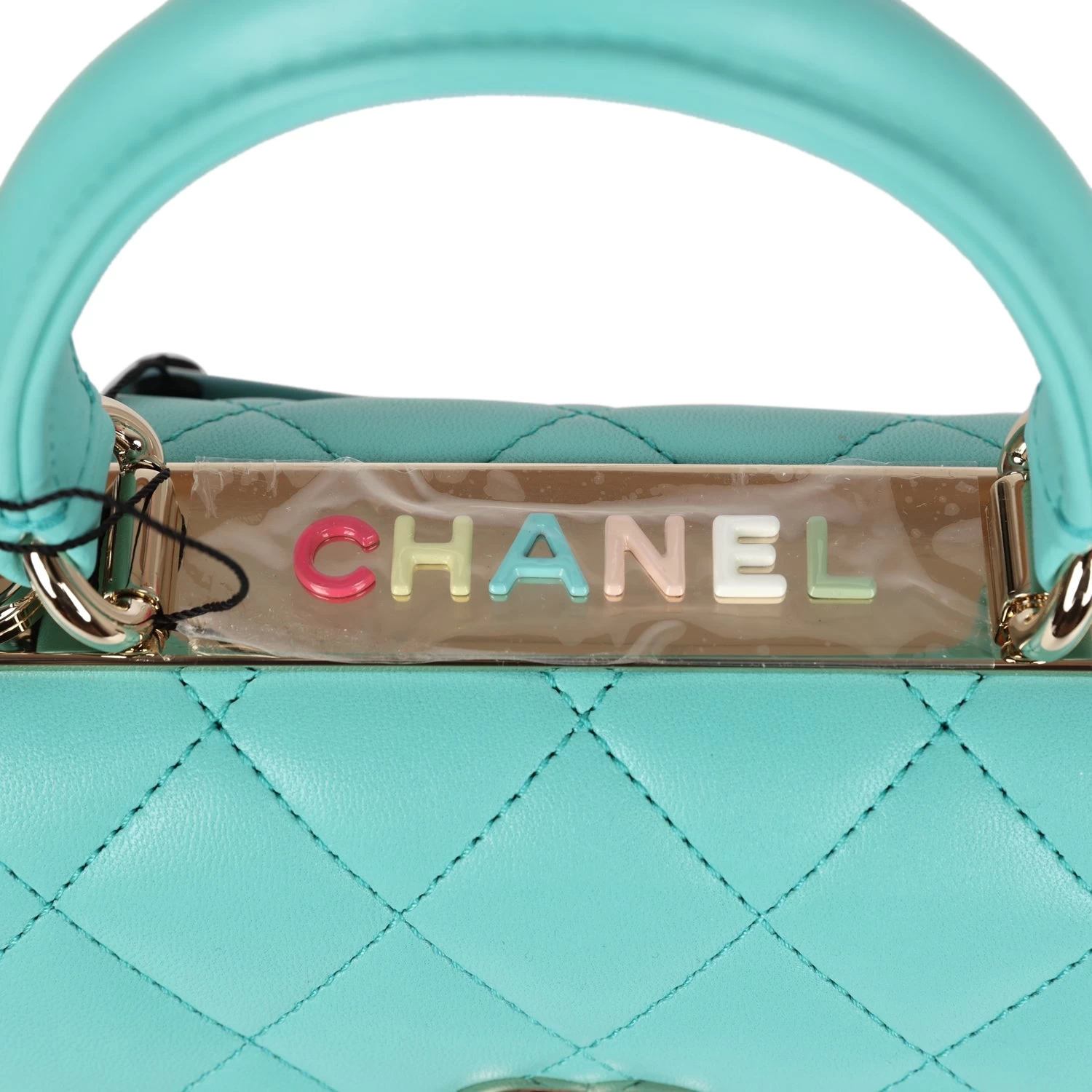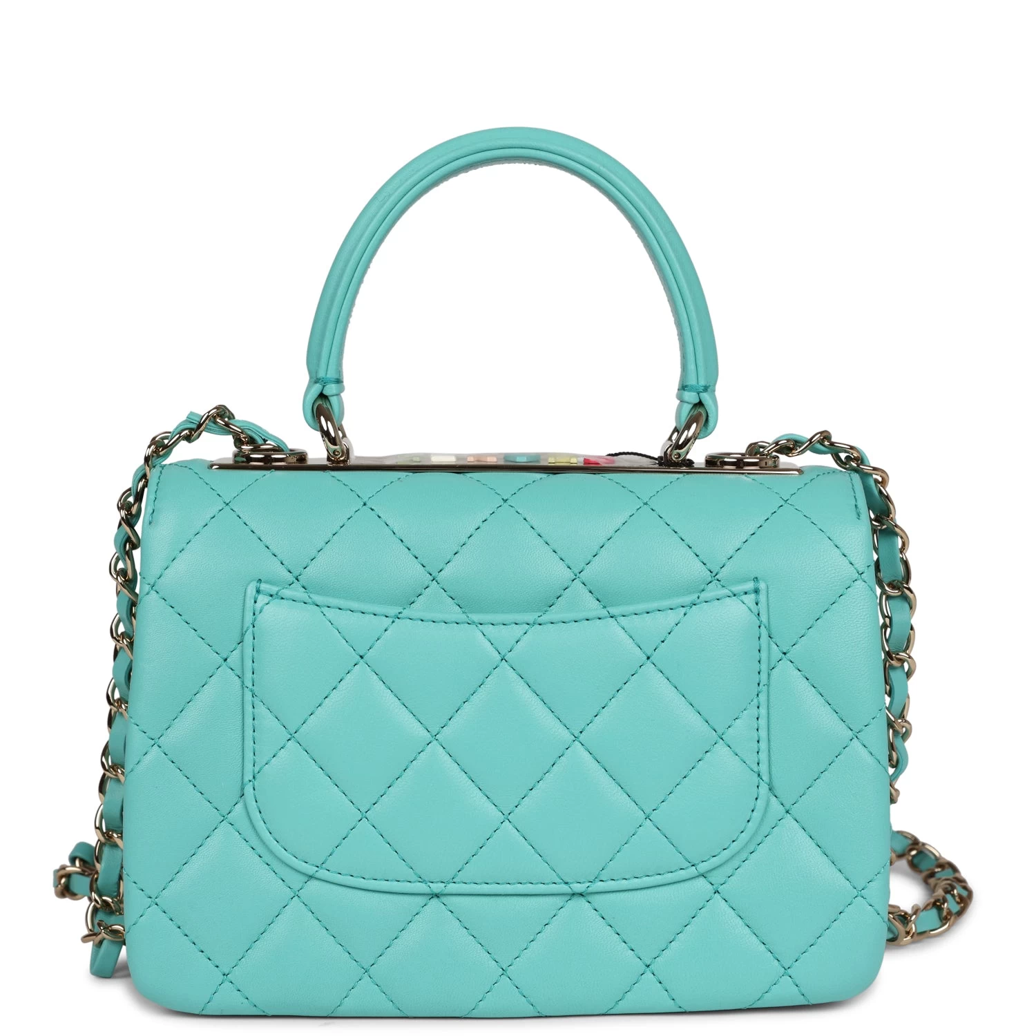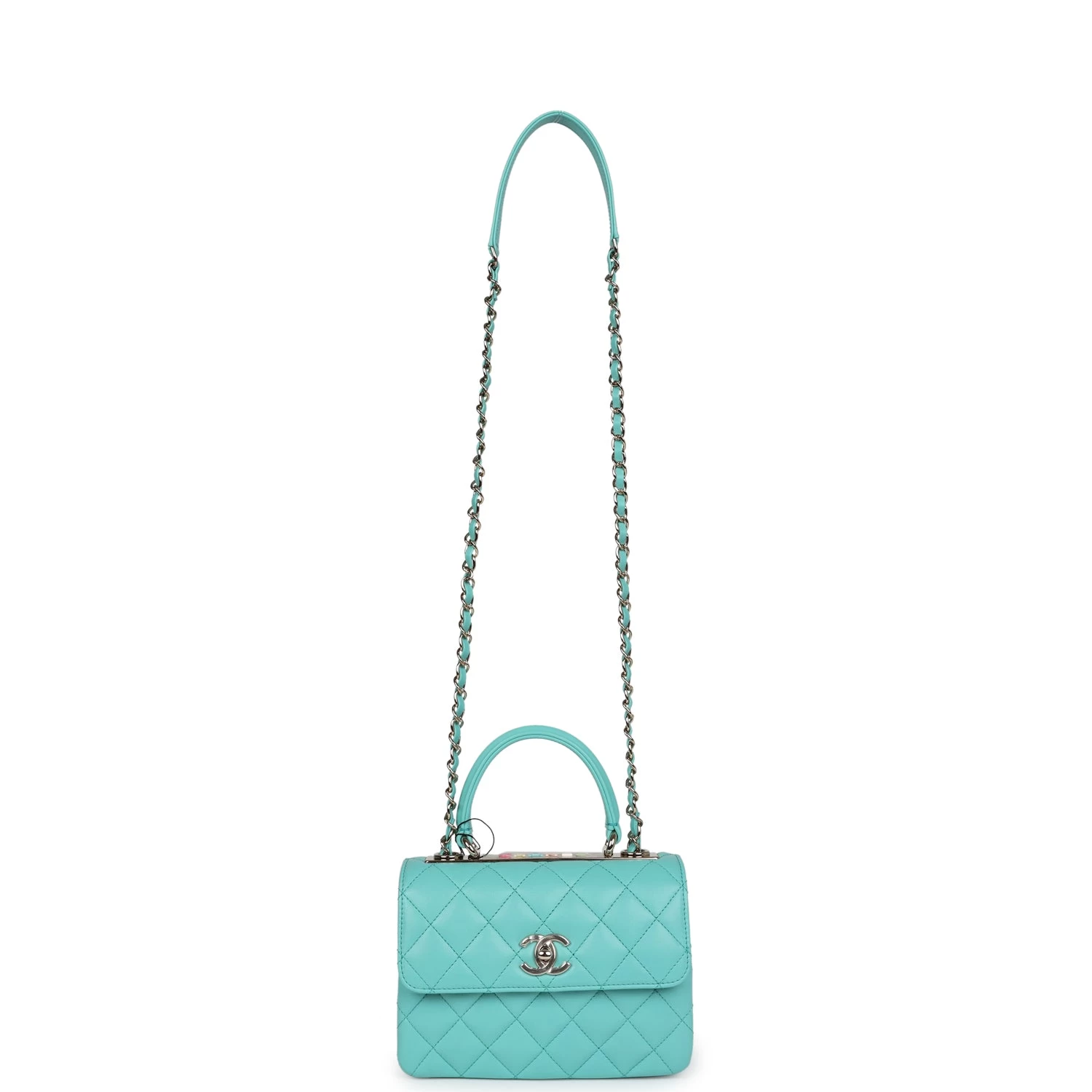This Mini Trendy CC bag is in Turquoise lambskin leather with light gold tone hardware and has a front flap with signature CC turnlock closure, rear half moon pocket, single interwoven Turquoise leather and light gold tone chain link shoulder/crossbody strap and top handle.