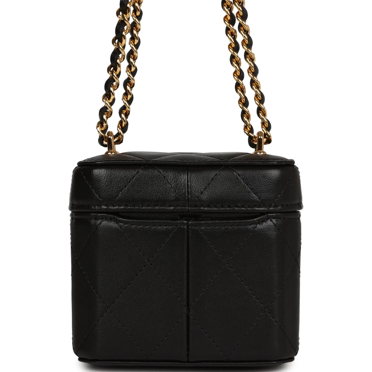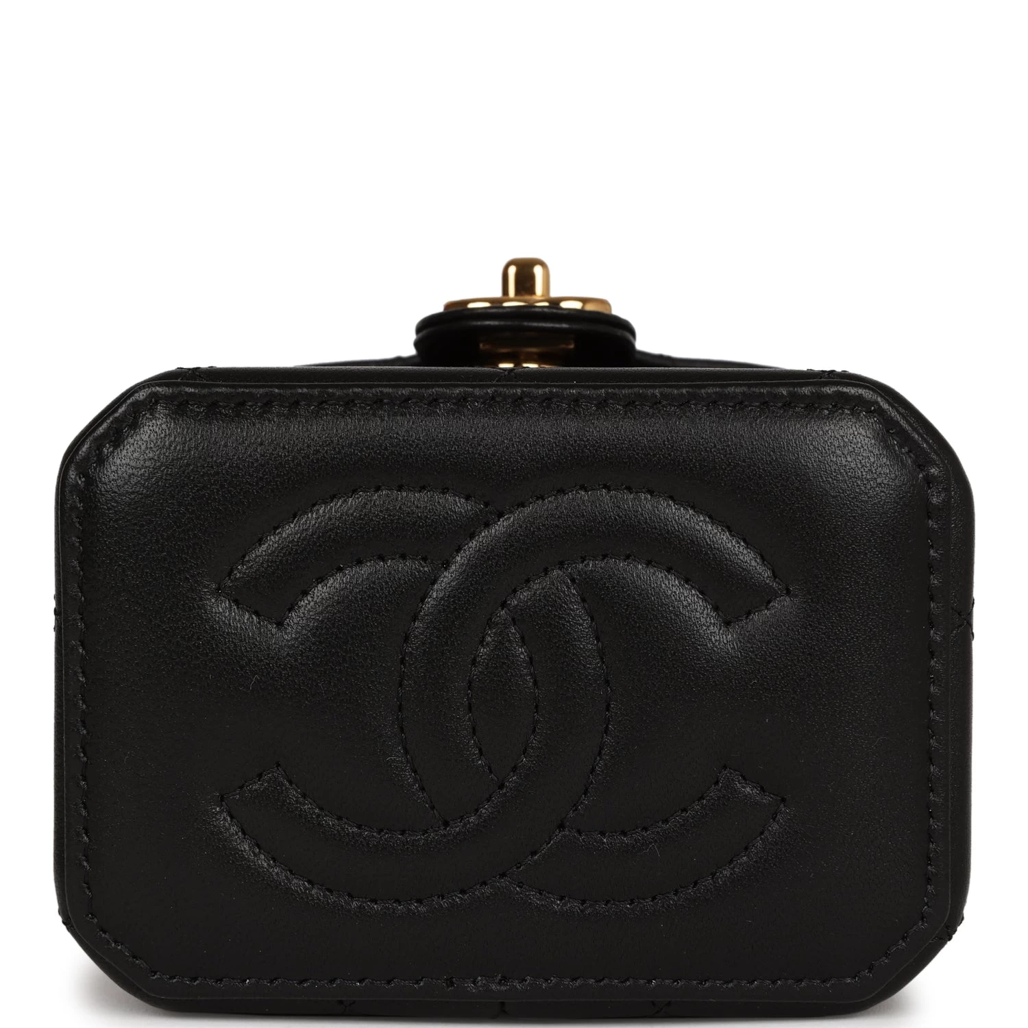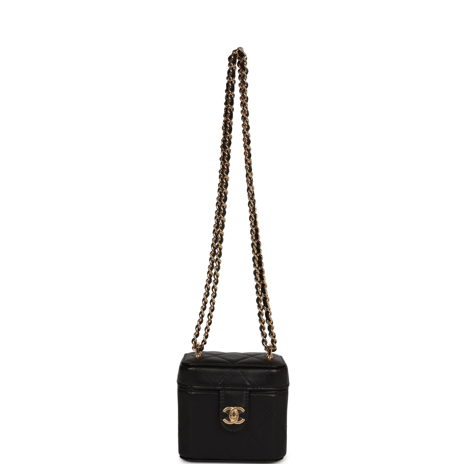 This Mini Vanity Case Chain Clutch is in Black Quilted Lambskin leather with Gold hardware, features a box-like design, CC tab turnlock closure, interwoven gold with black leather shoulder/crossbody strap, and a stitched CC on bottom bag.