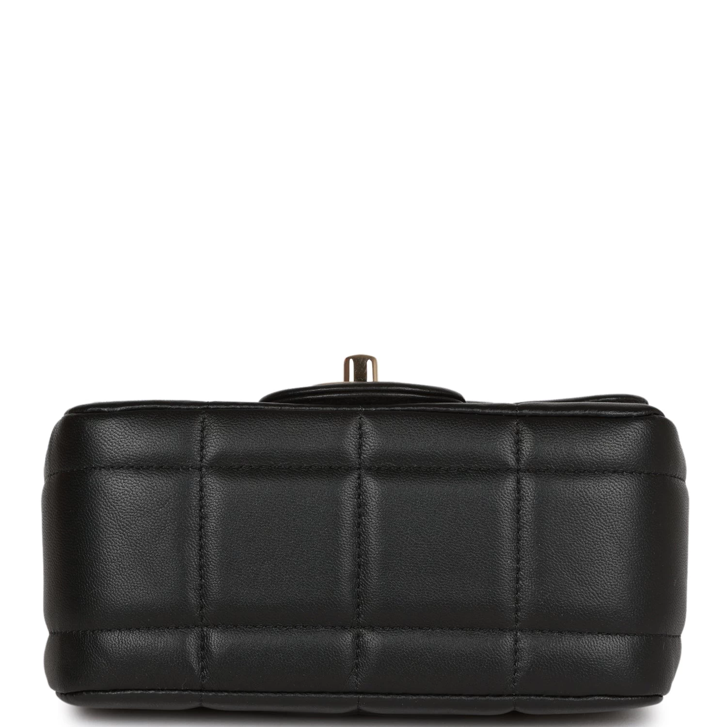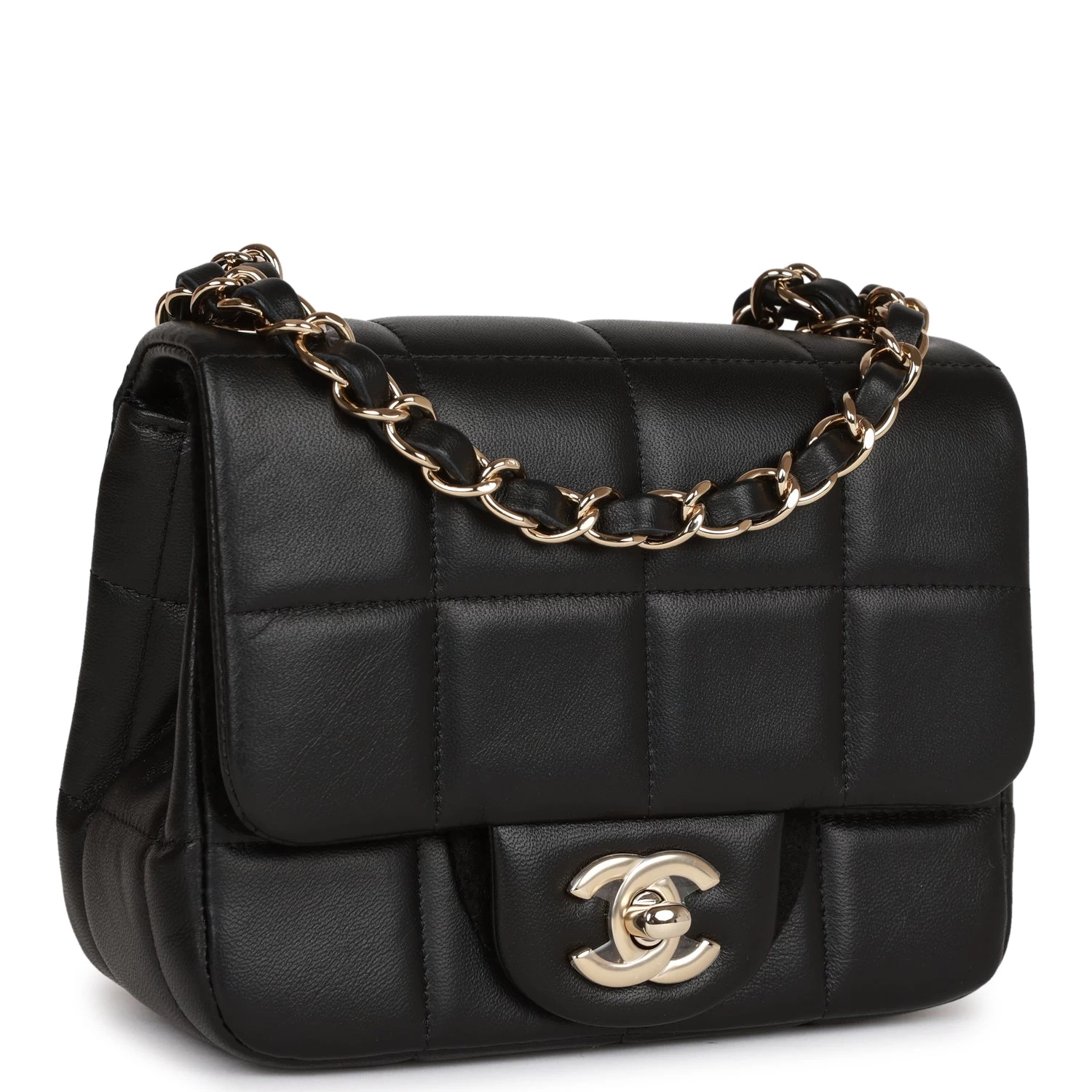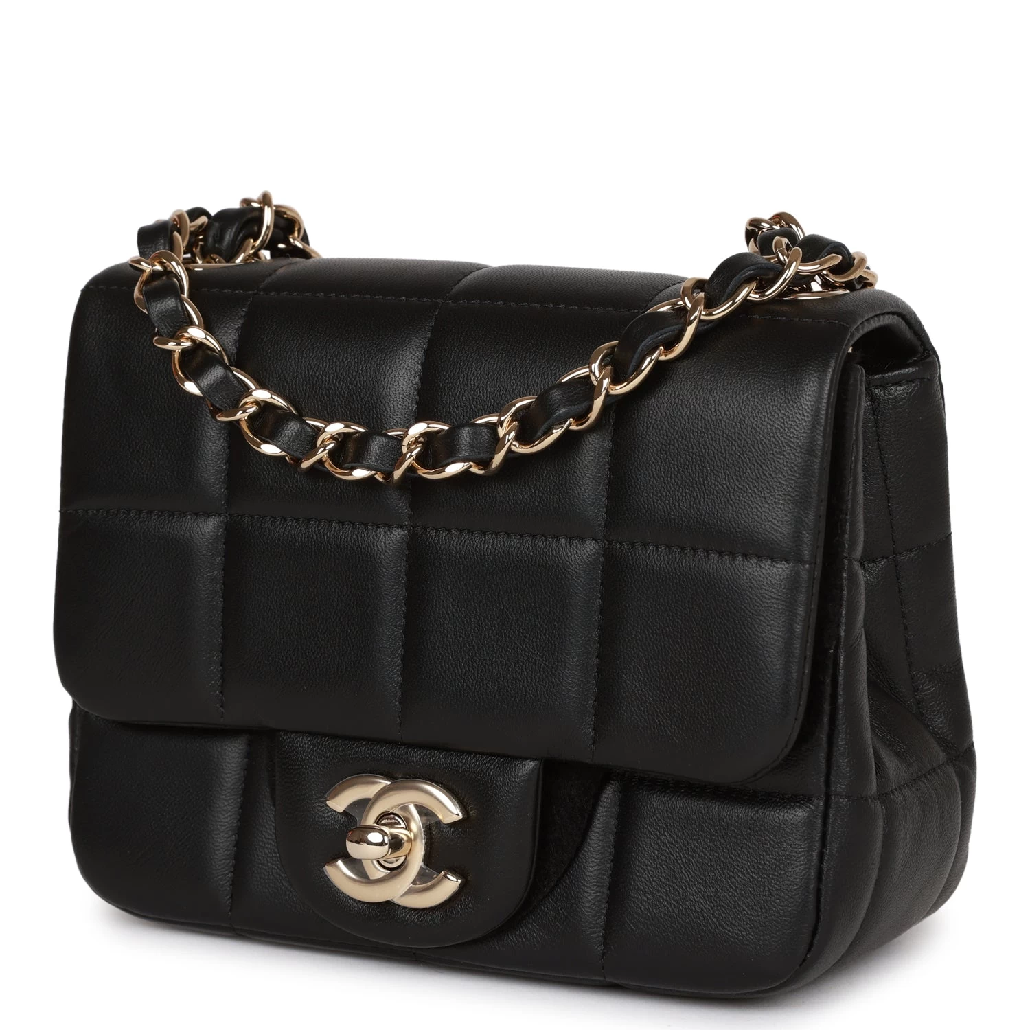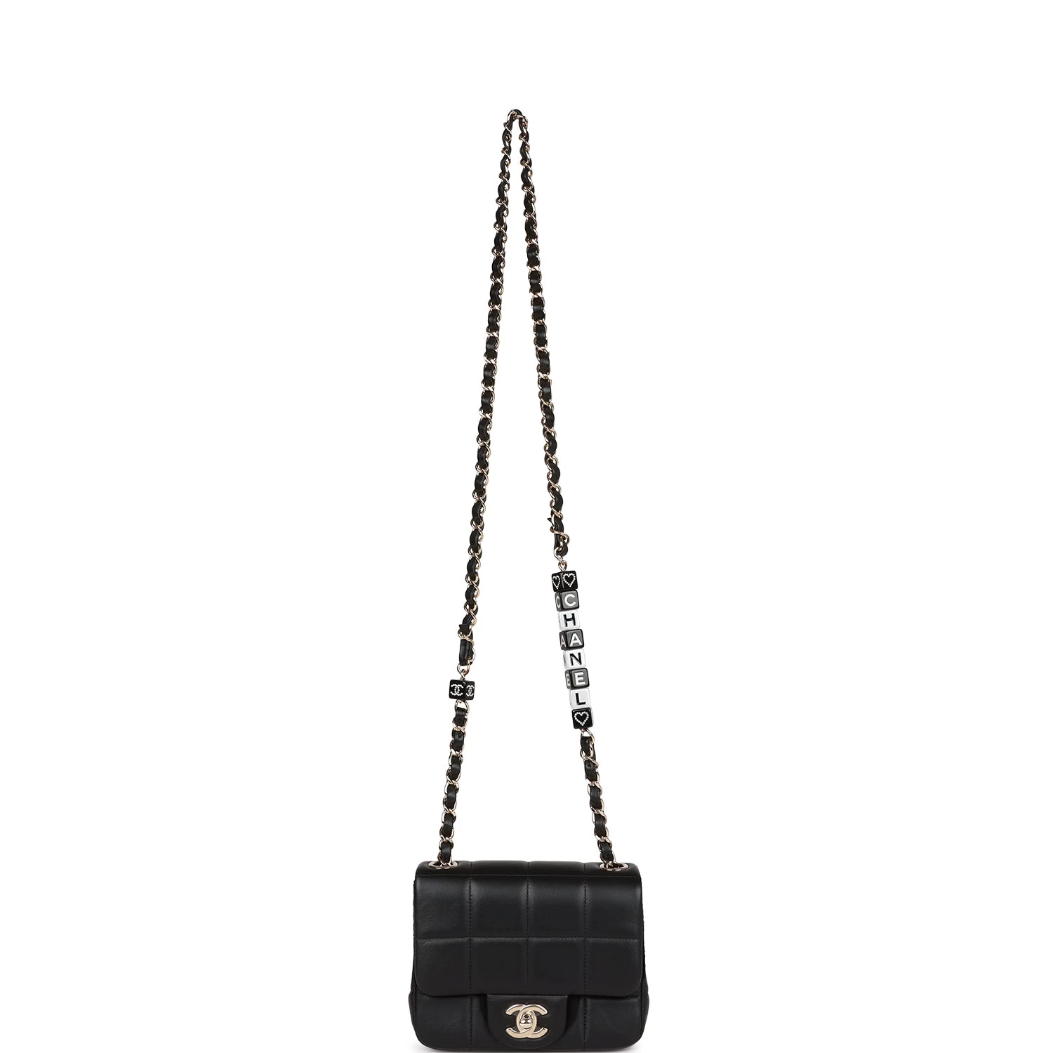 This limited edition Mini Square flap bag is in black lambskin with light gold tone hardware and has a front flap with signature CC turnlock closure, rear half moon pocket and single interwoven black leather and light gold tone chain link shoulder/crossbody strap with resin charms.