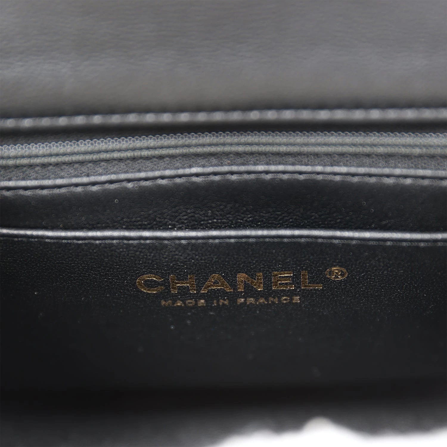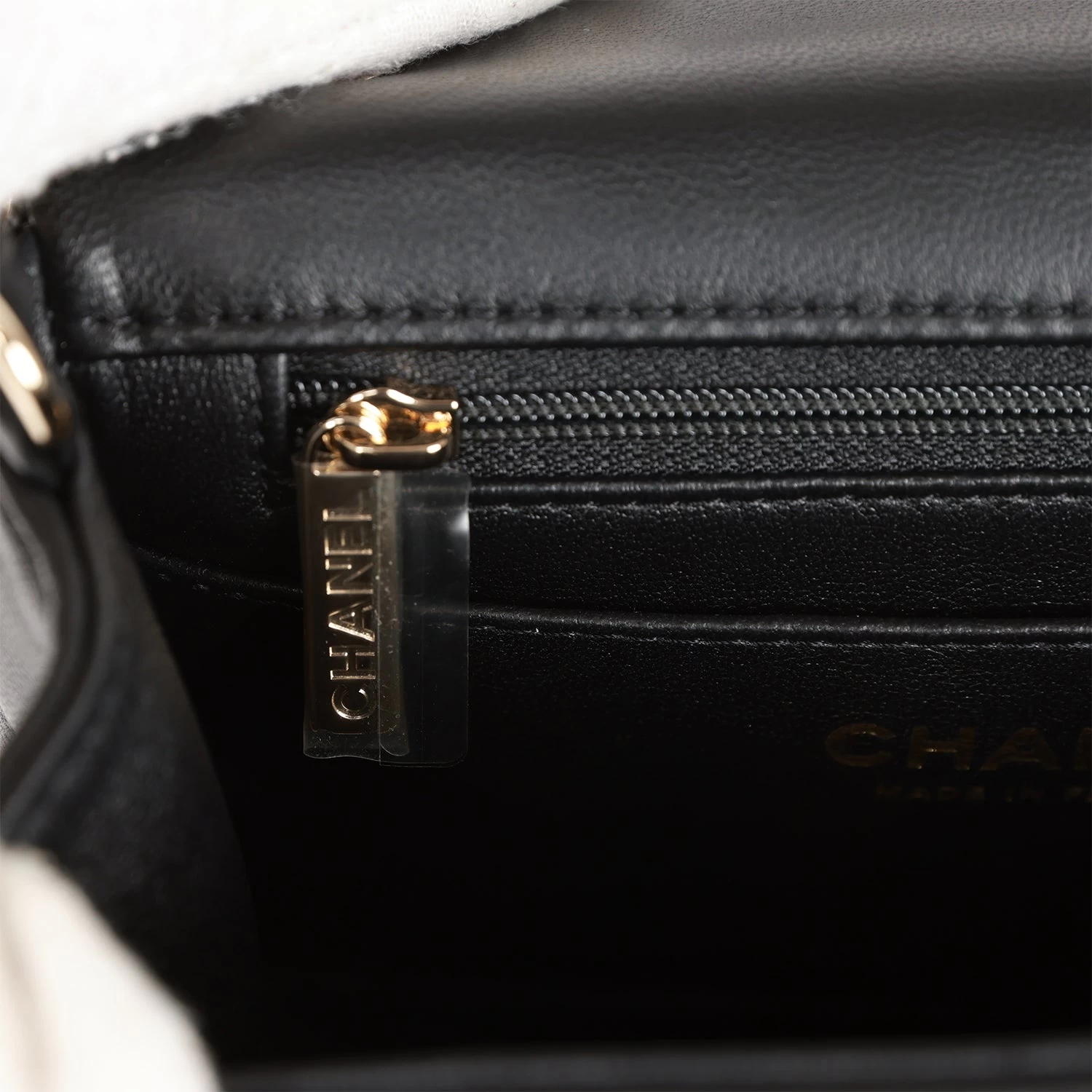 The interior is lined in black leather and features a zipper pocket with Chanel pull and an open pocket below.