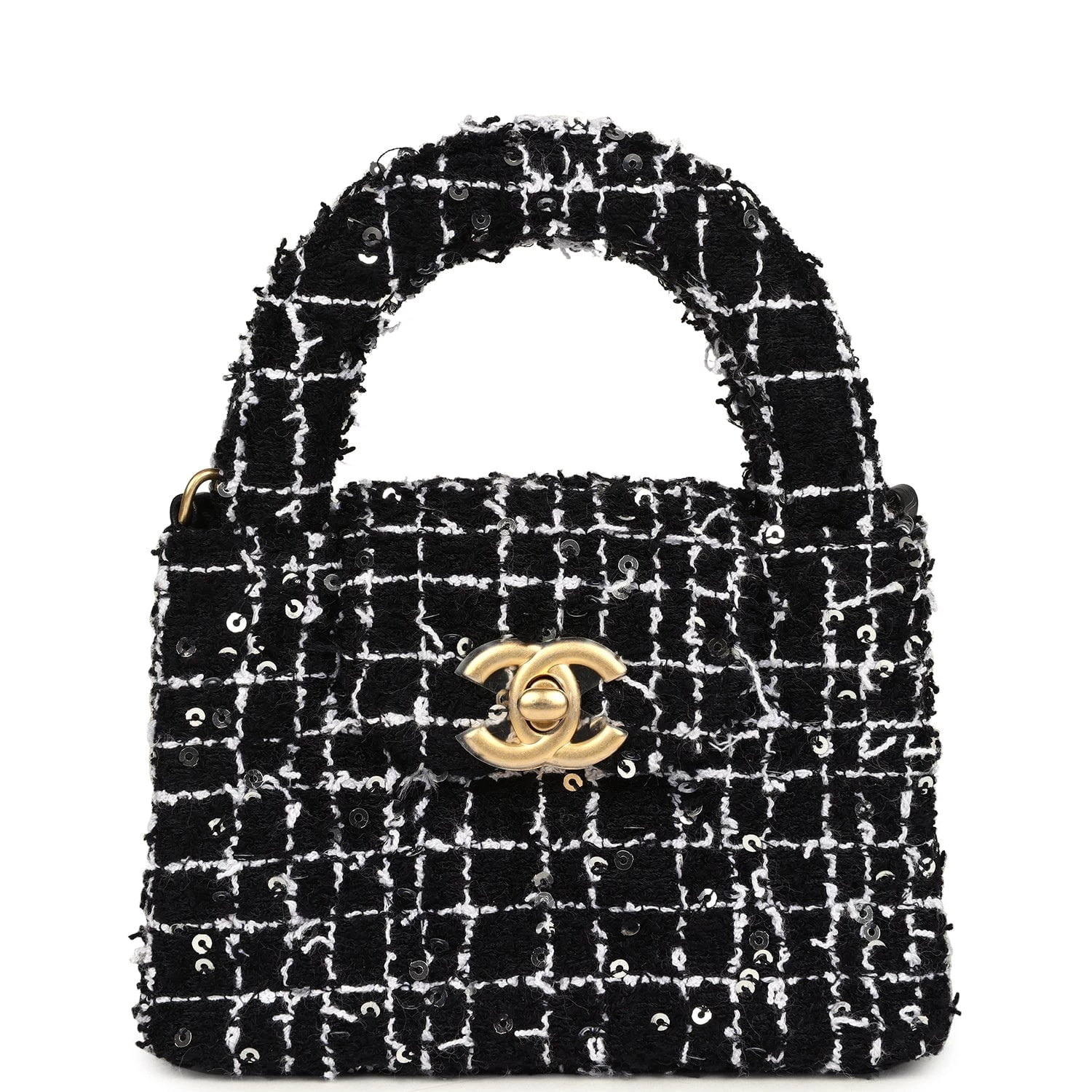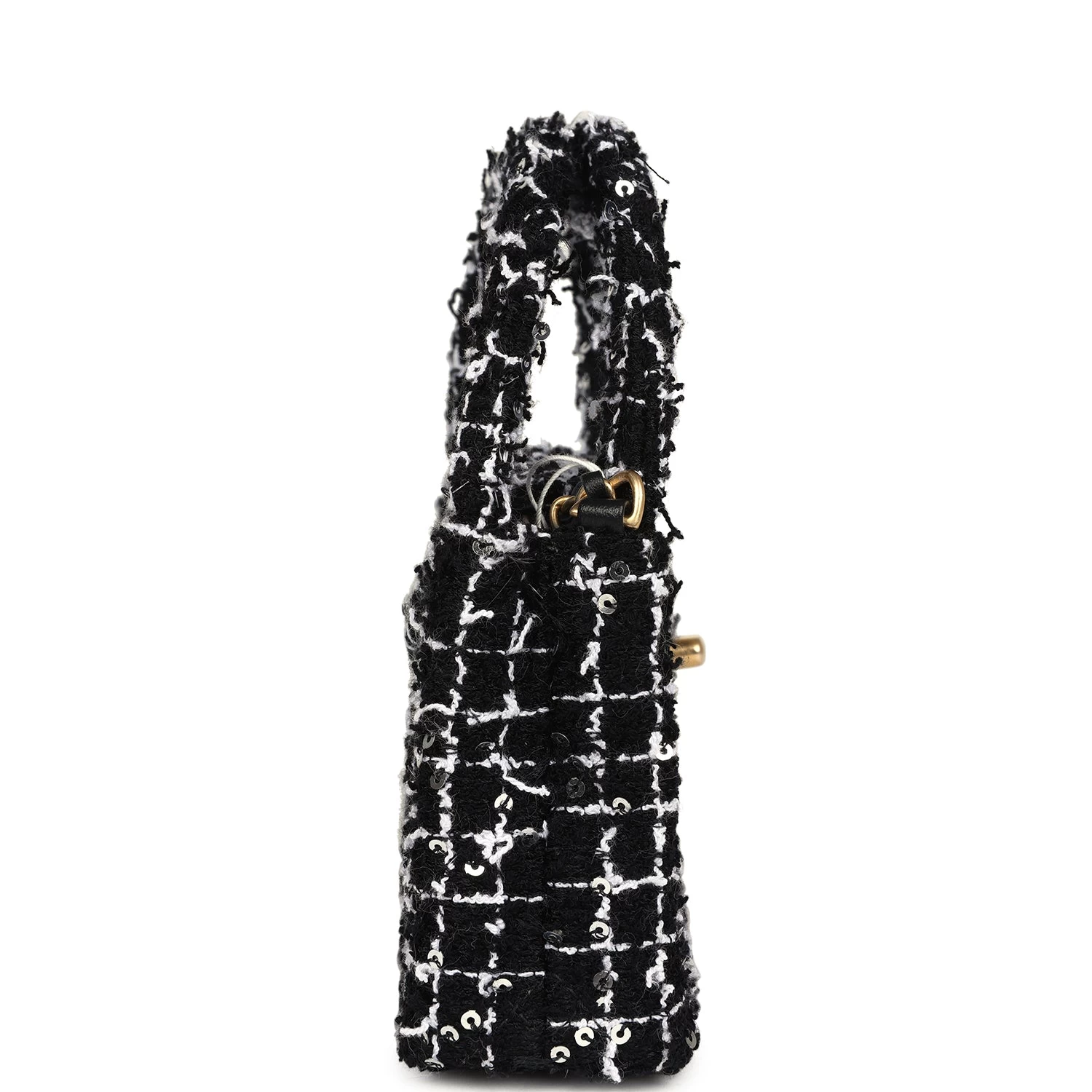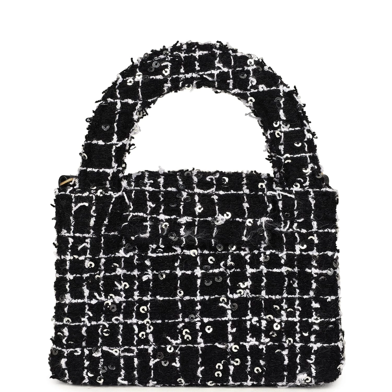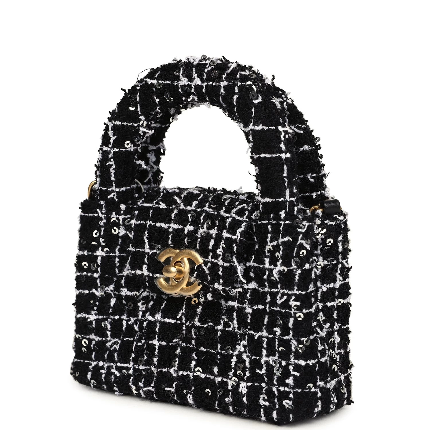 This Chanel Nano Kelly is in black, white, and sequin tweed with brushed gold hardware, tonal stitching, two flat back top handles and an interwoven aged gold with black leather shoulder strap, and CC turnlock closure.