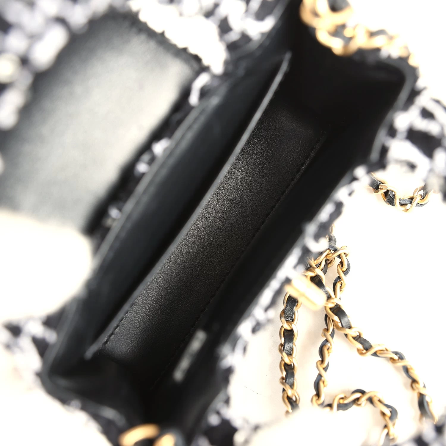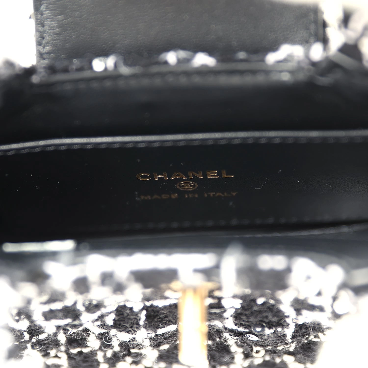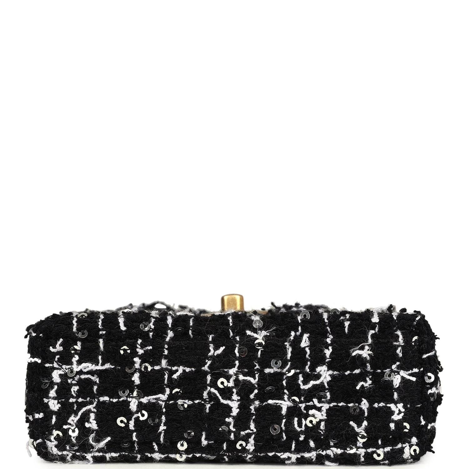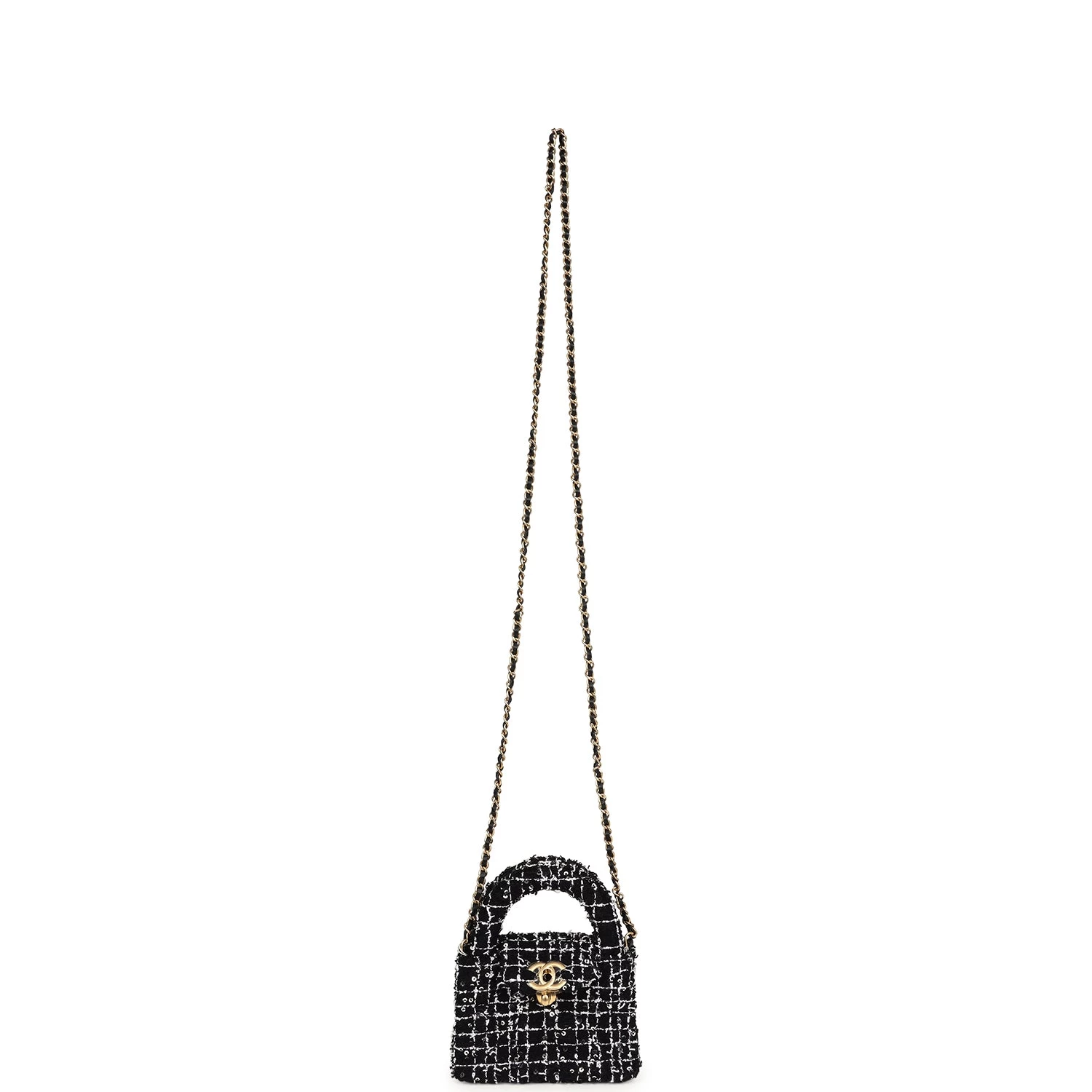 This Chanel Nano Kelly is in black, white, and sequin tweed with brushed gold hardware, tonal stitching, two flat back top handles and an interwoven aged gold with black leather shoulder strap, and CC turnlock closure.