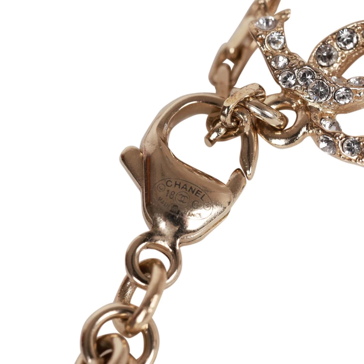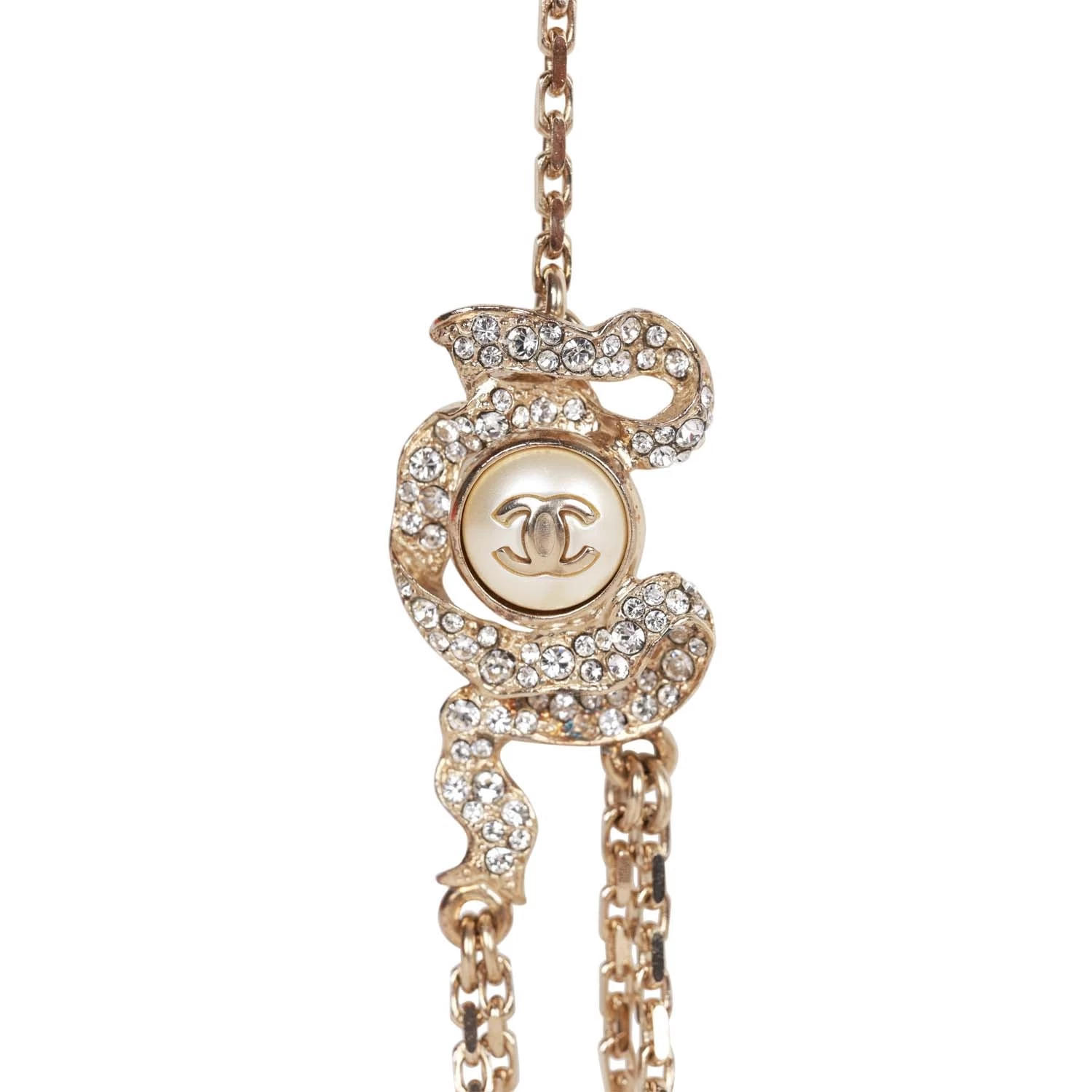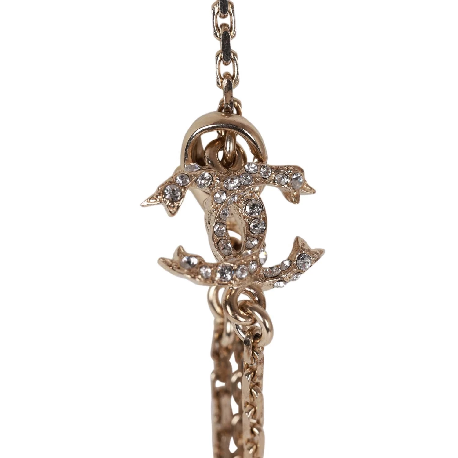 This sautoir necklace from the Paris-Athens collection is in gold tone metal with clear crystals and faux pearl accents.