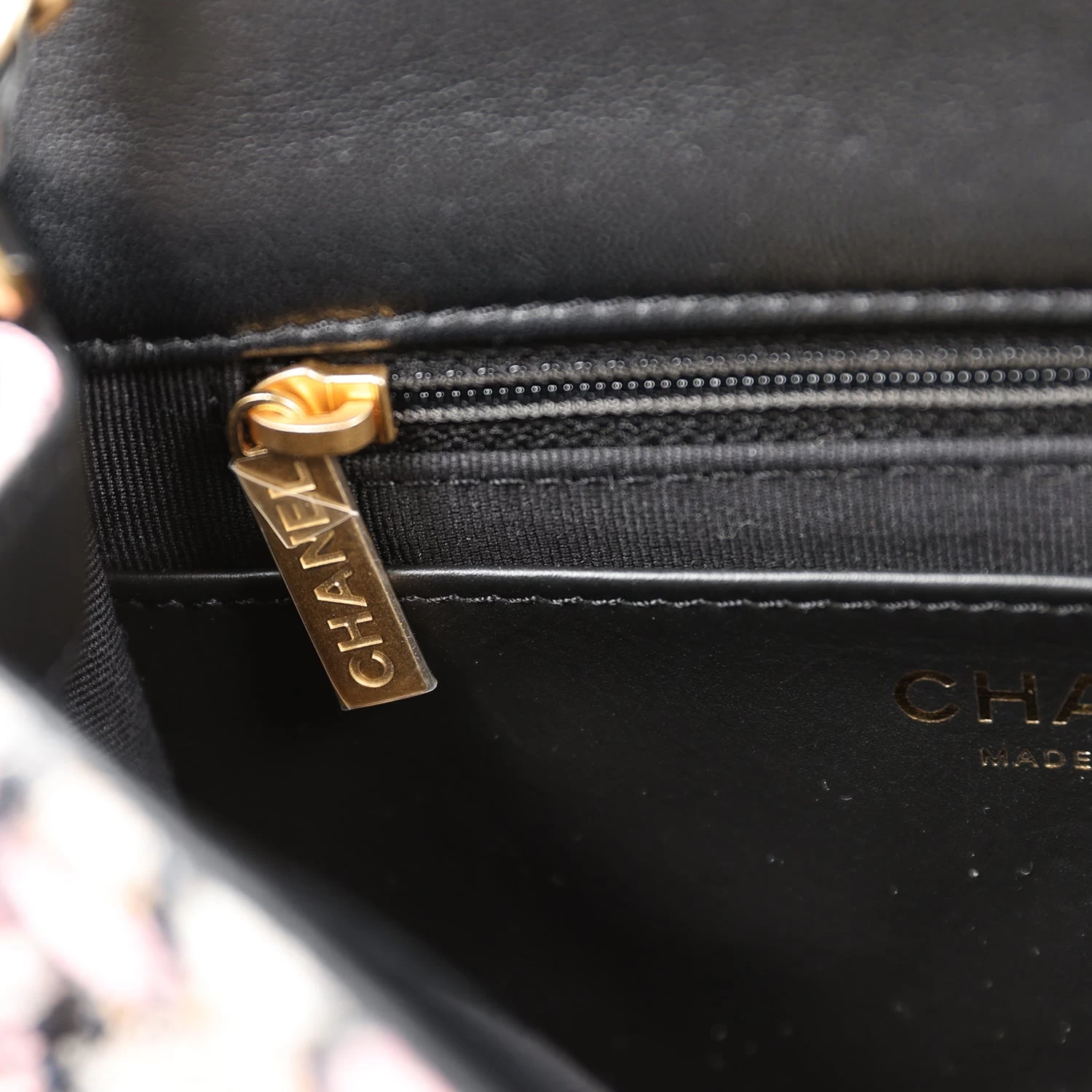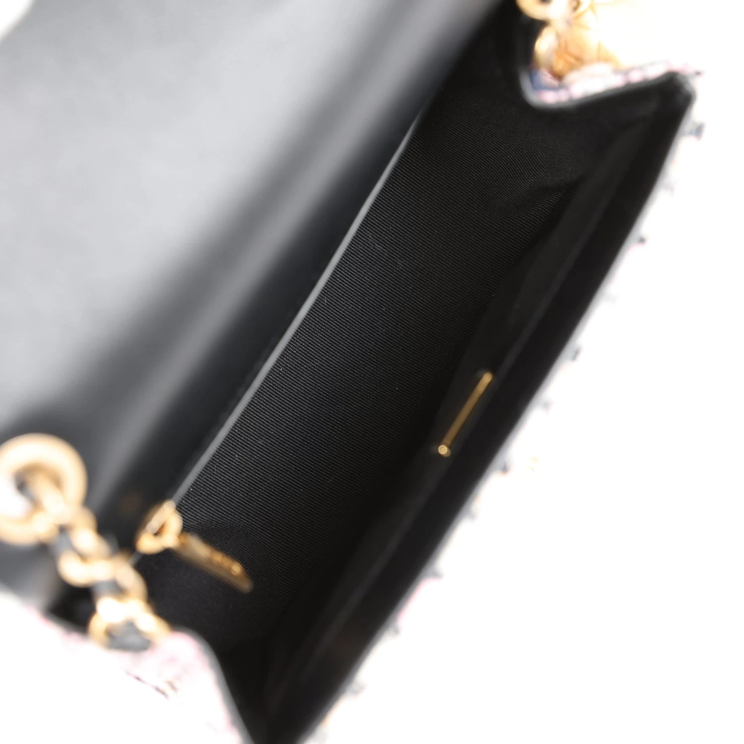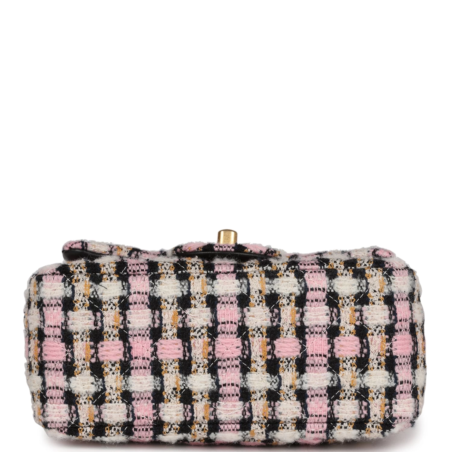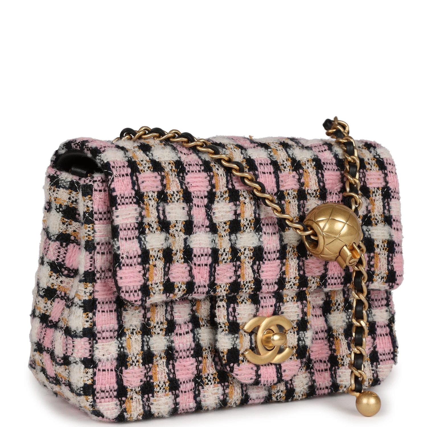This Pearl Crush Mini Square flap bag is of multicolor tweed with antique gold tone hardware and has a front flap with signature CC turnlock closure, rear half moon pocket, single interwoven black leather and antique gold tone chain link shoulder/crossbody strap with adjustable “pearl” ball.