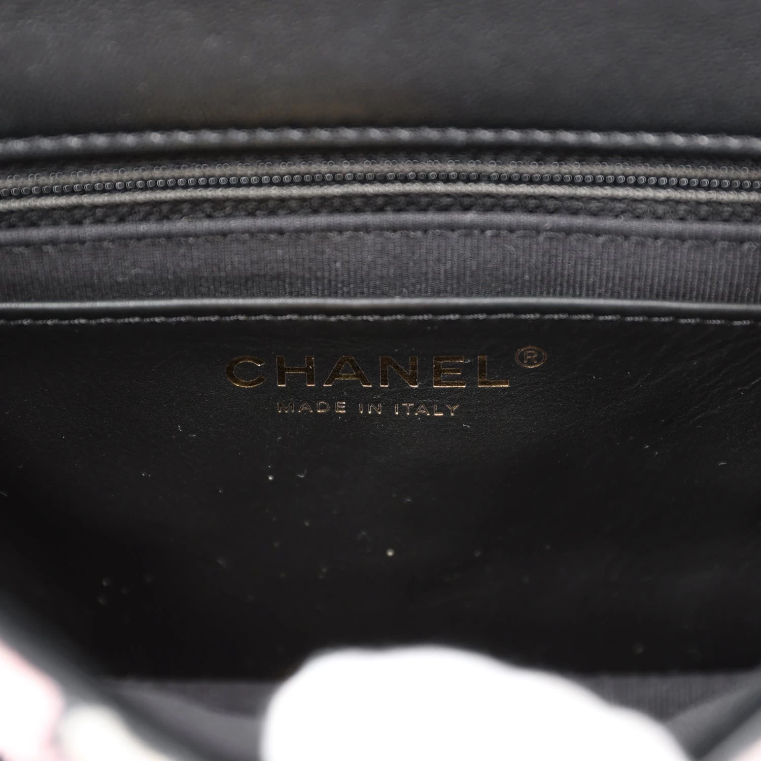 The interior is lined in black leather and features a zipper pocket with Chanel pull and an open pocket below.