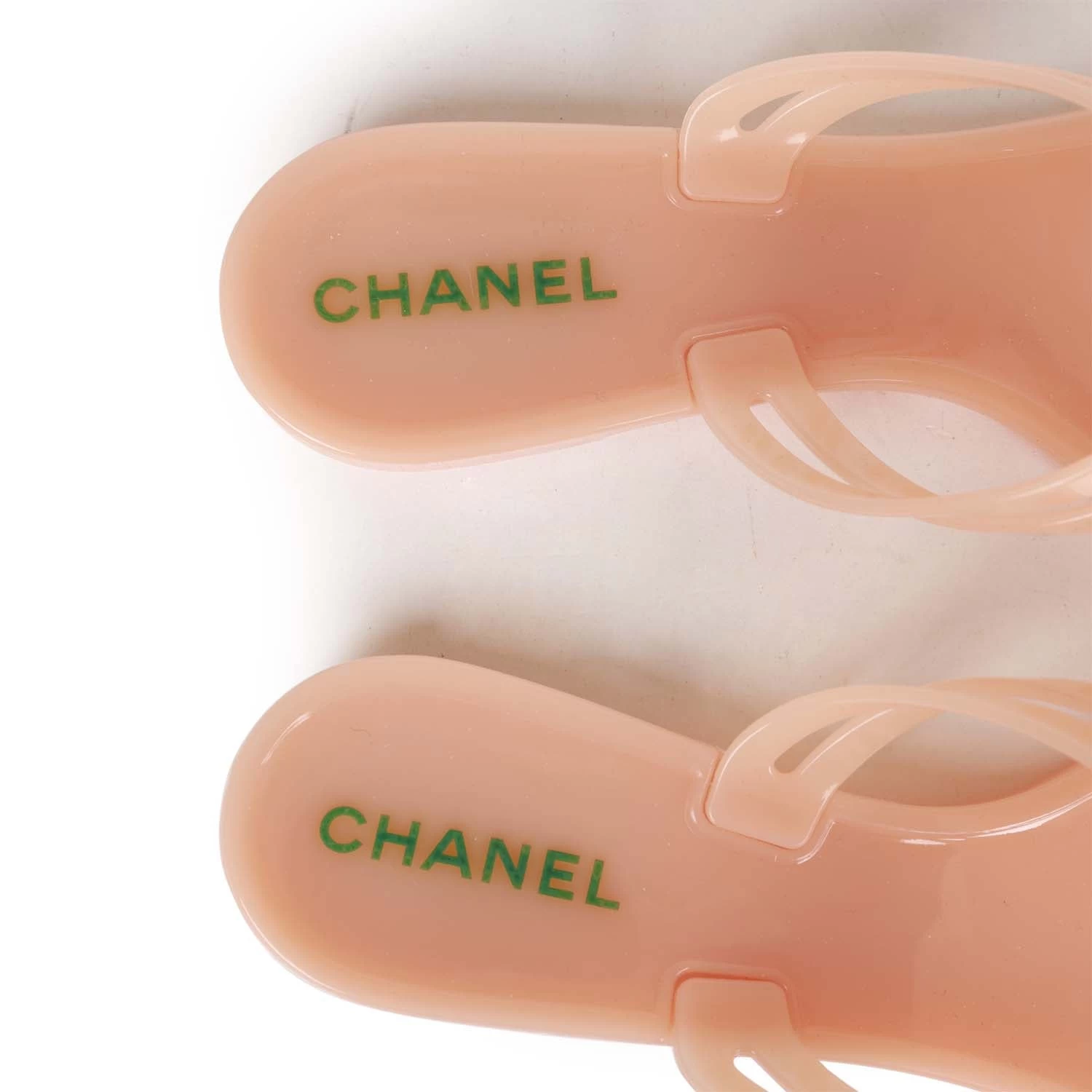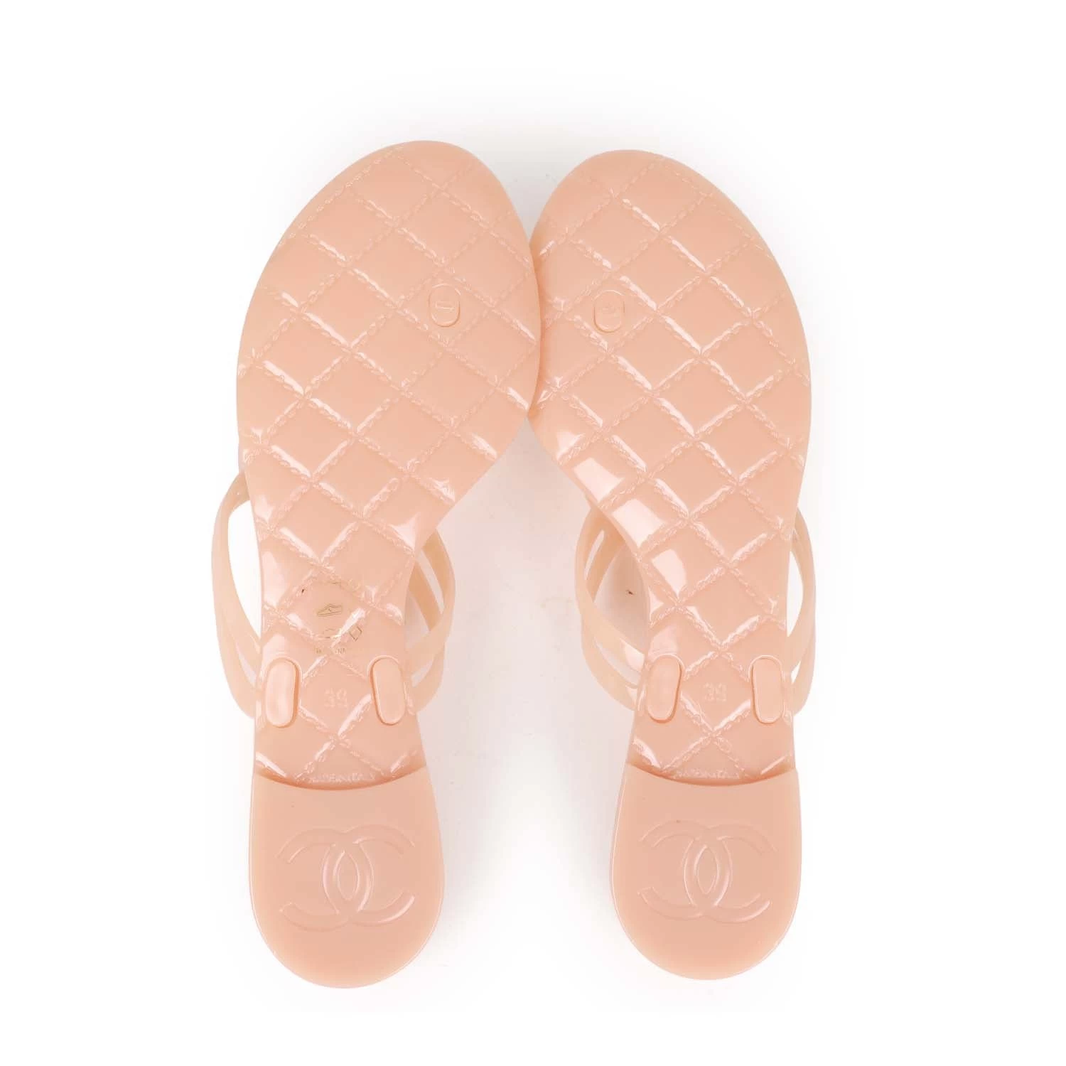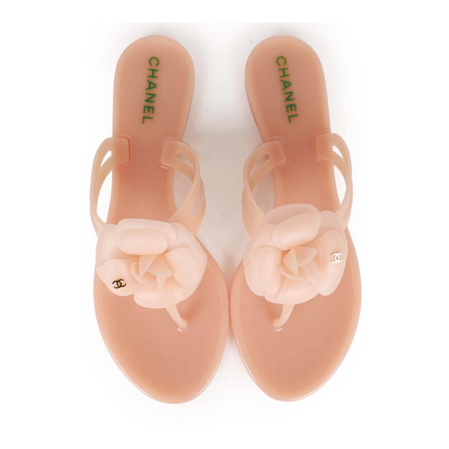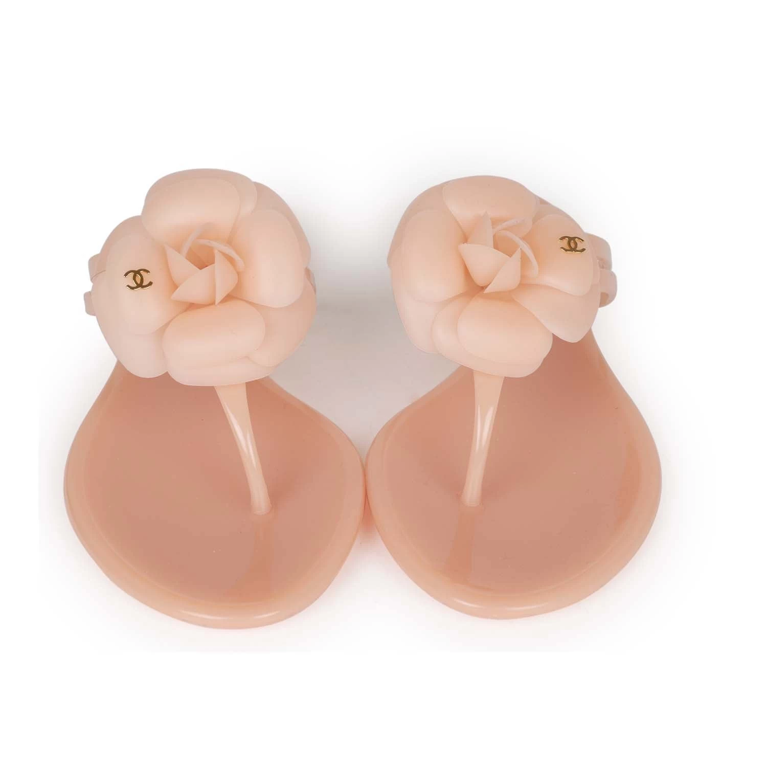 This pair of Chanel Camellia Jelly thong sandals are in Peach Pink rubber with the iconic camellia flower featuring small gold CC logos on top.