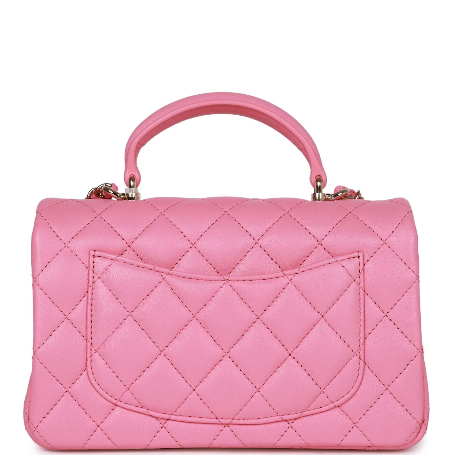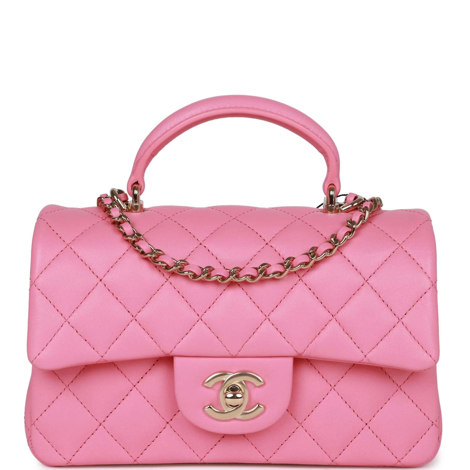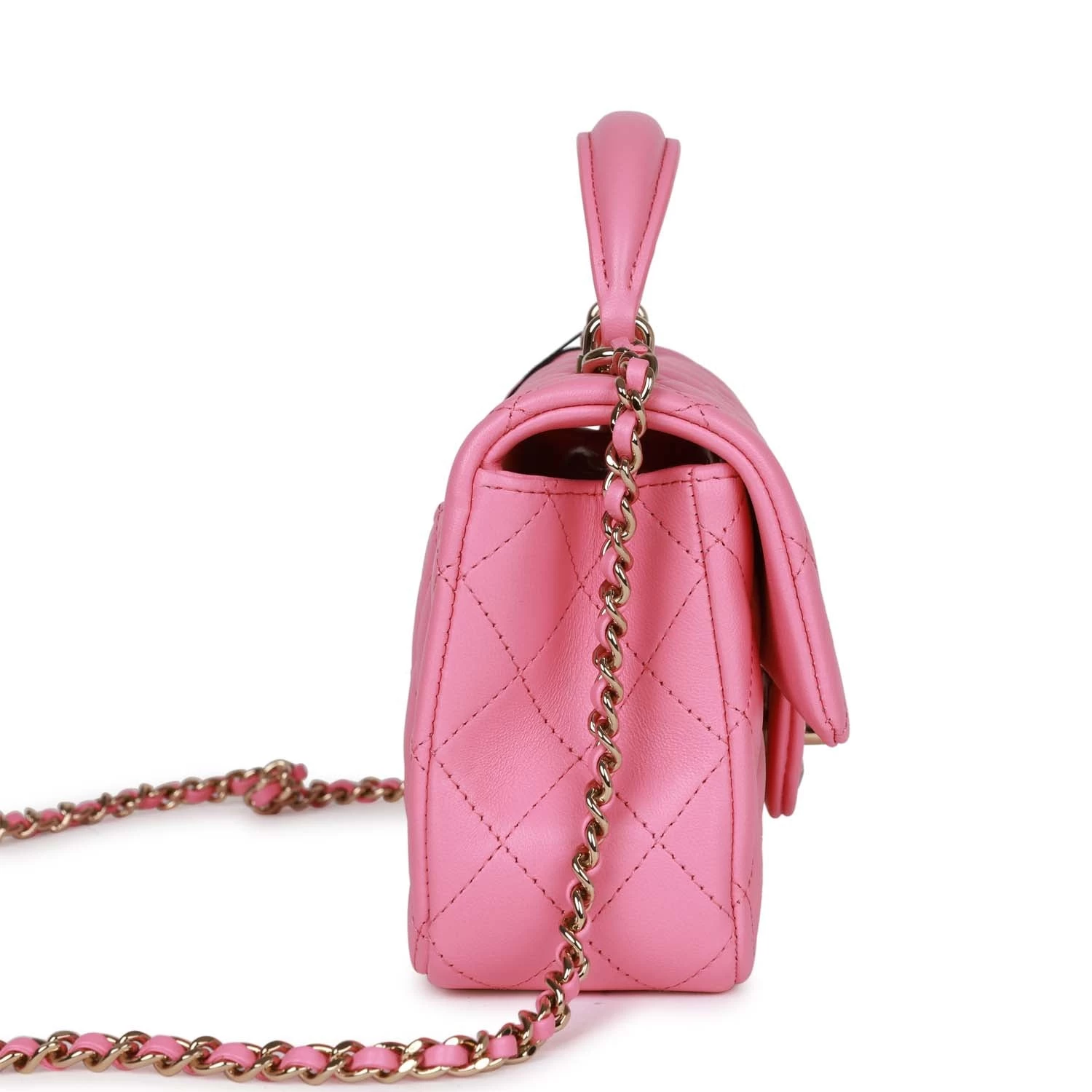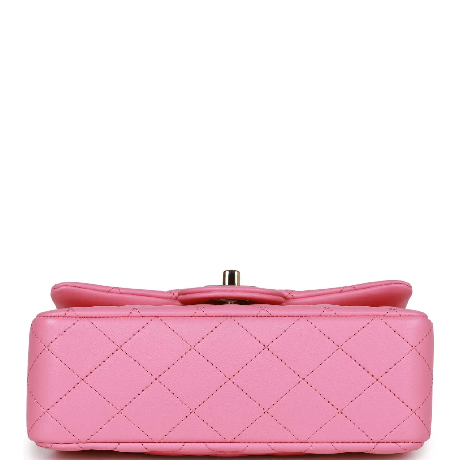 This Mini Rectangular flap bag is in pink lambskin with light gold tone hardware and has a front flap with signature CC turnlock closure, rear half moon pocket, top handle and single interwoven light pink leather and light gold tone chain link shoulder/crossbody strap.