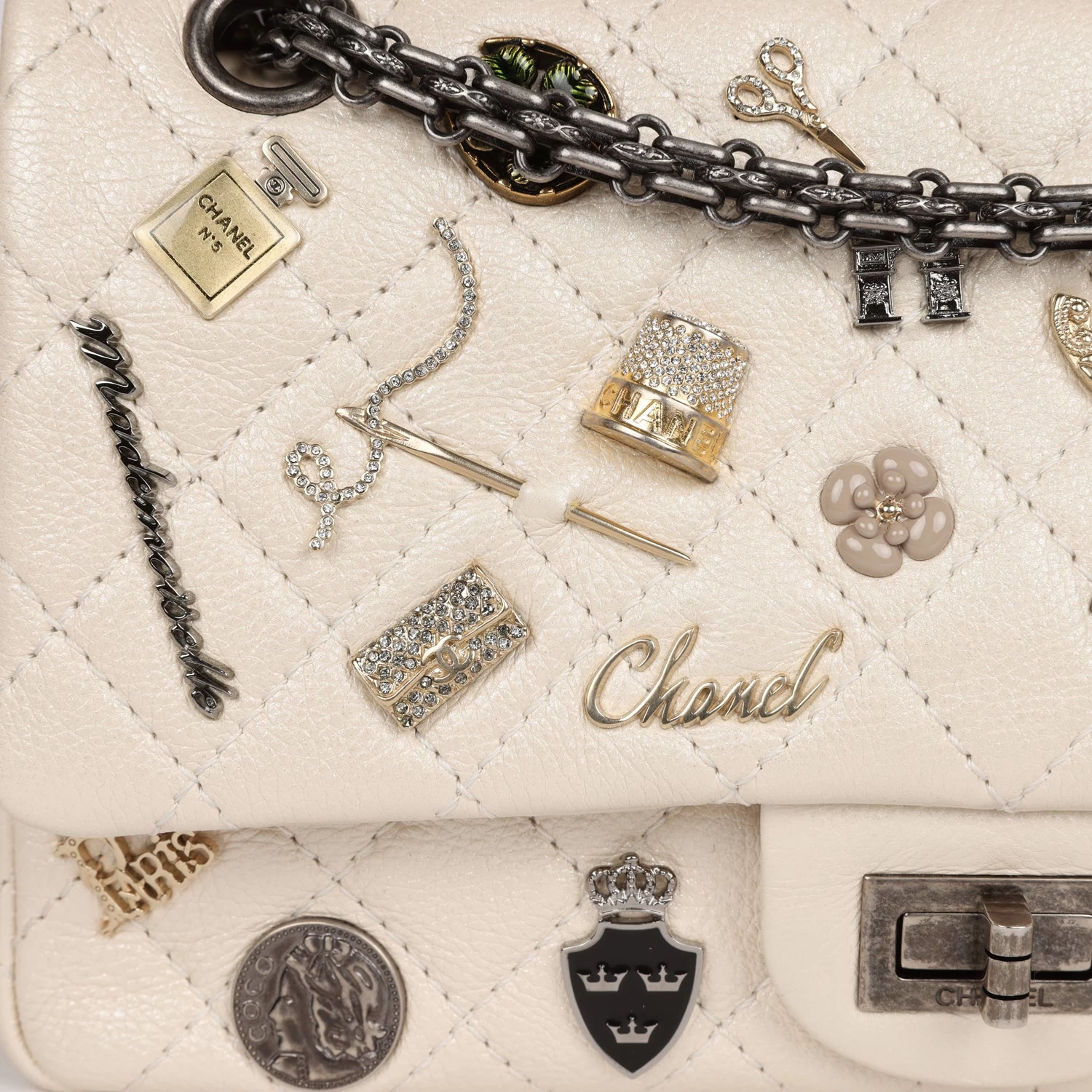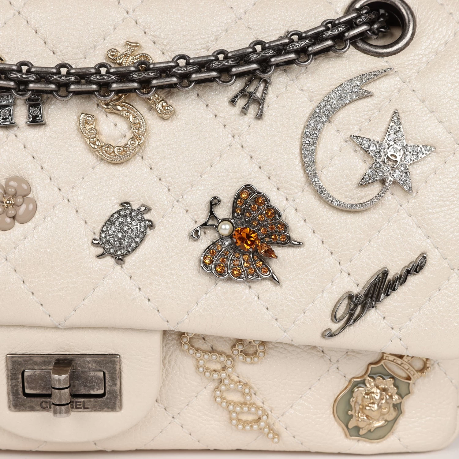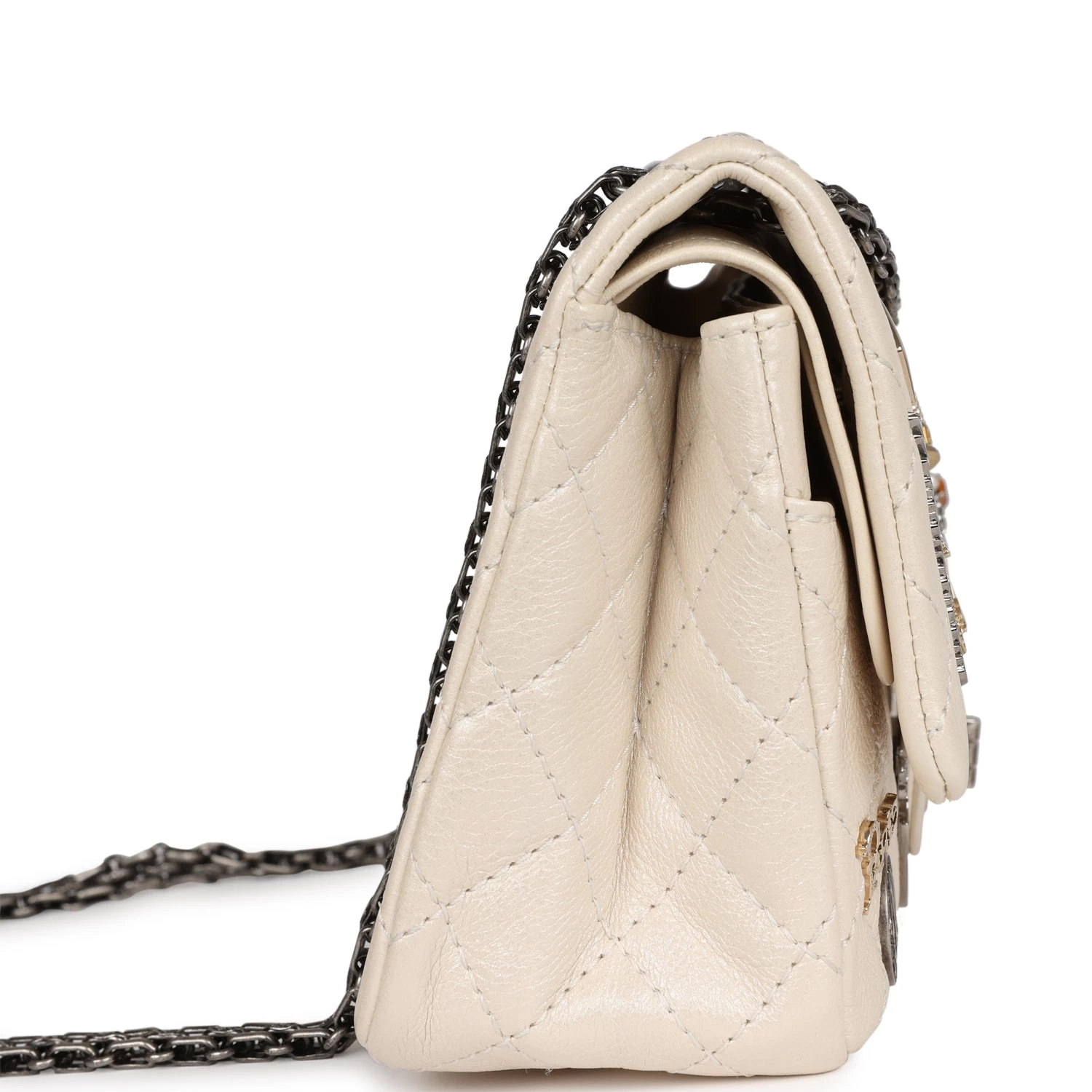 This Small Reissue Lucky Charms Double Flap Bag is in Iridescent Ivory Aged Calfskin leather with Ruthenium Hardware, features all of Chanel’s iconic charms, opens to reveal an inner flap, front pocket, half moon pocket, and a ruthenium chain shoulder strap with matching mademoiselle turn-lock closure.