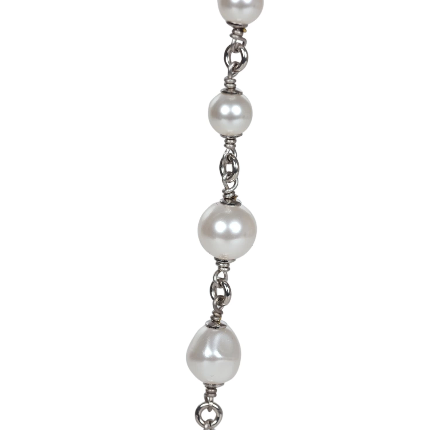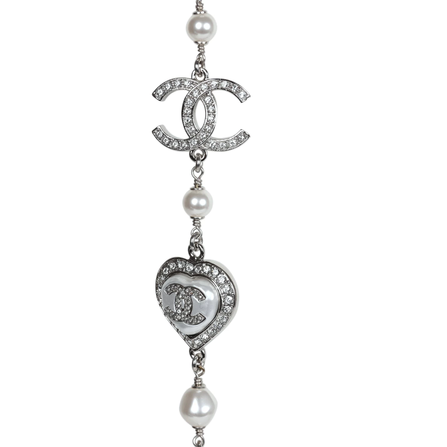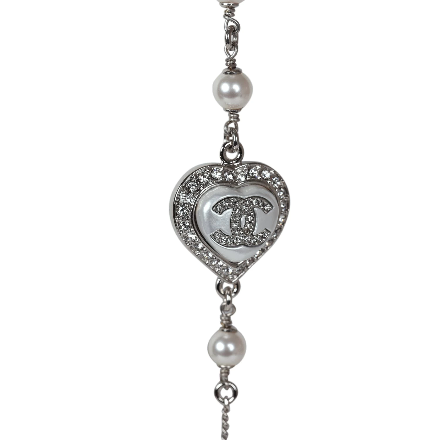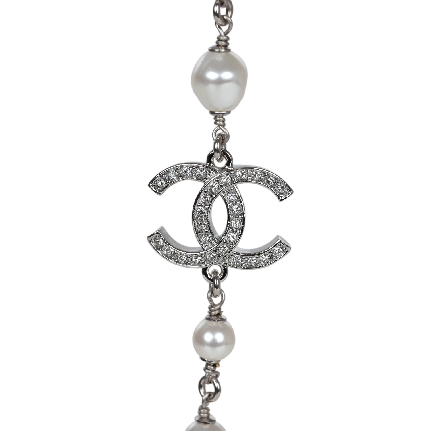 This Chanel logo necklace is in silver metal, white strass, and pearls.