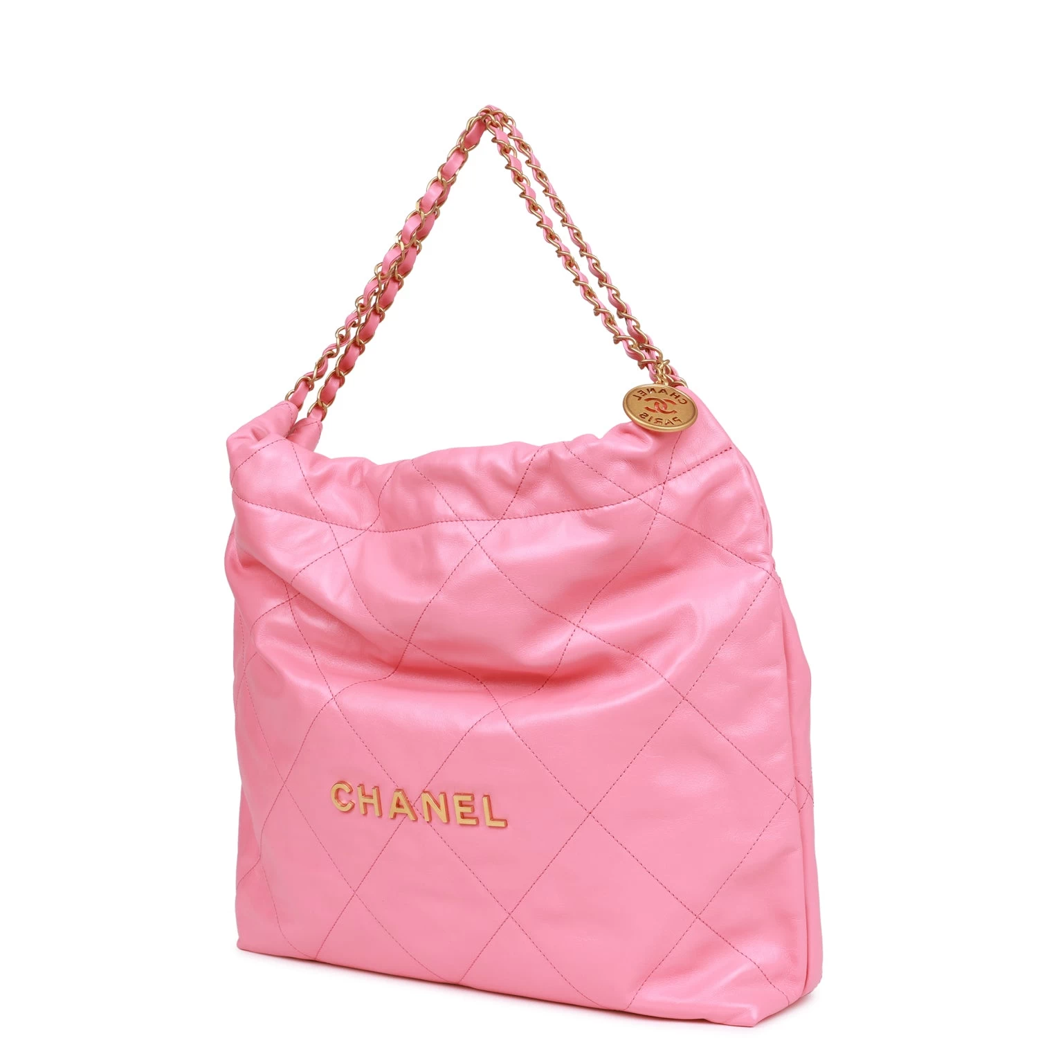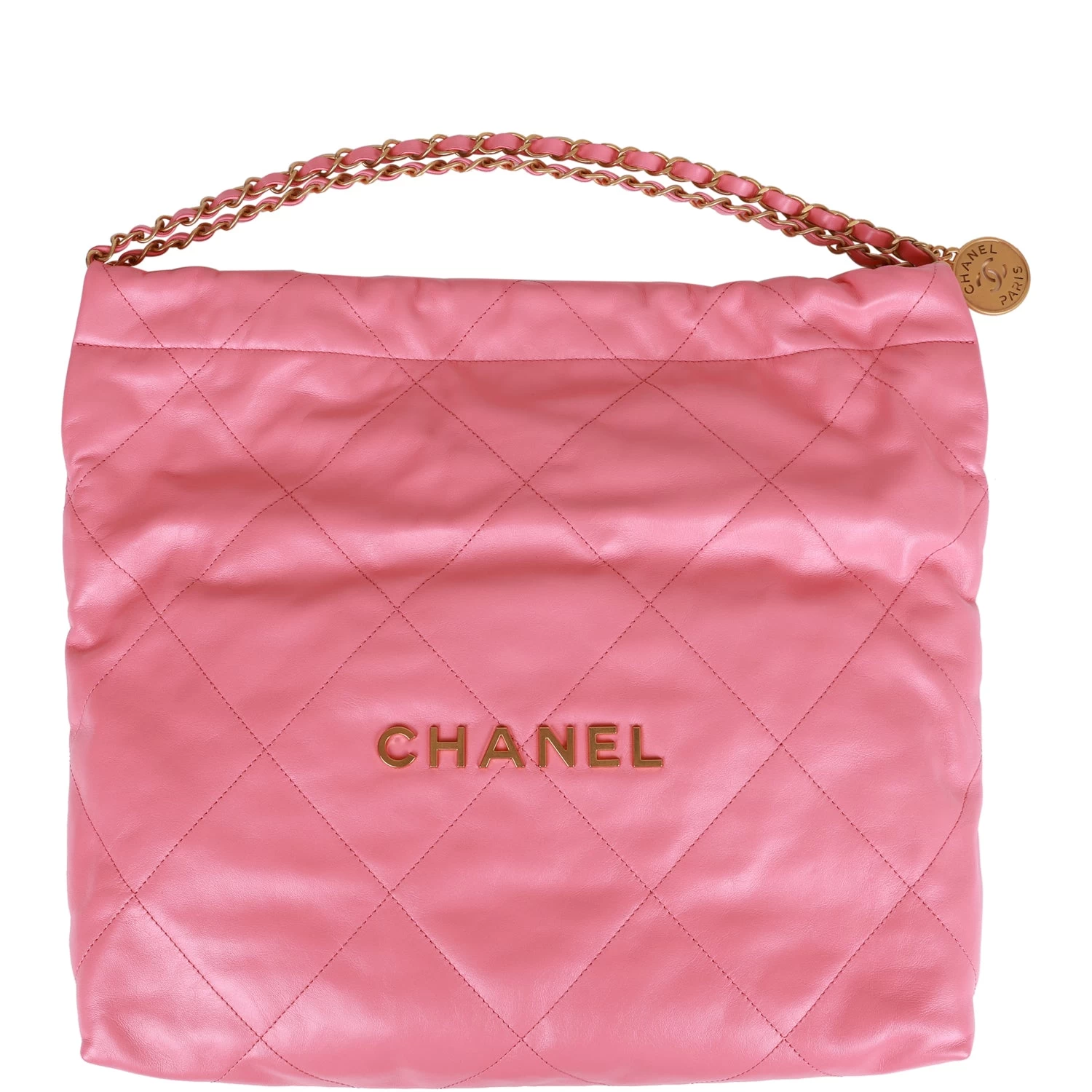 This Small 22 hobo bag is of pink calfskin with gold tone hardware and has the signature diamond quilting, CHANEL on the front in gold metal, removable pouch, and long gold tone and pink leather chain.