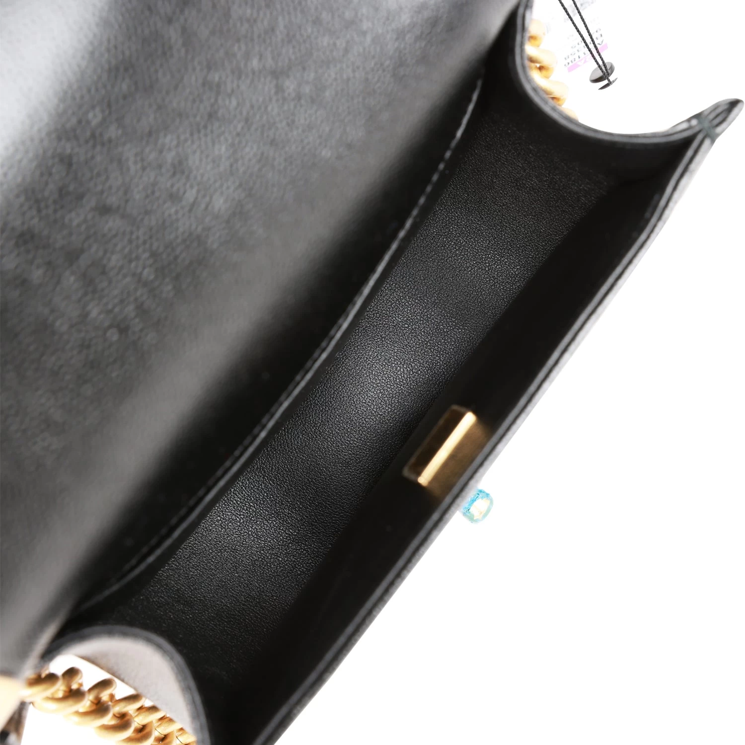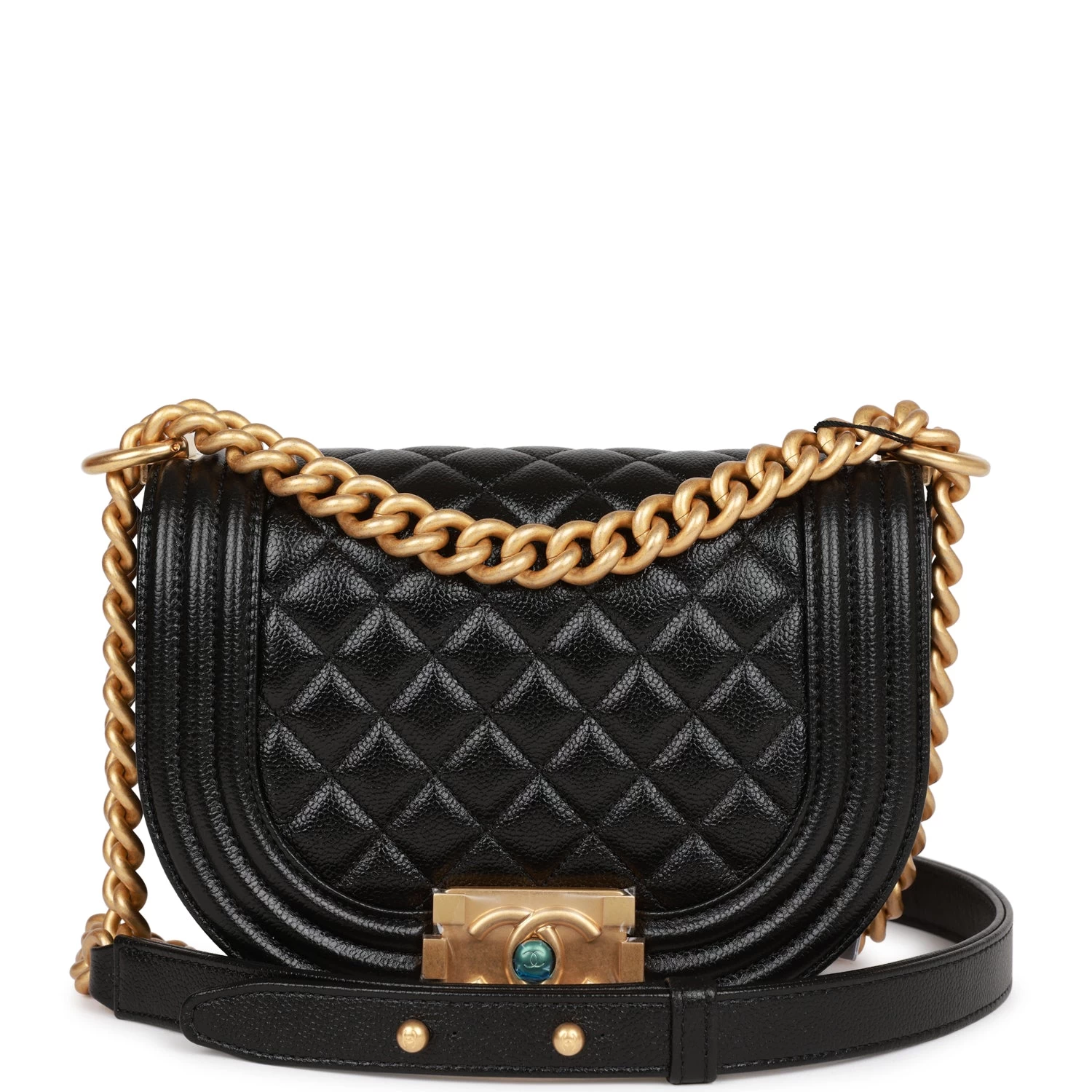 This Small Boy Messenger bag is in black quilted caviar leather with antique gold tone hardware and features a full front flap with the Le Boy CC push lock closure and an antique gold tone chain link and black leather padded shoulder/crossbody strap.