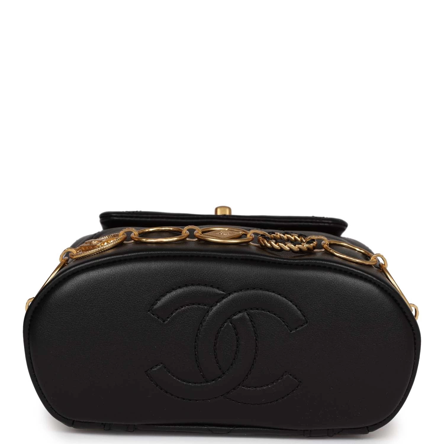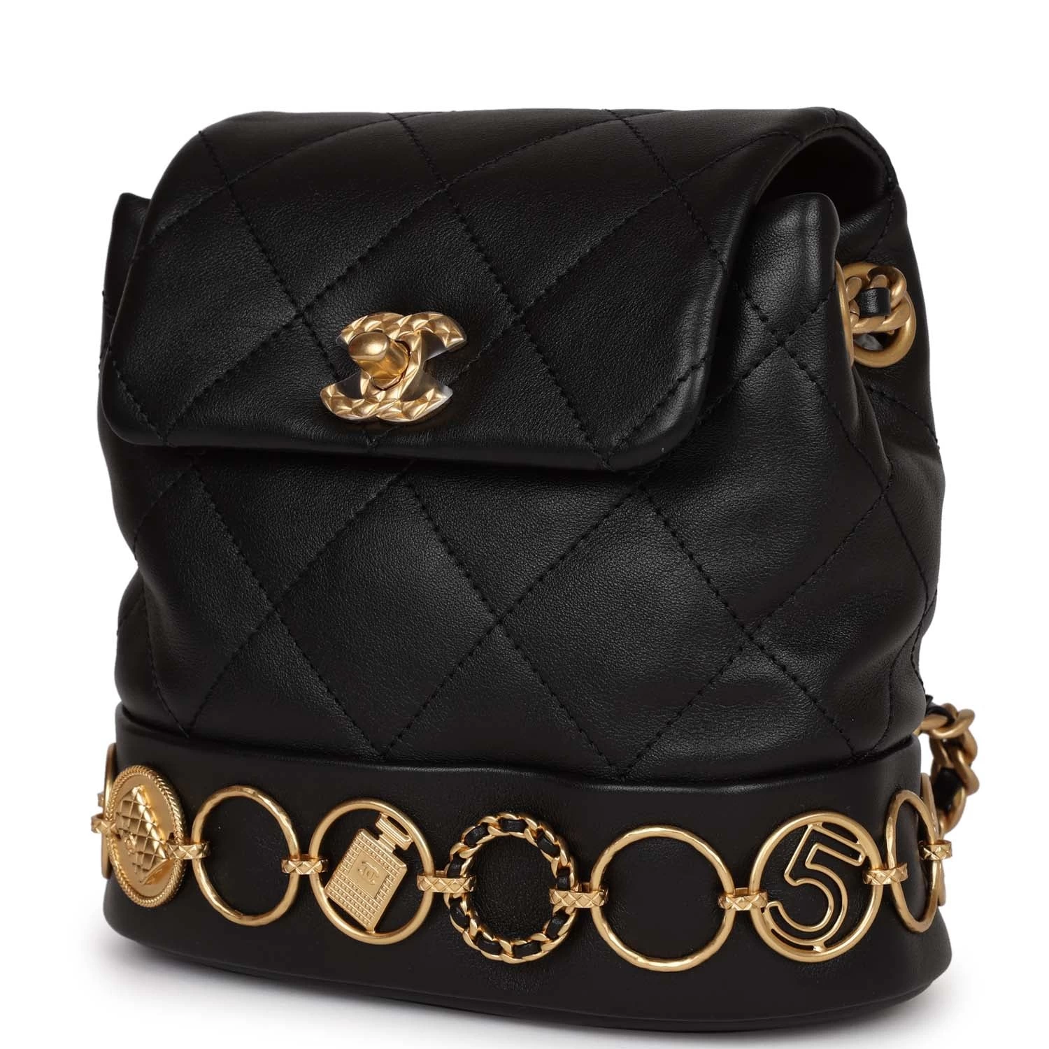 This Small Charm Backpack is of Black Calfskin with aged gold hardware, features metal details depicting Chanel icons and symbols, classic CC turnlock closure, an exterior back pocket, and aged gold tone interwoven chainlink shoulder straps.