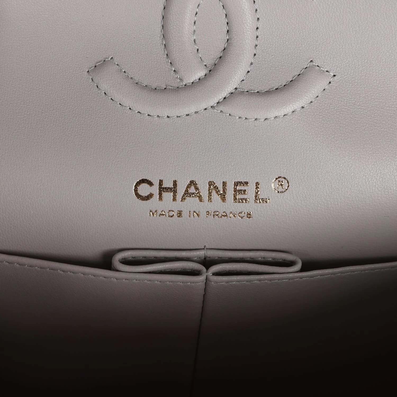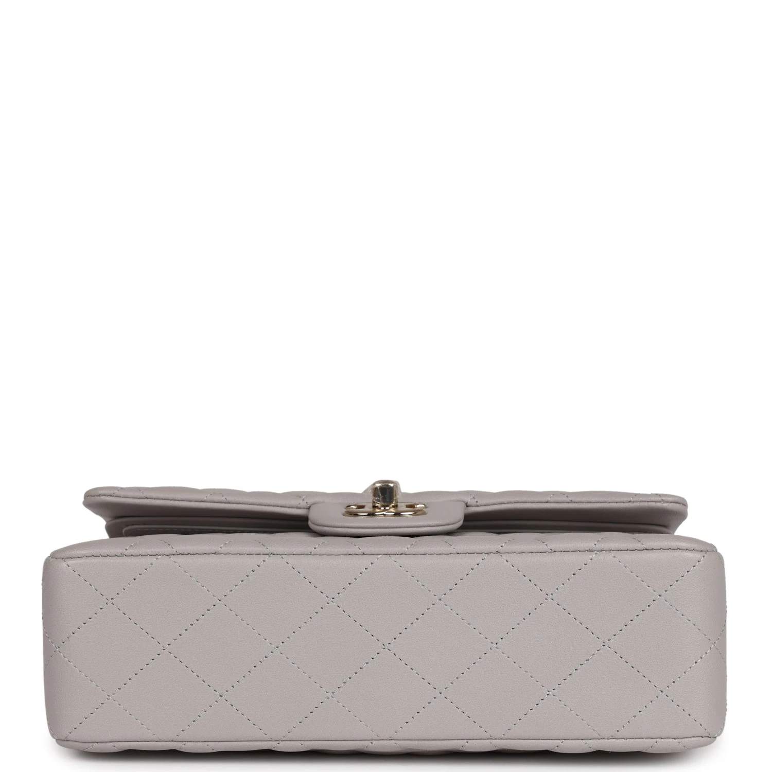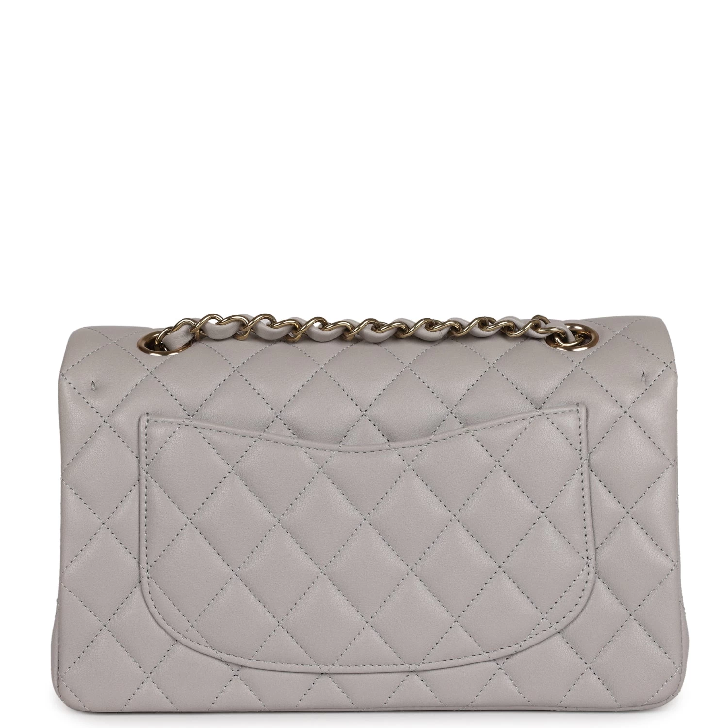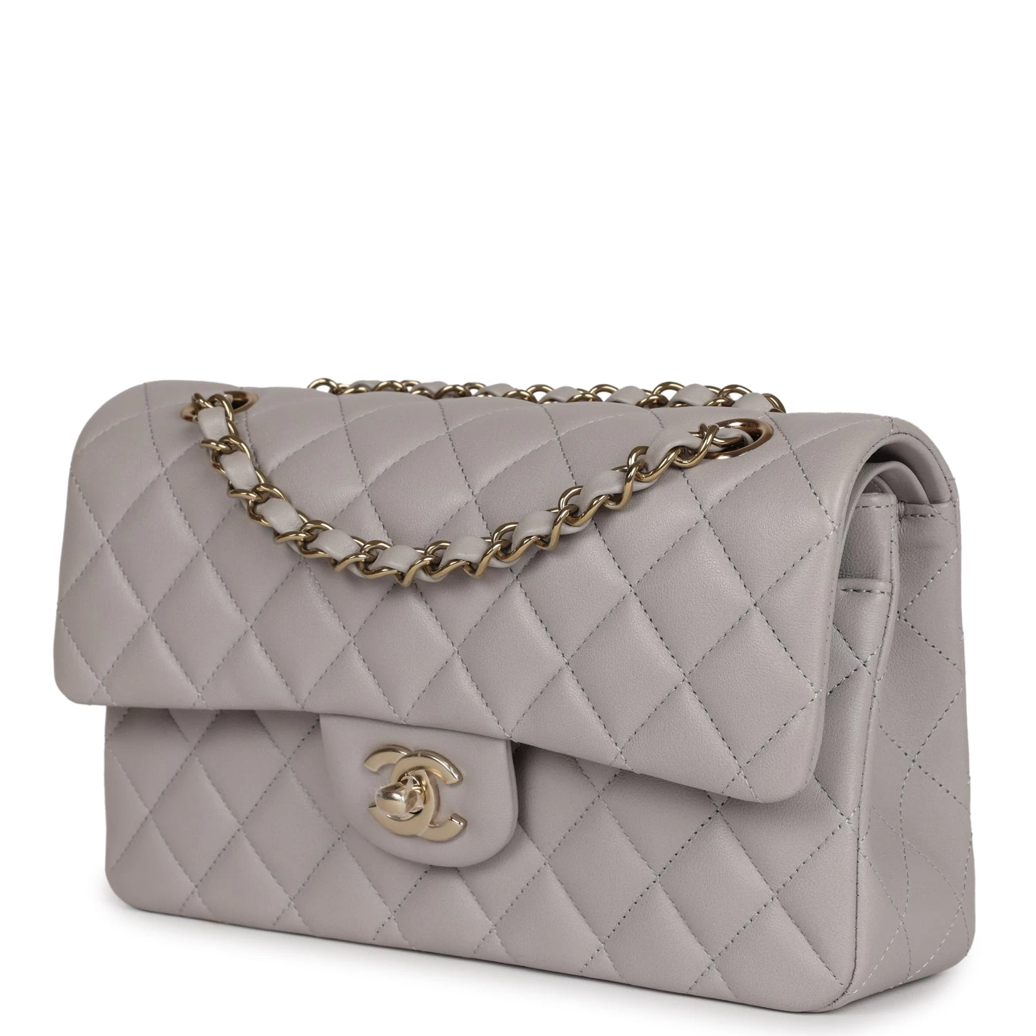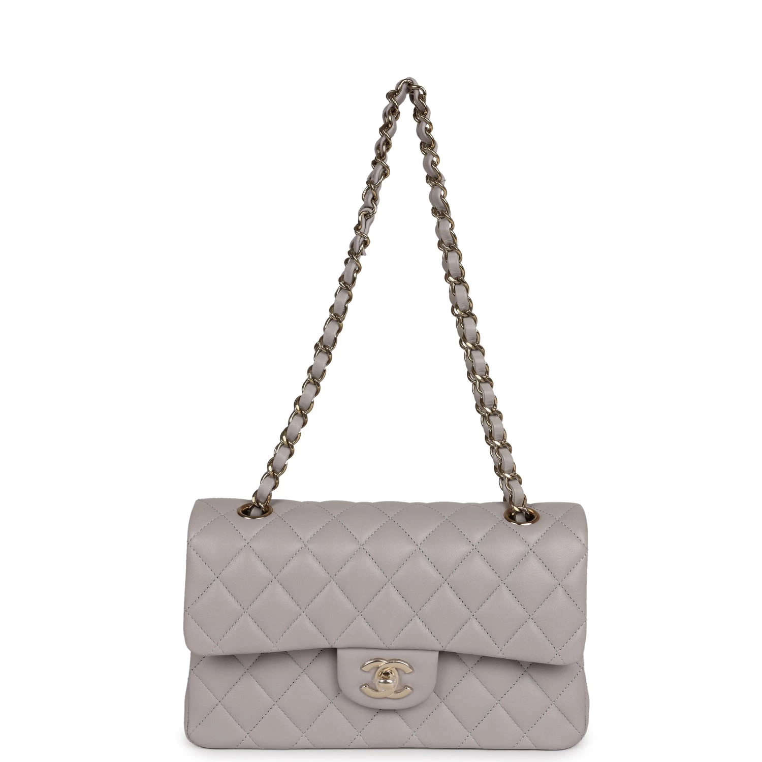 This Small Classic Double Flap bag is in grey lambskin leather with light gold tone hardware and features a front flap with signature CC turnlock closure, half moon back pocket, and adjustable interwoven light gold tone chain link and grey leather shoulder strap.