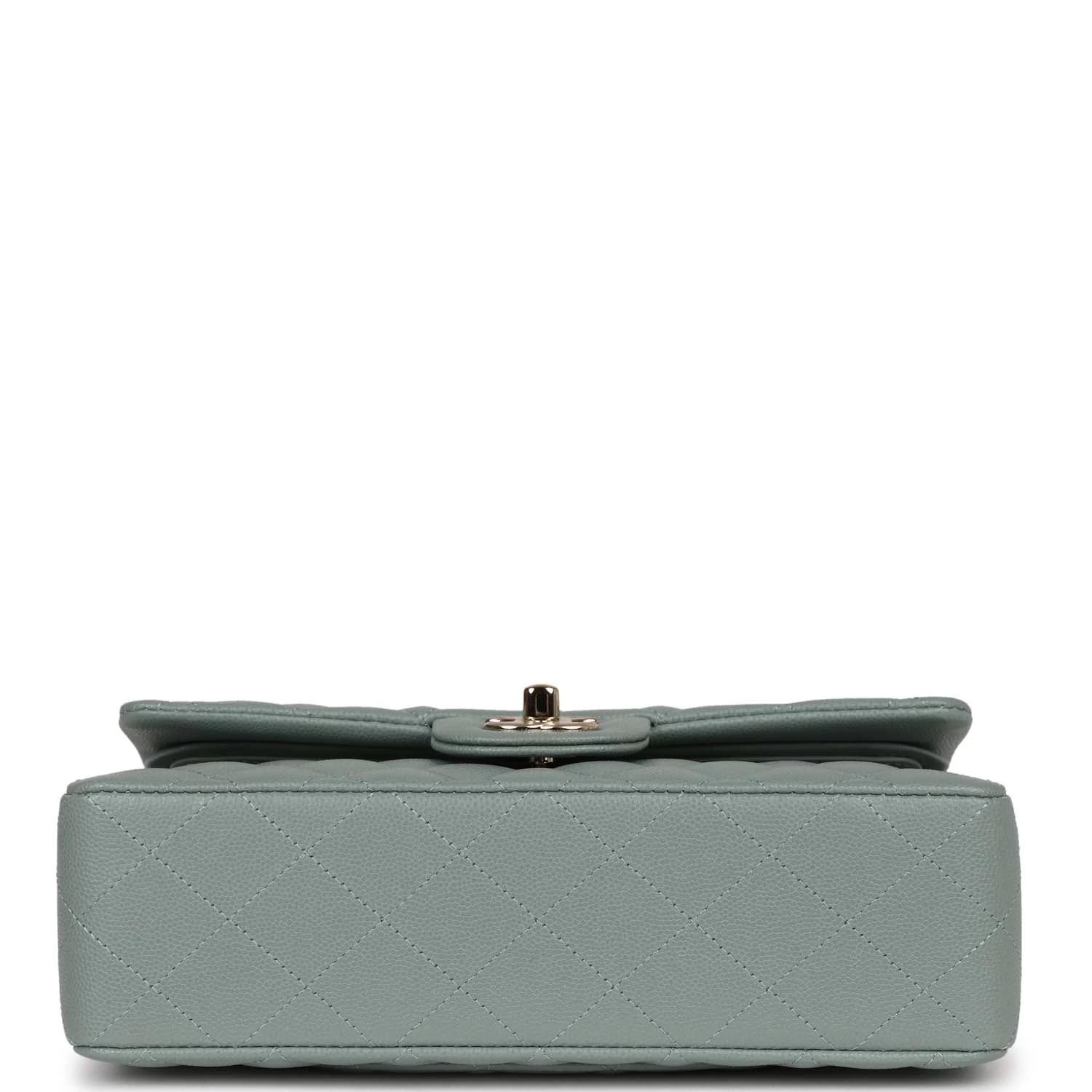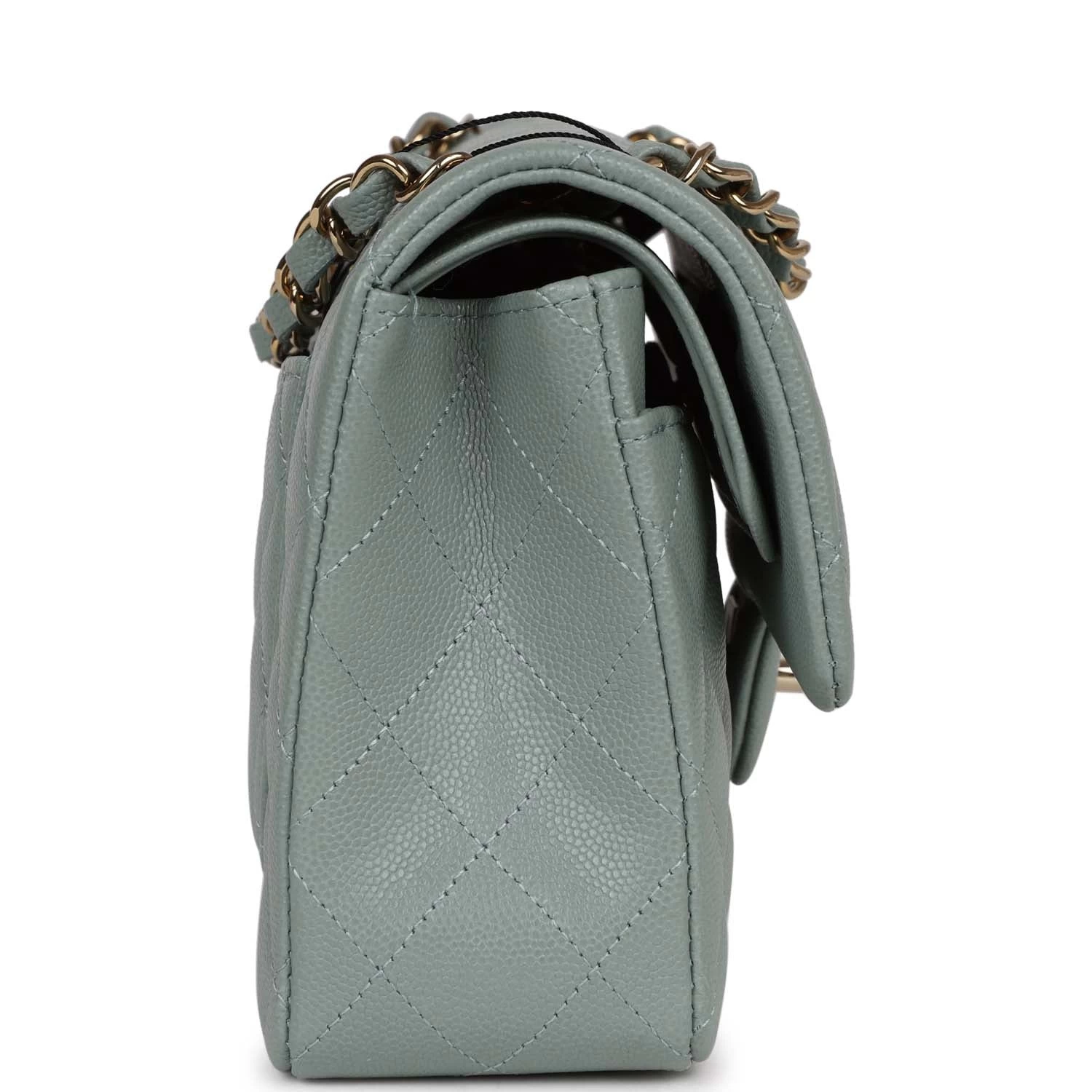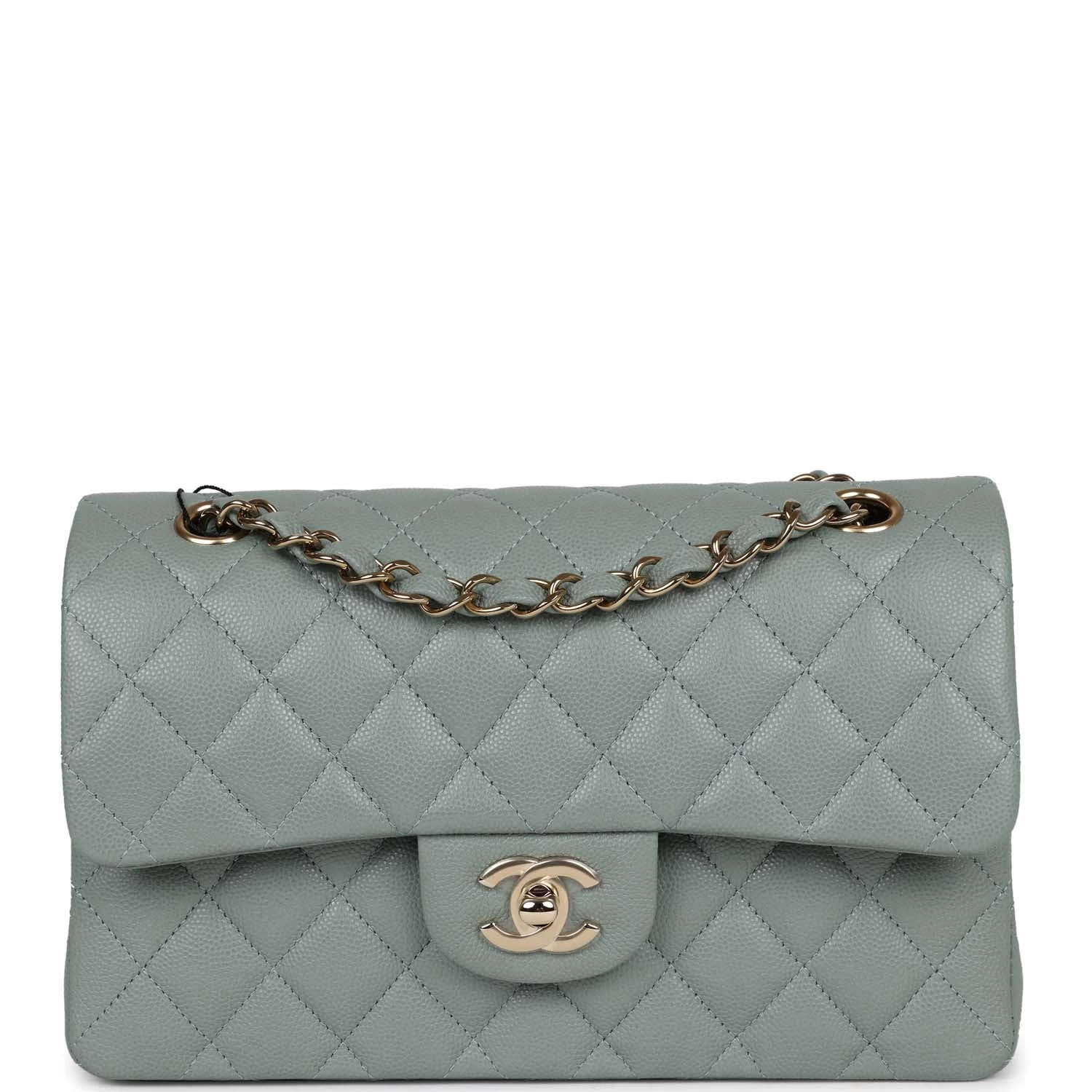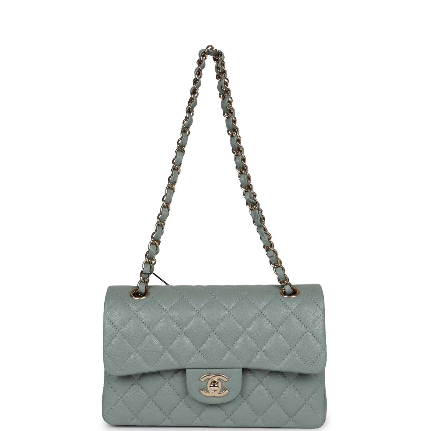 This Small Classic Double Flap bag is in blue caviar leather with light gold tone hardware and features a front flap with signature CC turnlock closure, half moon back pocket, and adjustable interwoven light gold tone chain link and blue leather shoulder strap.